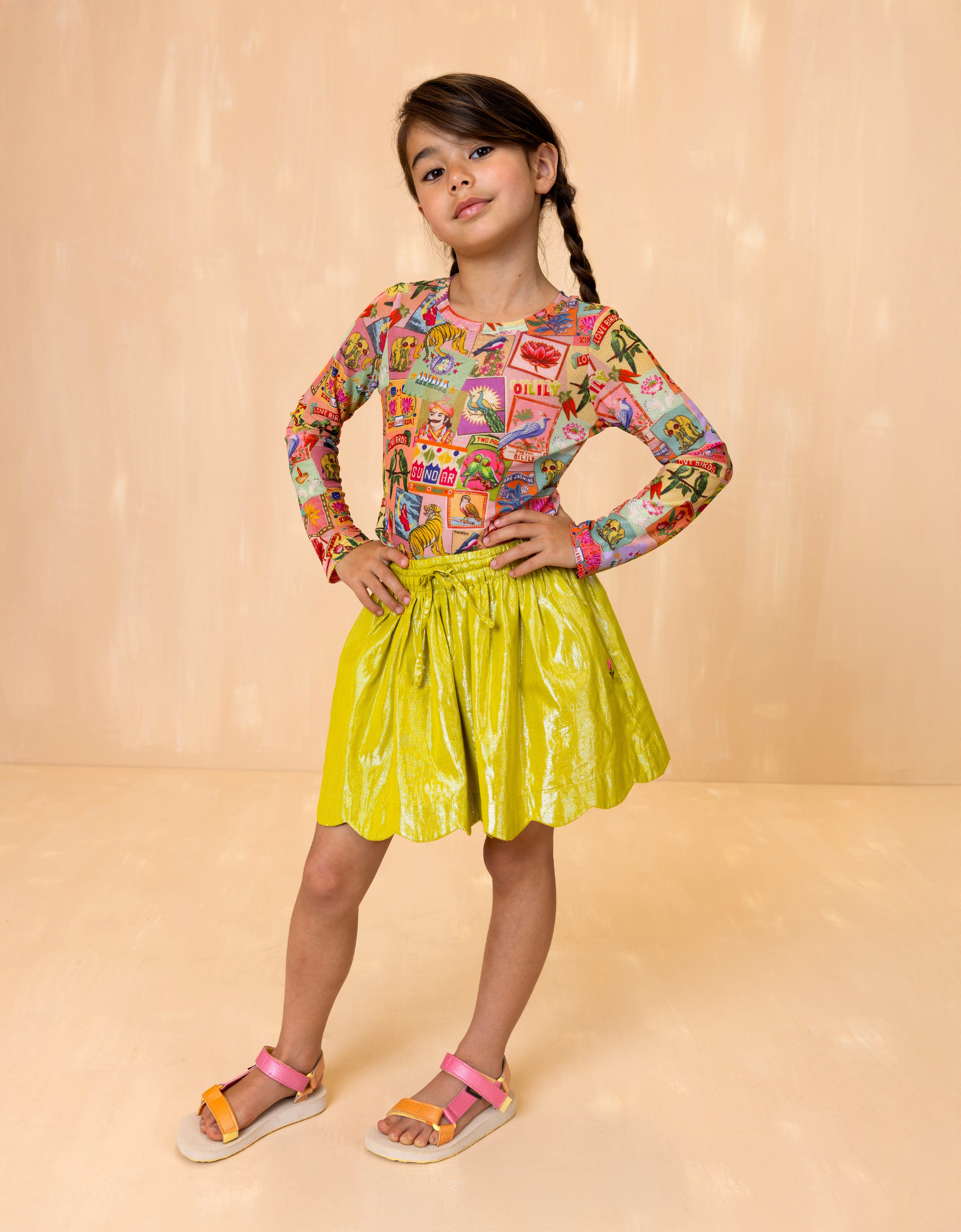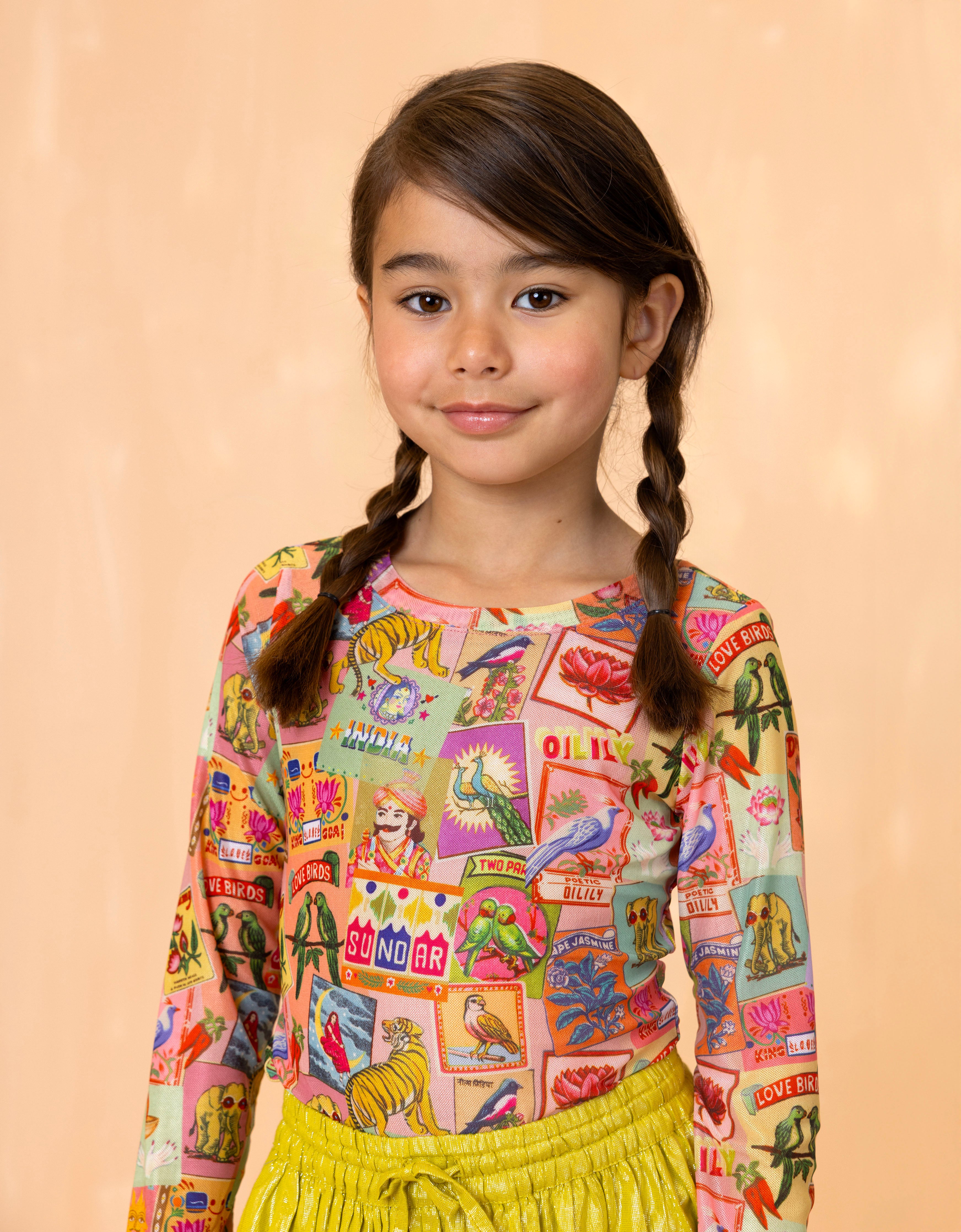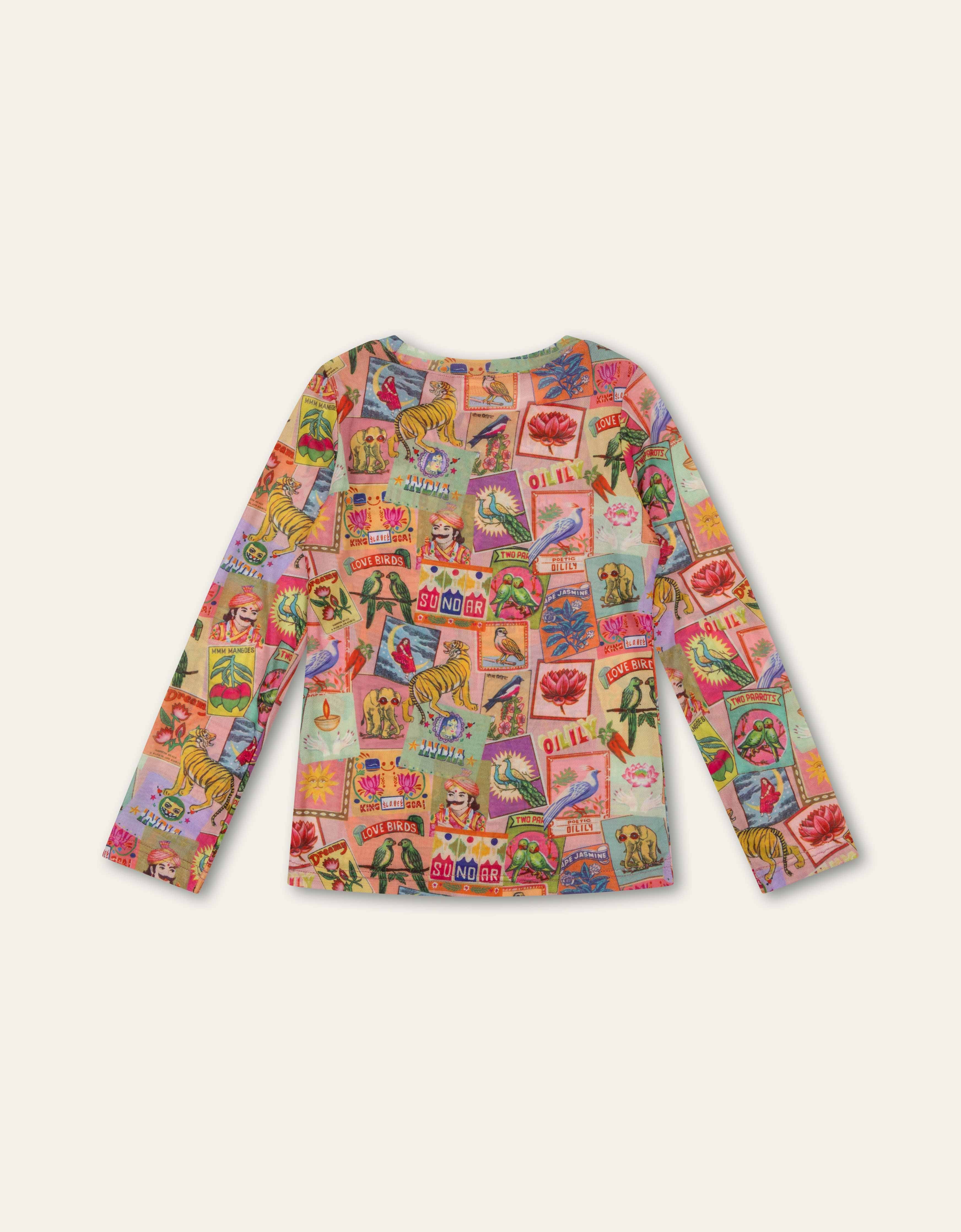 Mesh top with Flaming Symbols print, inspired by Indian matchboxes — small works of art full of colour and detail.