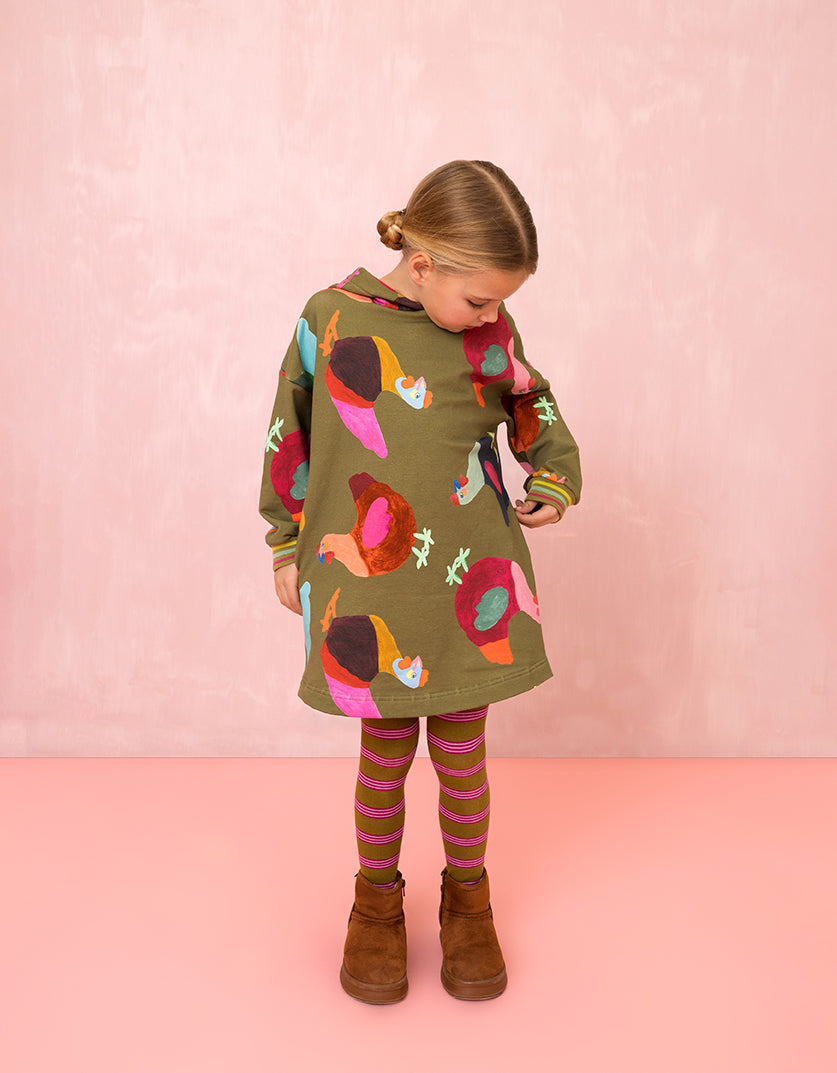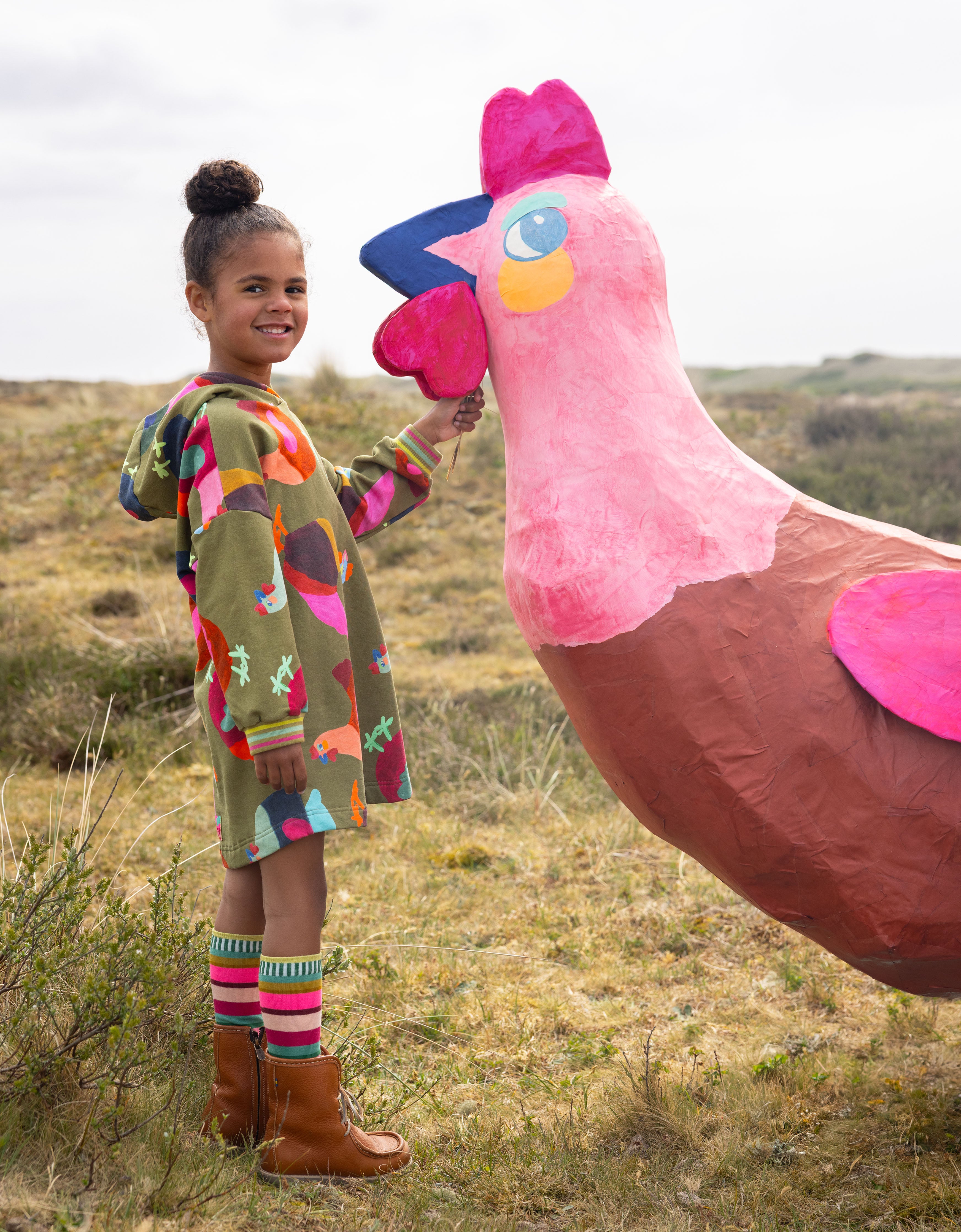 From paper-maché we made a giant chicken and this is how print Wingsy originated. Admire chick Wingsy in different colours on this fun dress.