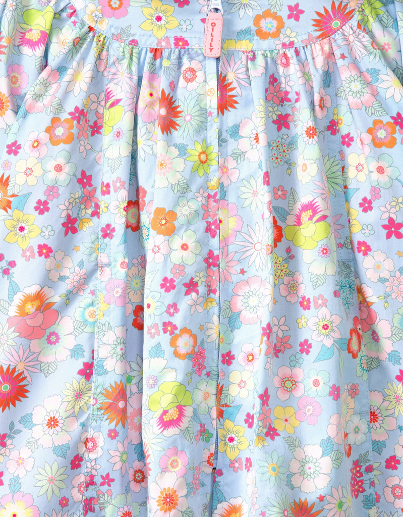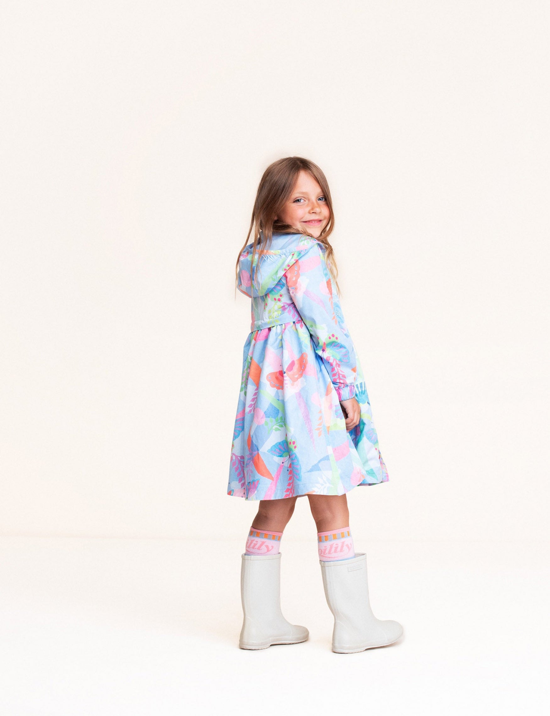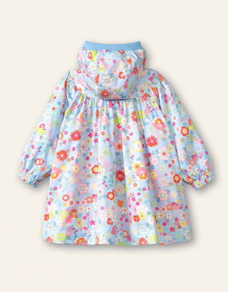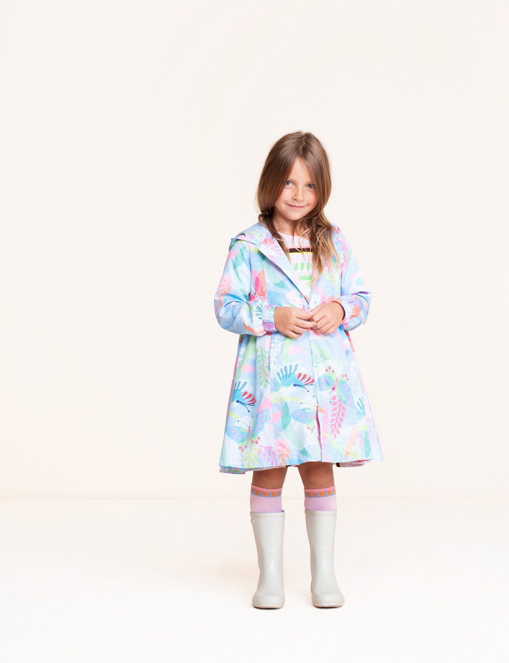 Where are you off to little lady? We know you want to go play outside in your favourite coat. Printed with pretty flowers, plants and butterflies on a light blue colour, and a handy hood, this coat is adorable. It's like your floating on along with the dragonflies.