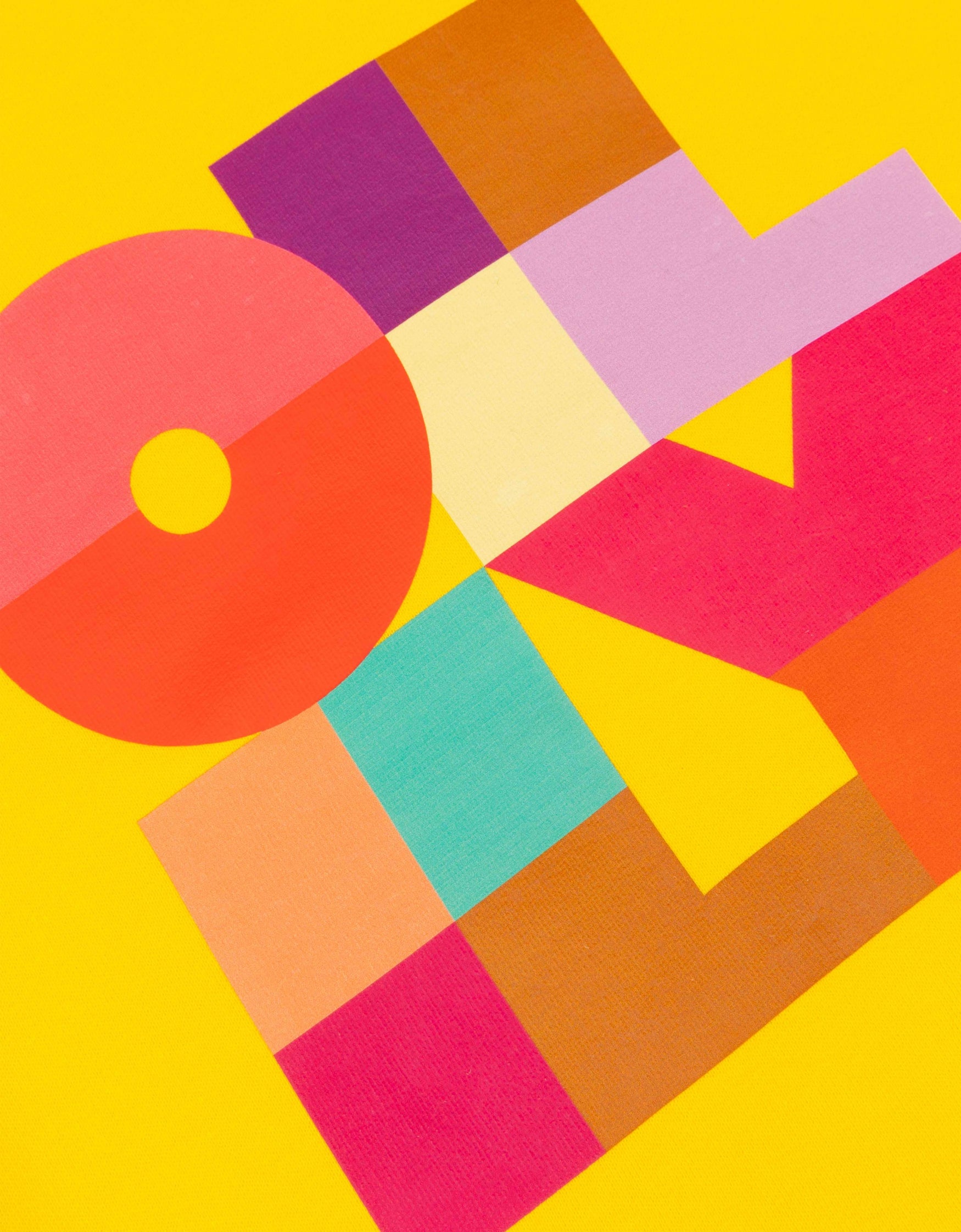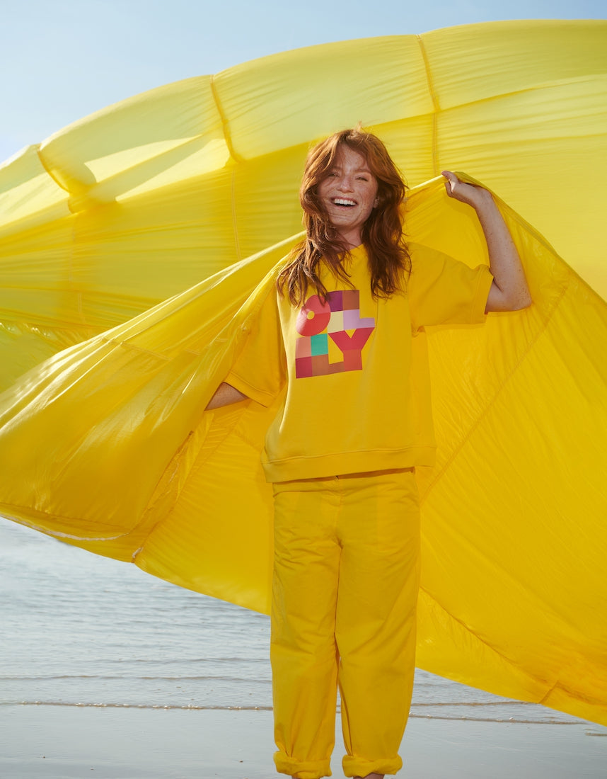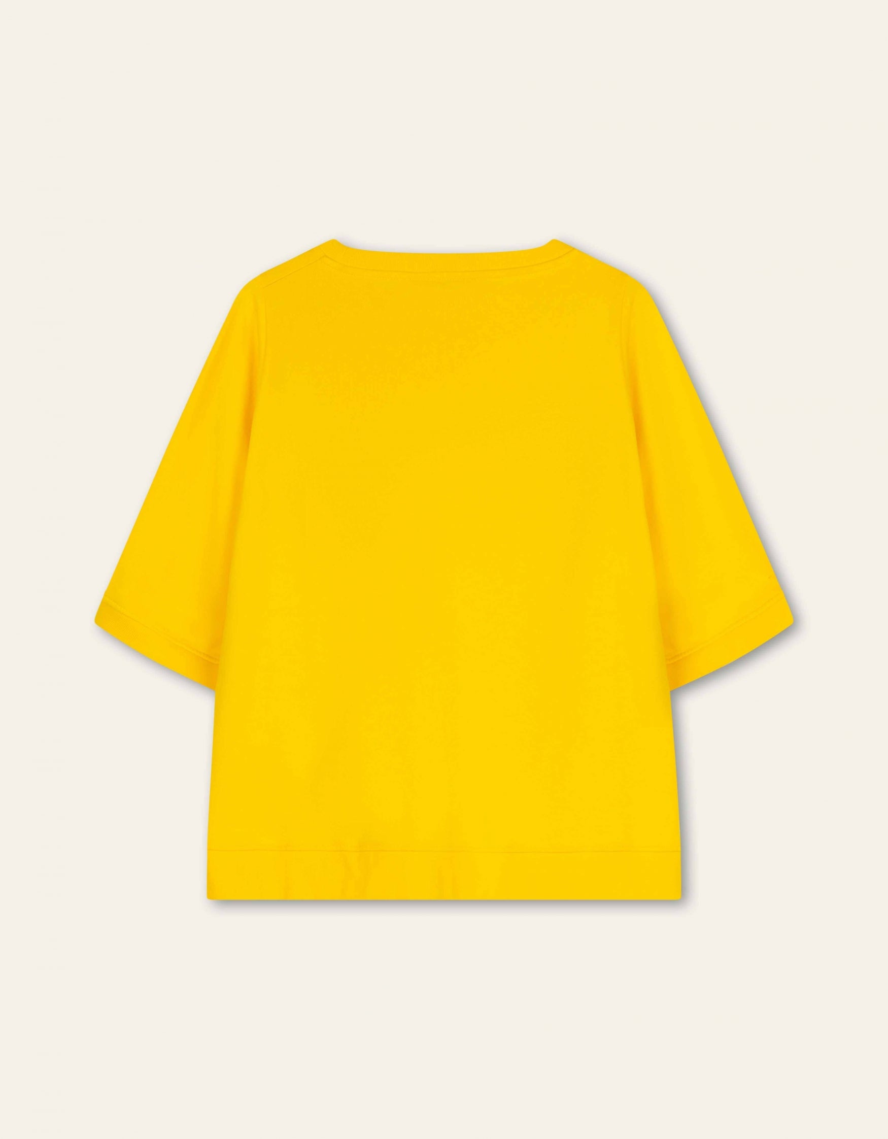 Meet Han. A lovely short sleeved sweater made from organic cotton and with a cheerful panelprint of our logo in a colourblock.