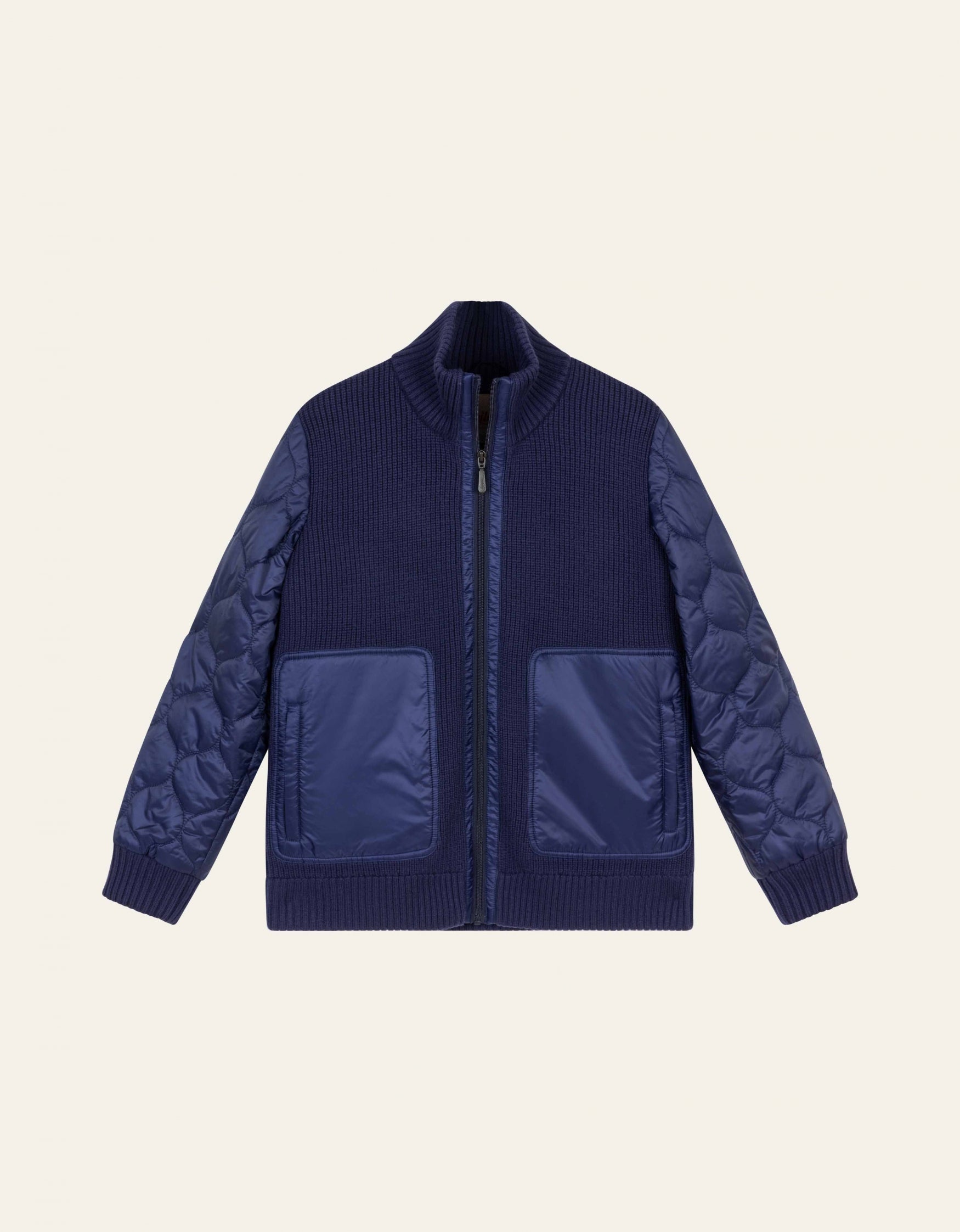 For depth, playfulness – and just because it works – this jacket combines wool with polyester. We play with different materials and motifs all in one colour. We like to call this a cardigan jacket as you can wear it in-and outdoors. On the sleeves, there's a playful embroidered badge.