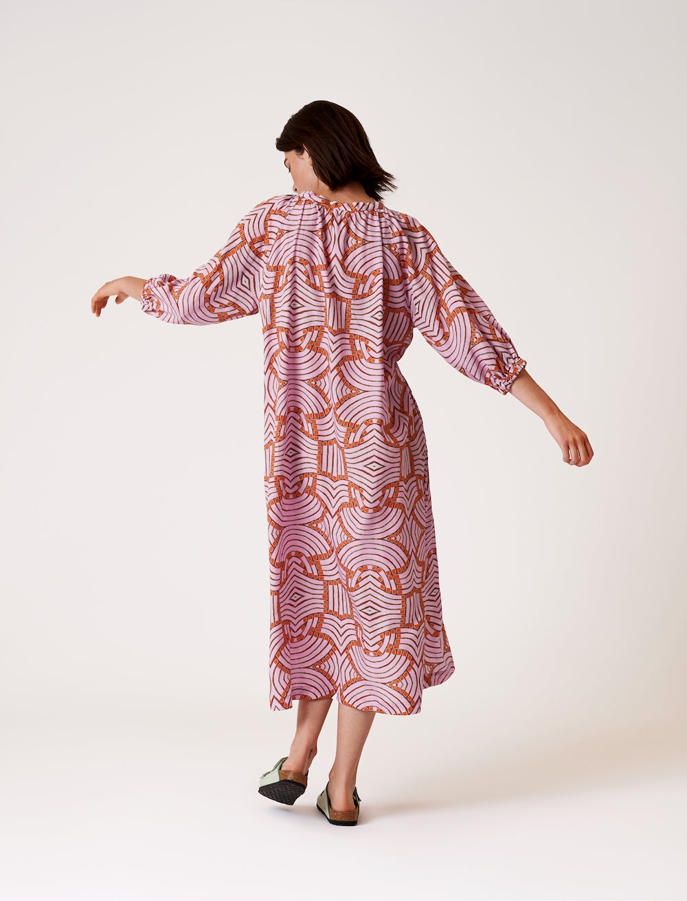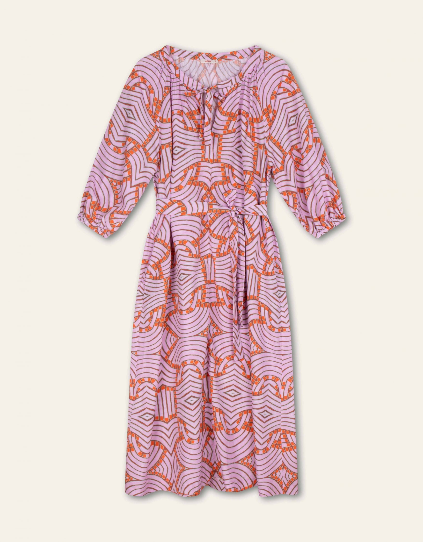 This print is elegant and reminding of art deco. It fits well with the dress with collar that you can tie as you like. This dress also has stretch in the cuffs and the belt can only be tied in the front so the back is loose and free flowing.