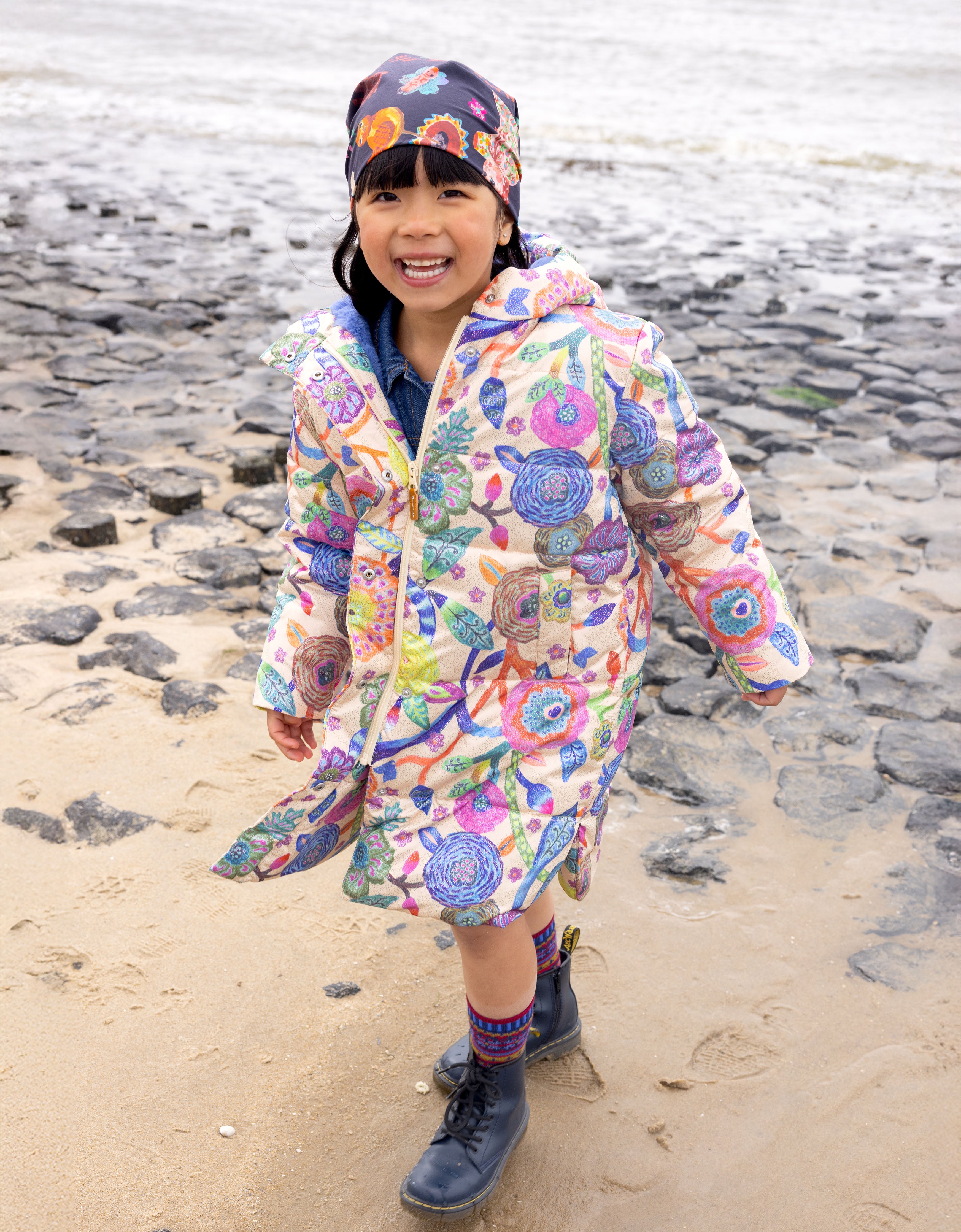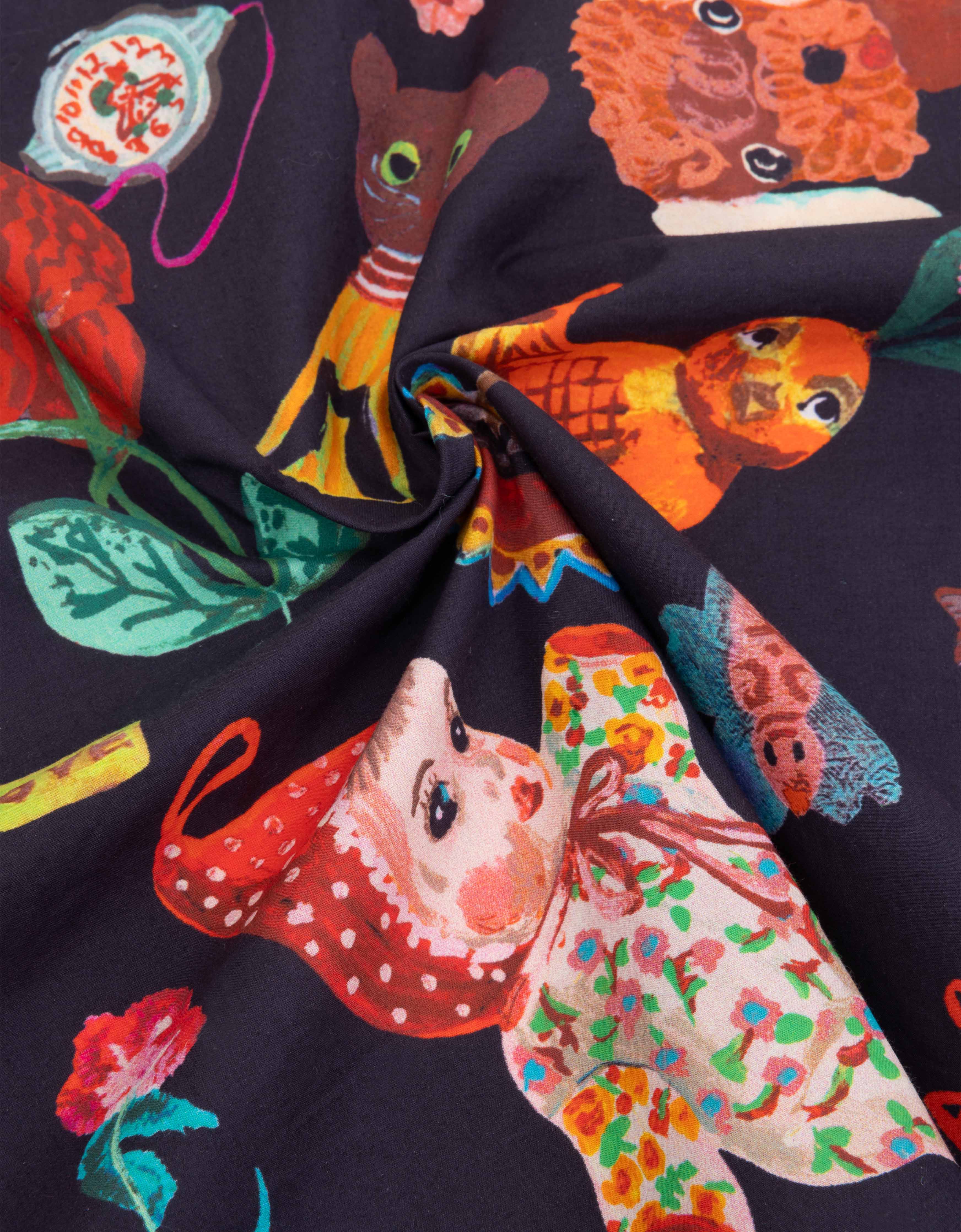 The artist Nathalie Lété created this playful print Surprise Balls for us that shows all the fun toys you might find in these plastic balls. Along the border of this cotton bandana a hand painted check.