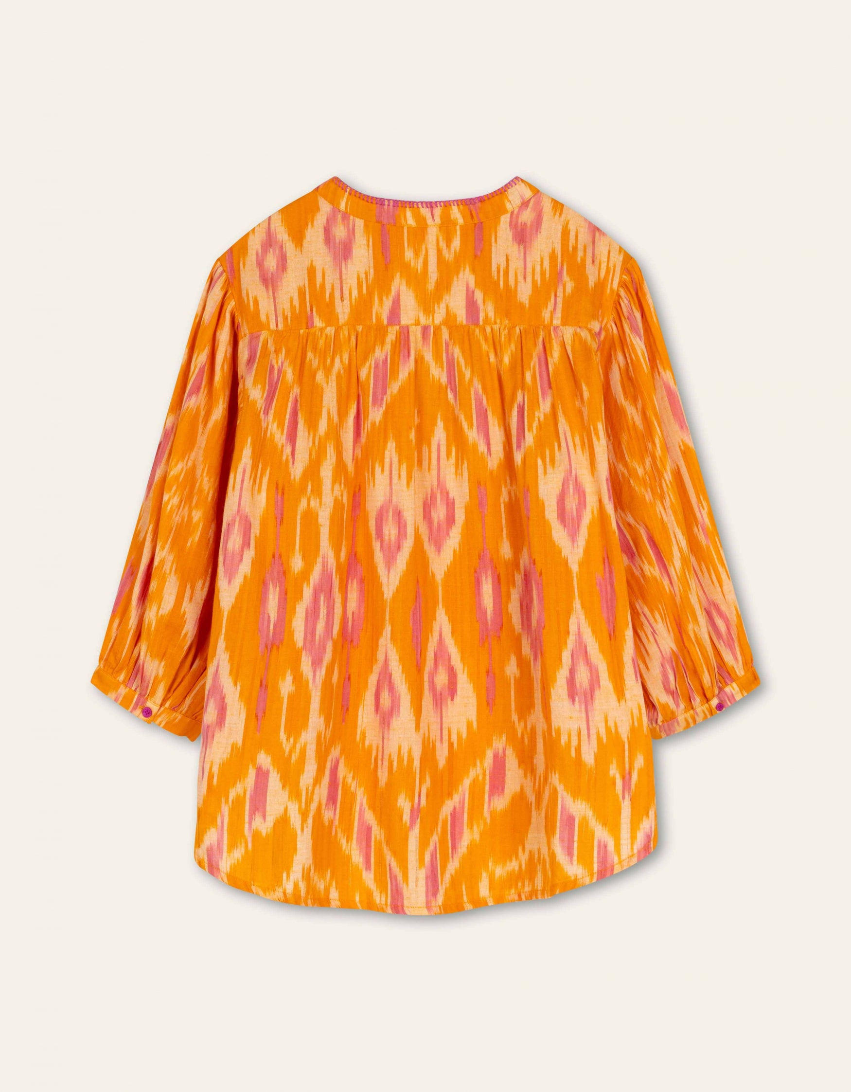 Sunny Ikat tunic blouse with blanket stitches along the buttons and collar – these are visible stitches for a cool, sporty touch.