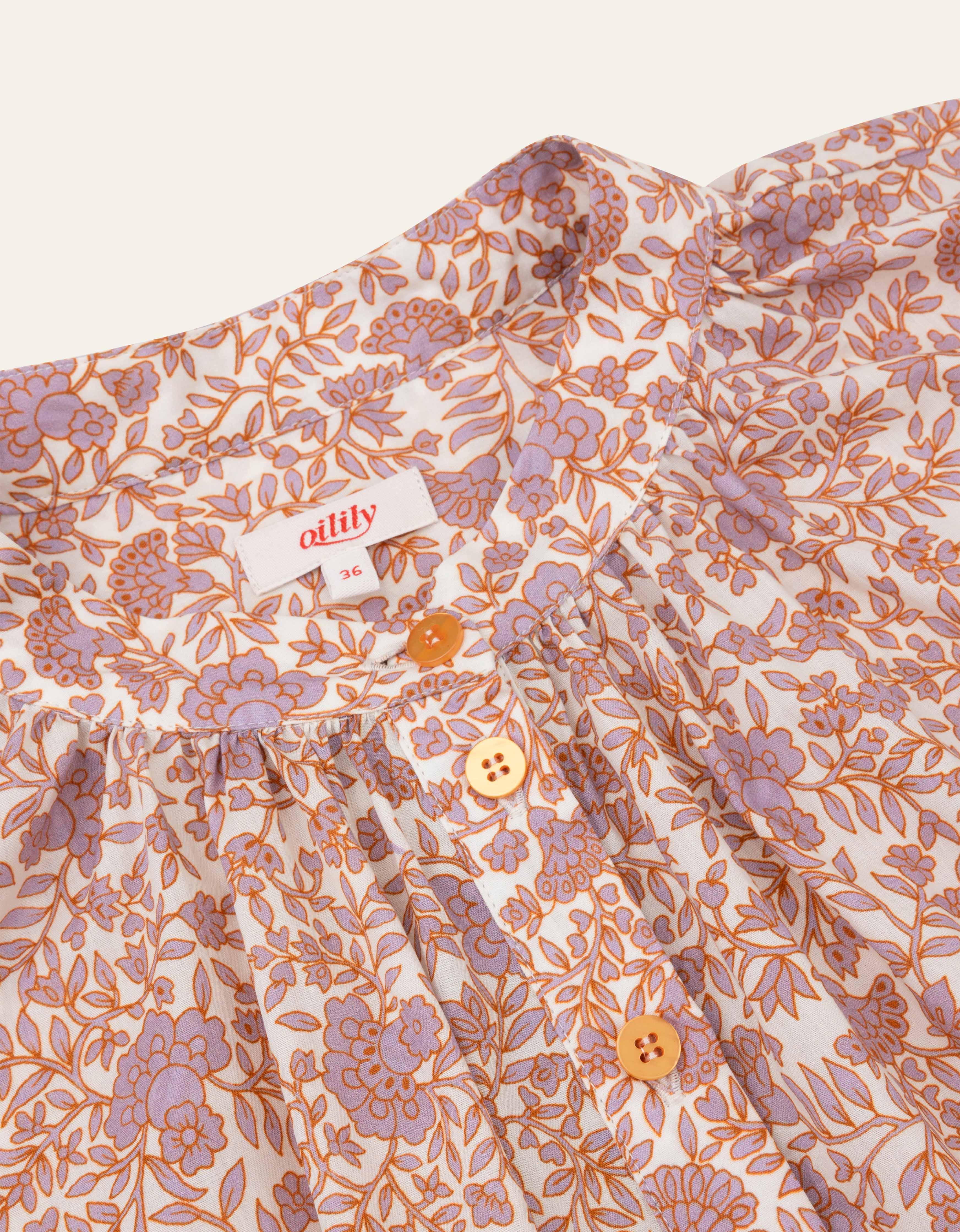 This delightful breezy farmer's blouse in floral print Mientje has wide sleeves and flexible cuffs. The playful pleat on the sleeve and the added button and epaulette-loop give you the option to play with the length and volume of the sleeves. The flat collar has Mother of Pearl buttons that go till halfway.