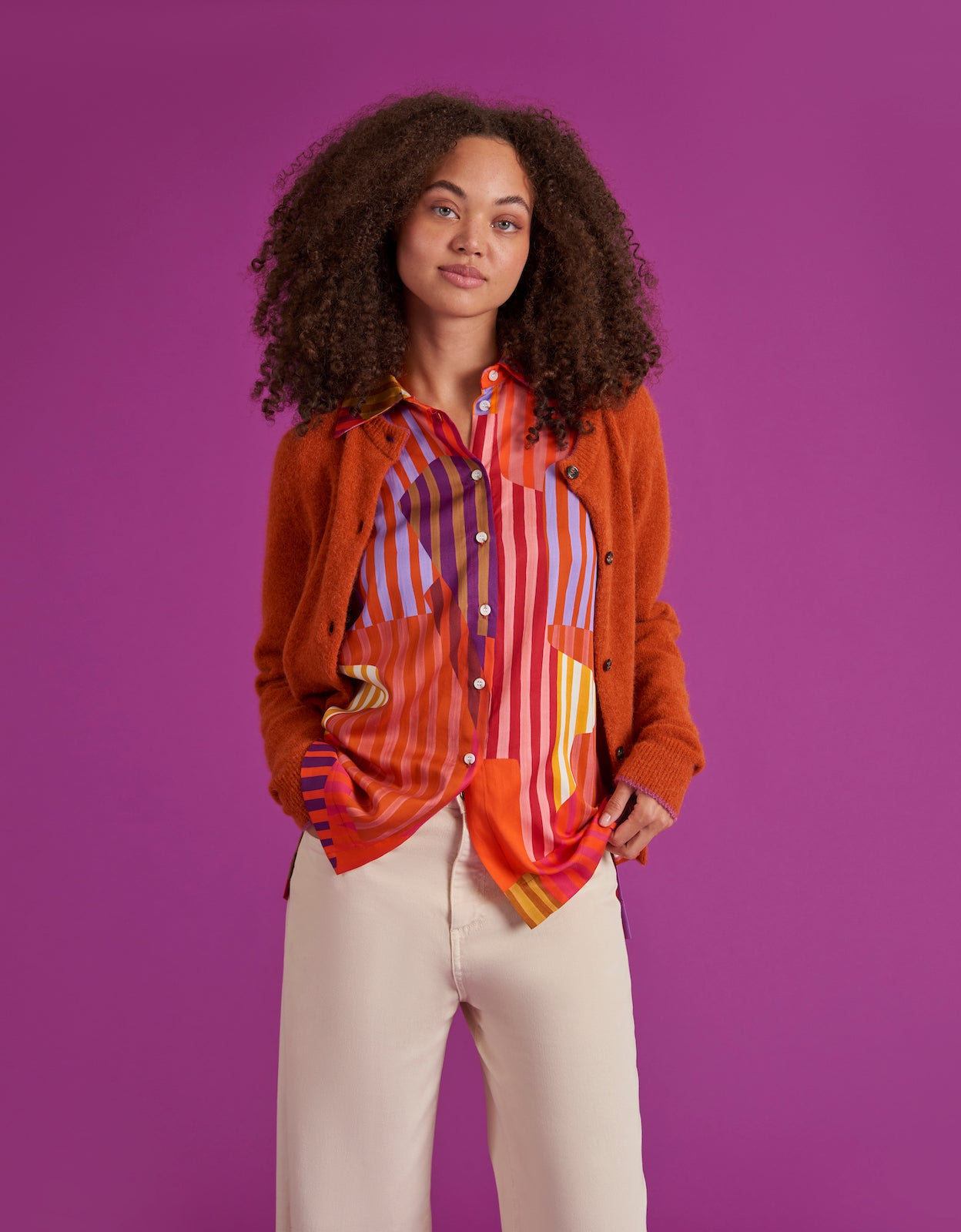 We call this print Stripes love Blocks and it shows, the blocks are filled in with colourful stripes on this lovely, flowy blouse. The sleeves have long cuffs and a single button.
