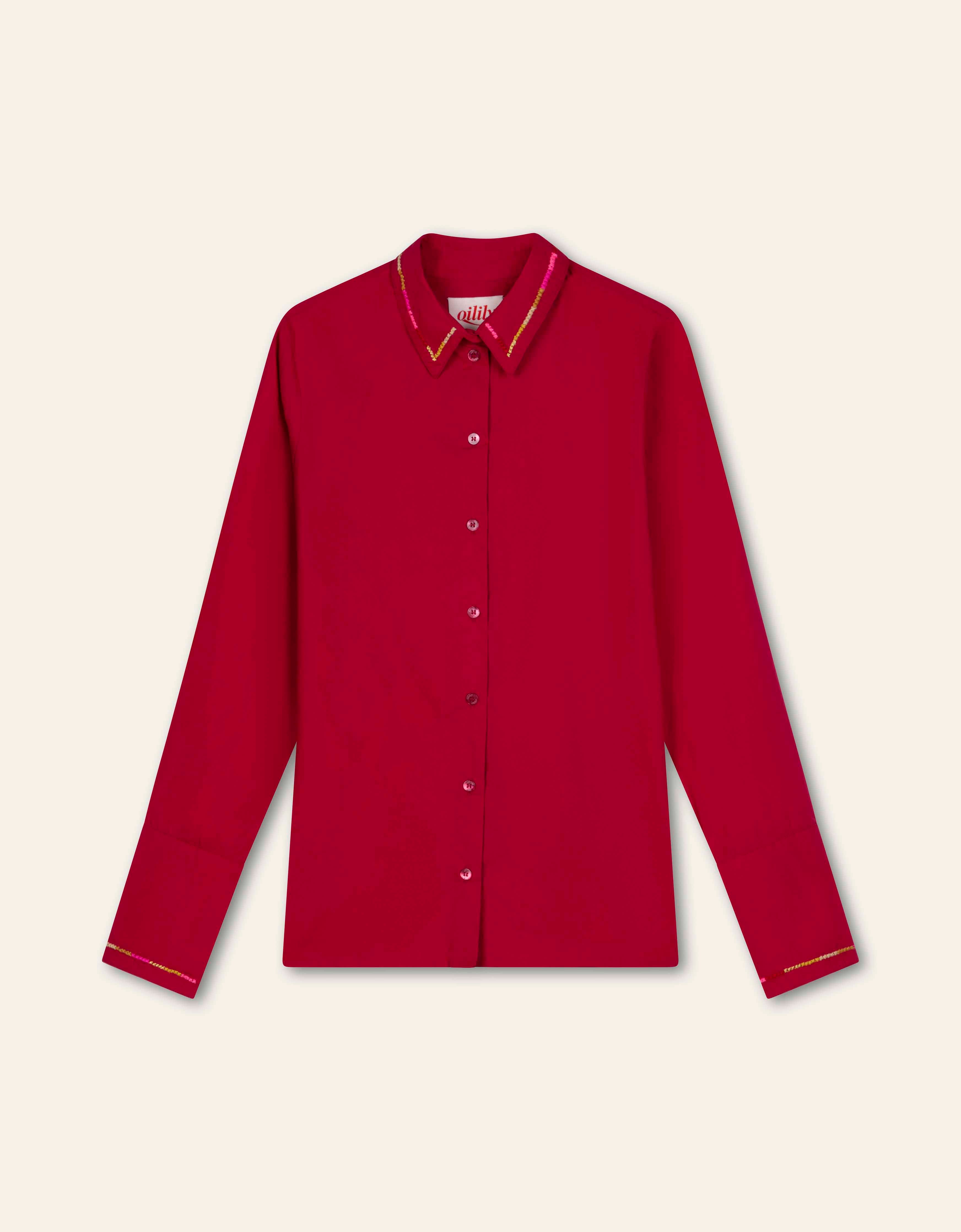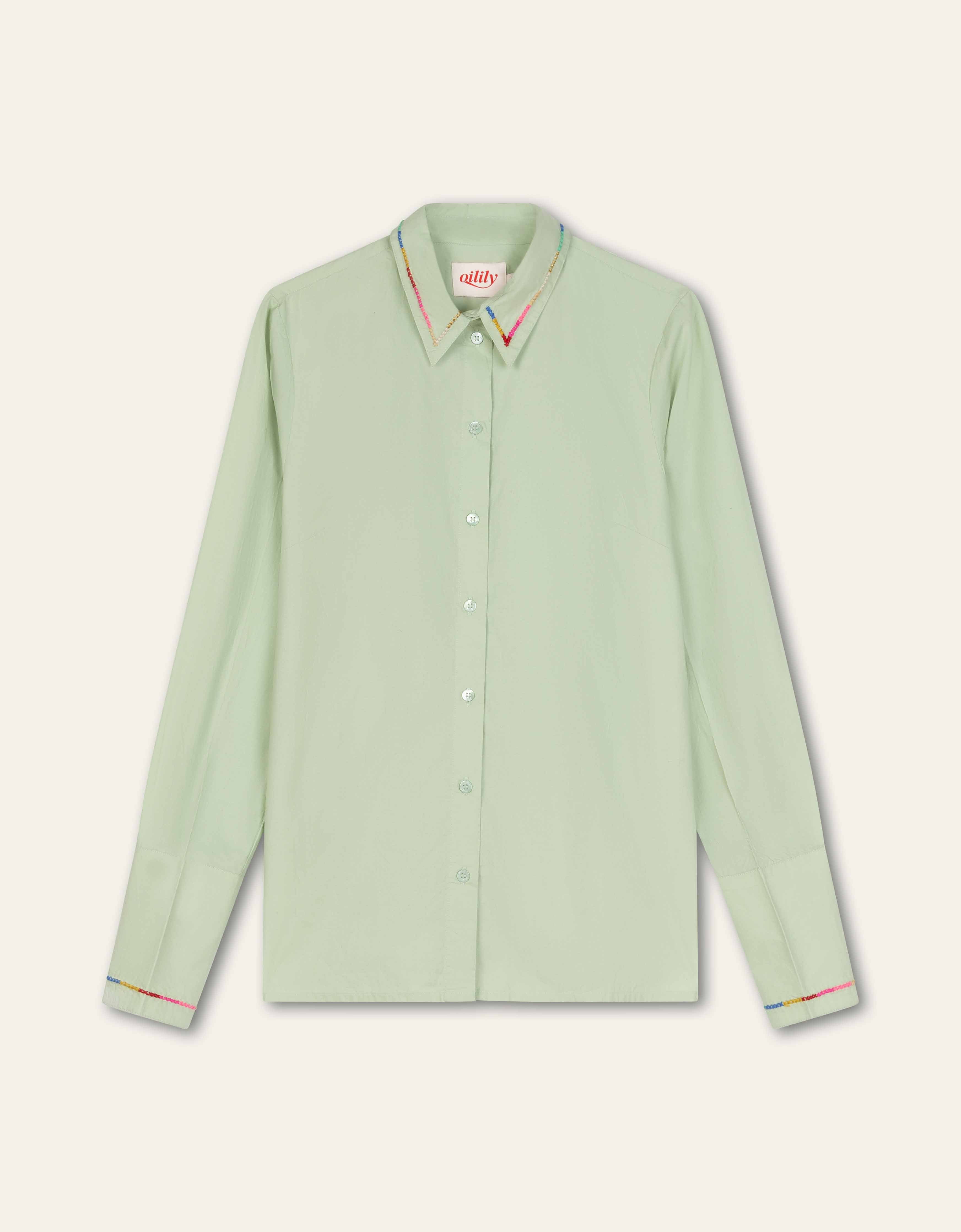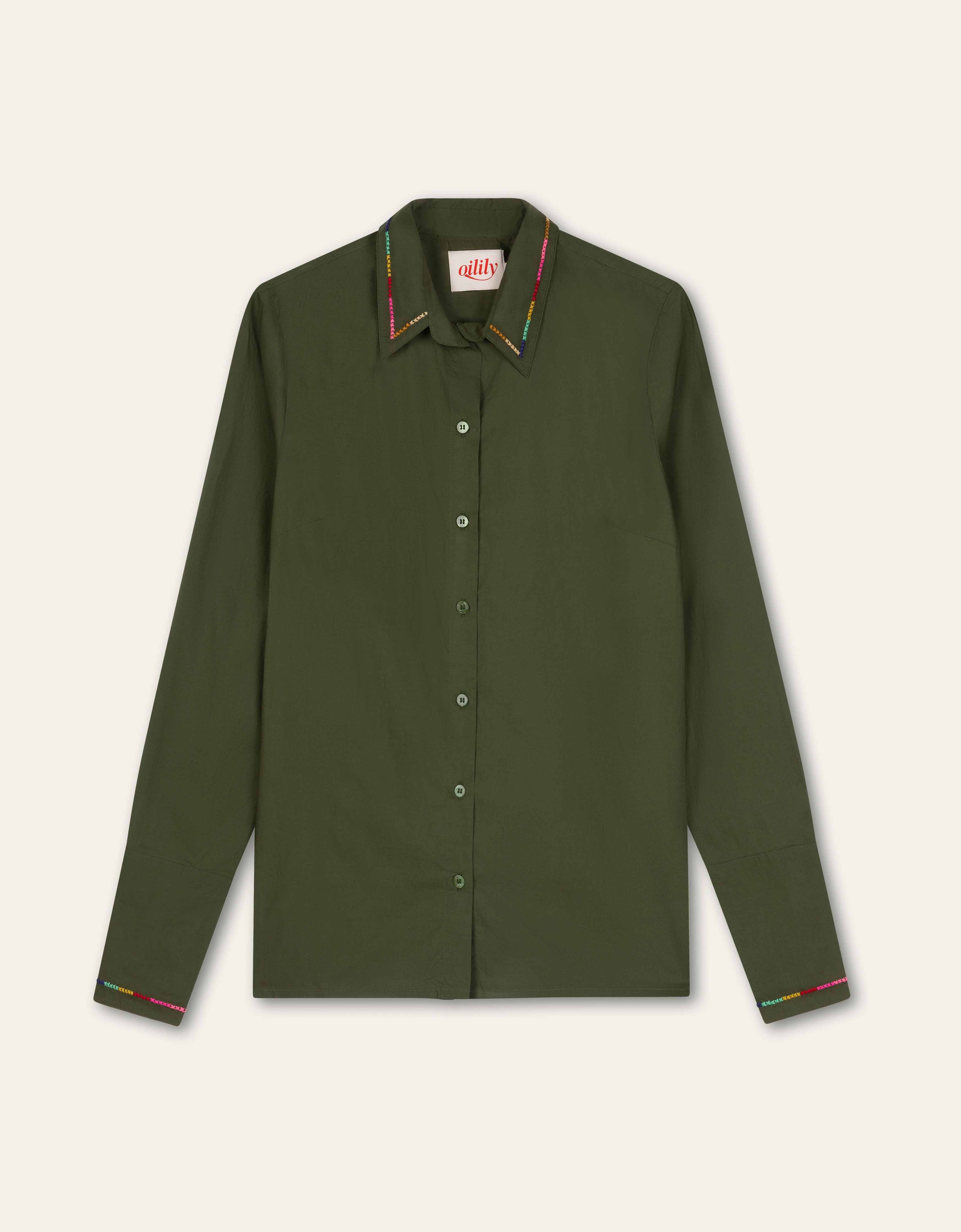 Rifle Green is the name of the warm colour of this fitted blouse. You'll find gorgeous embroidered details on the pointy collar and the long cuffs have small splits.