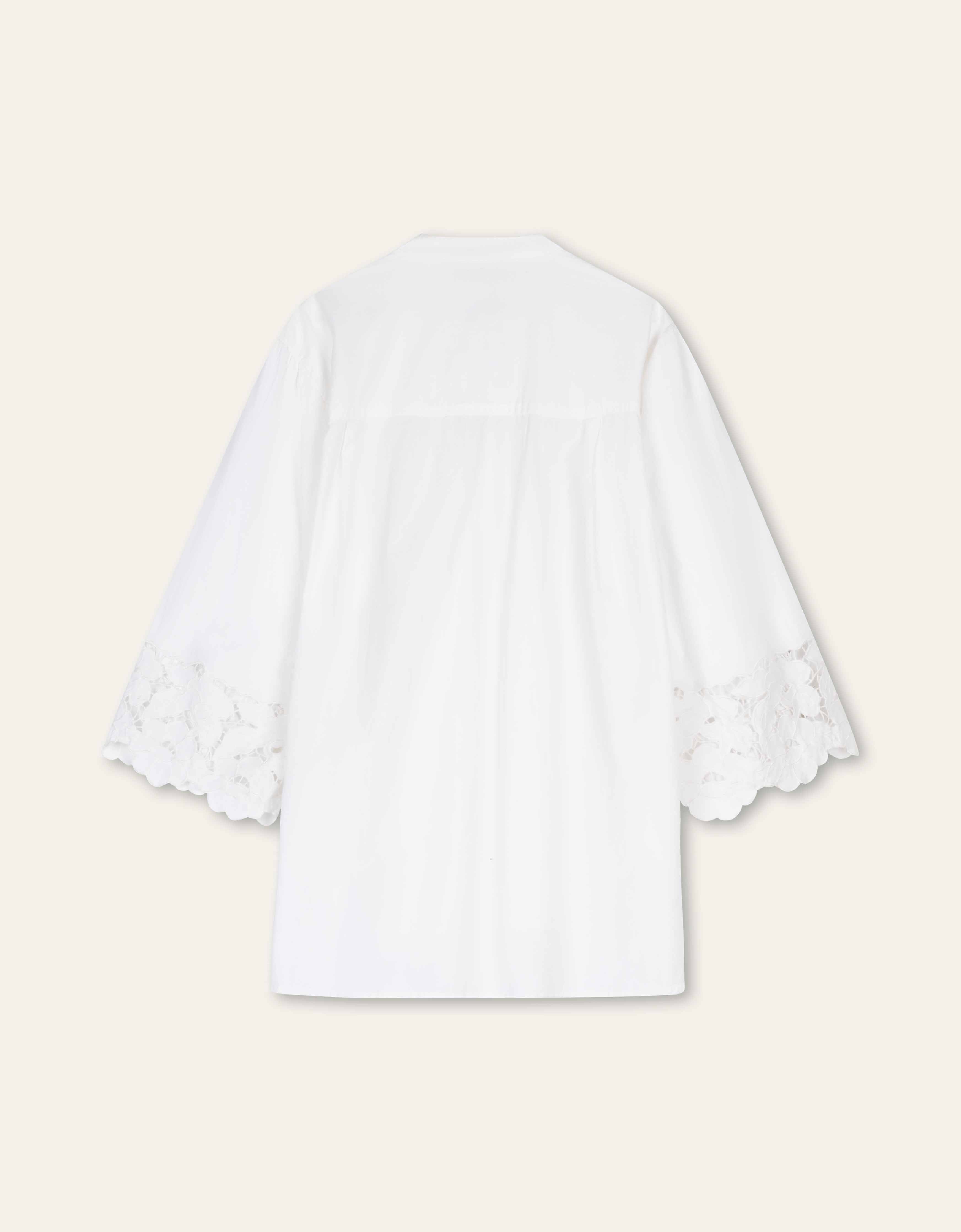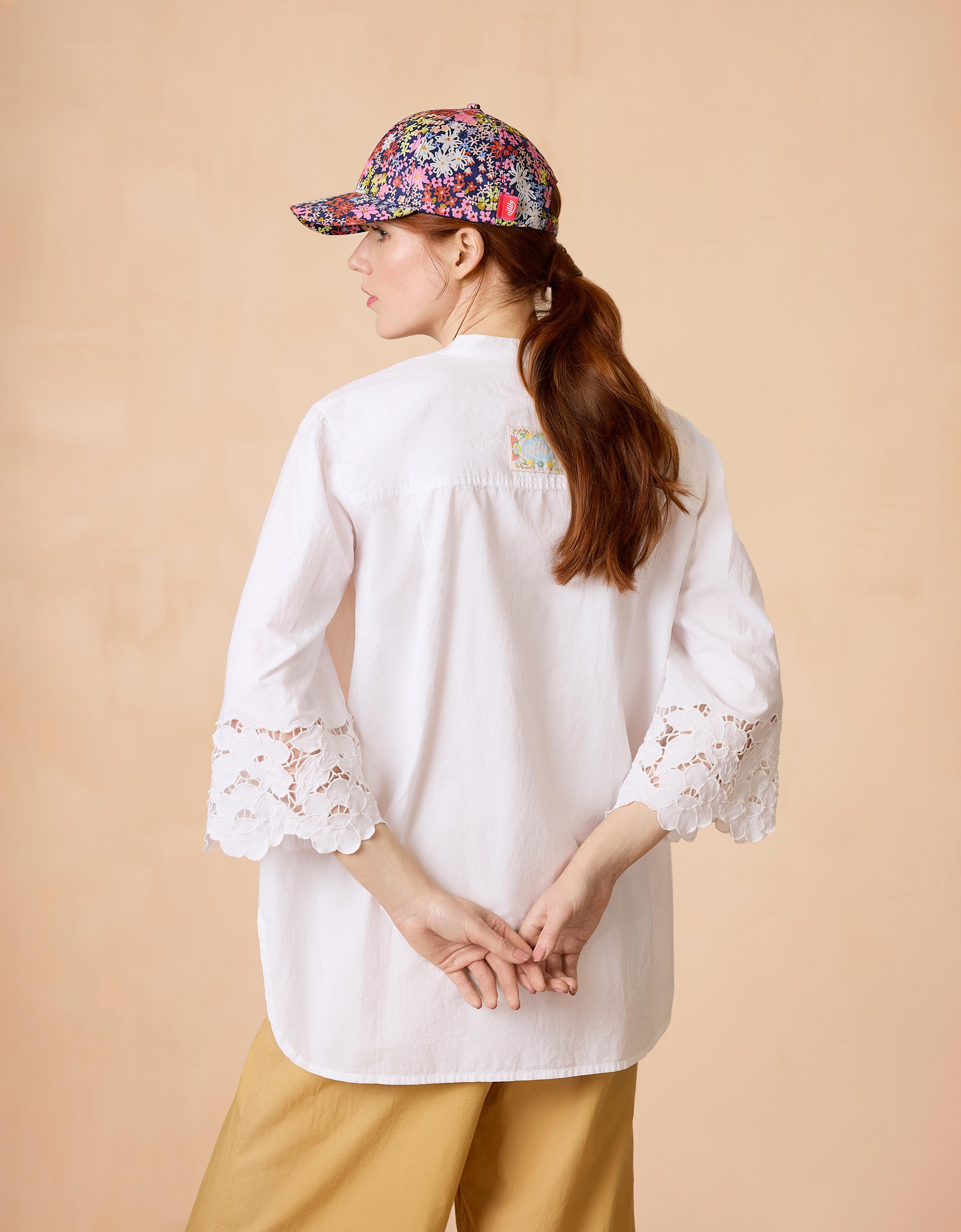 This is a very playful blouse with broderie anglaise detailing and partly open-structured flowers on the 7/8 sleeves and cuffs. With Mother of Pearl buttons and a slightly longer back. Beautiful, frivolous and very summer-ready.