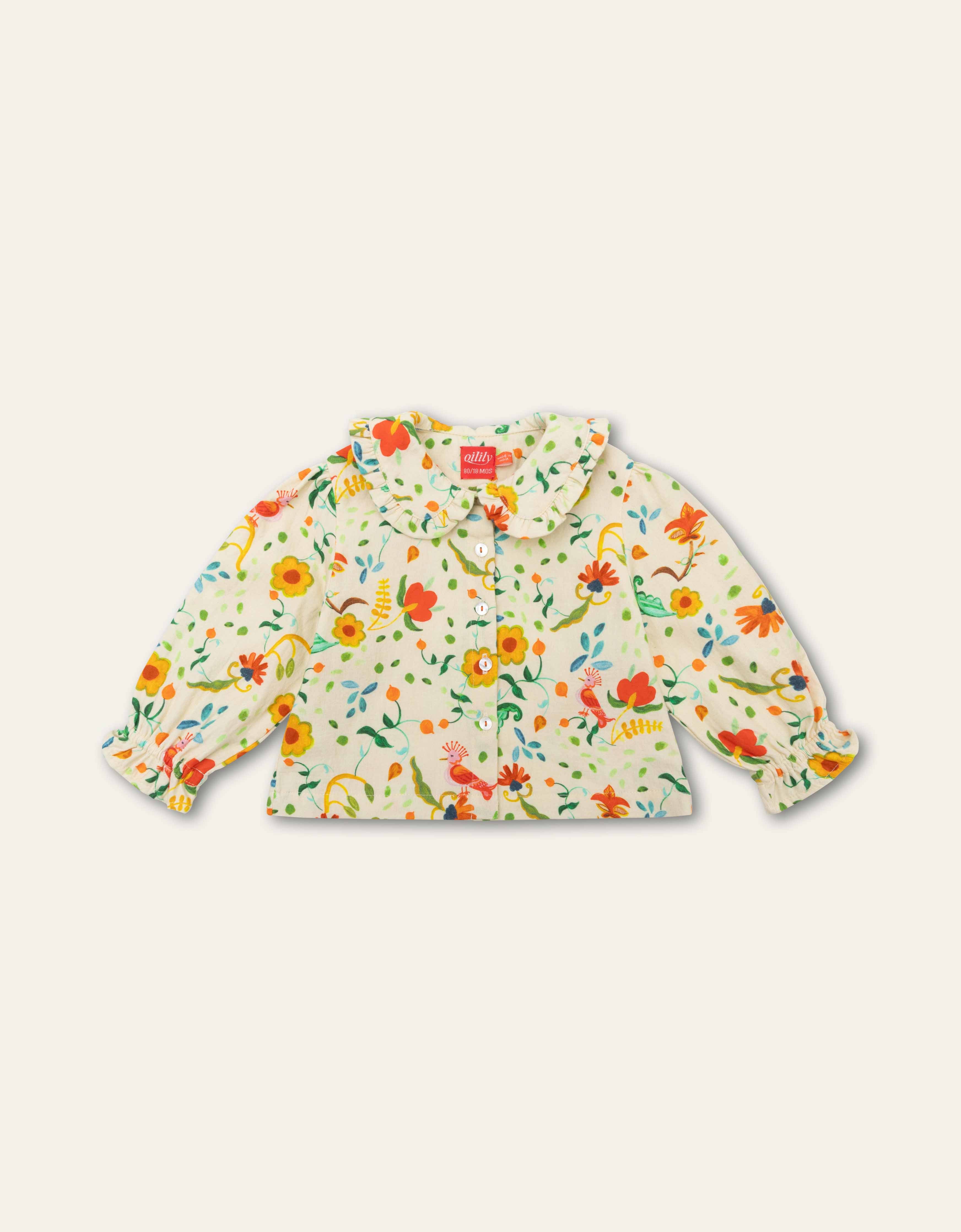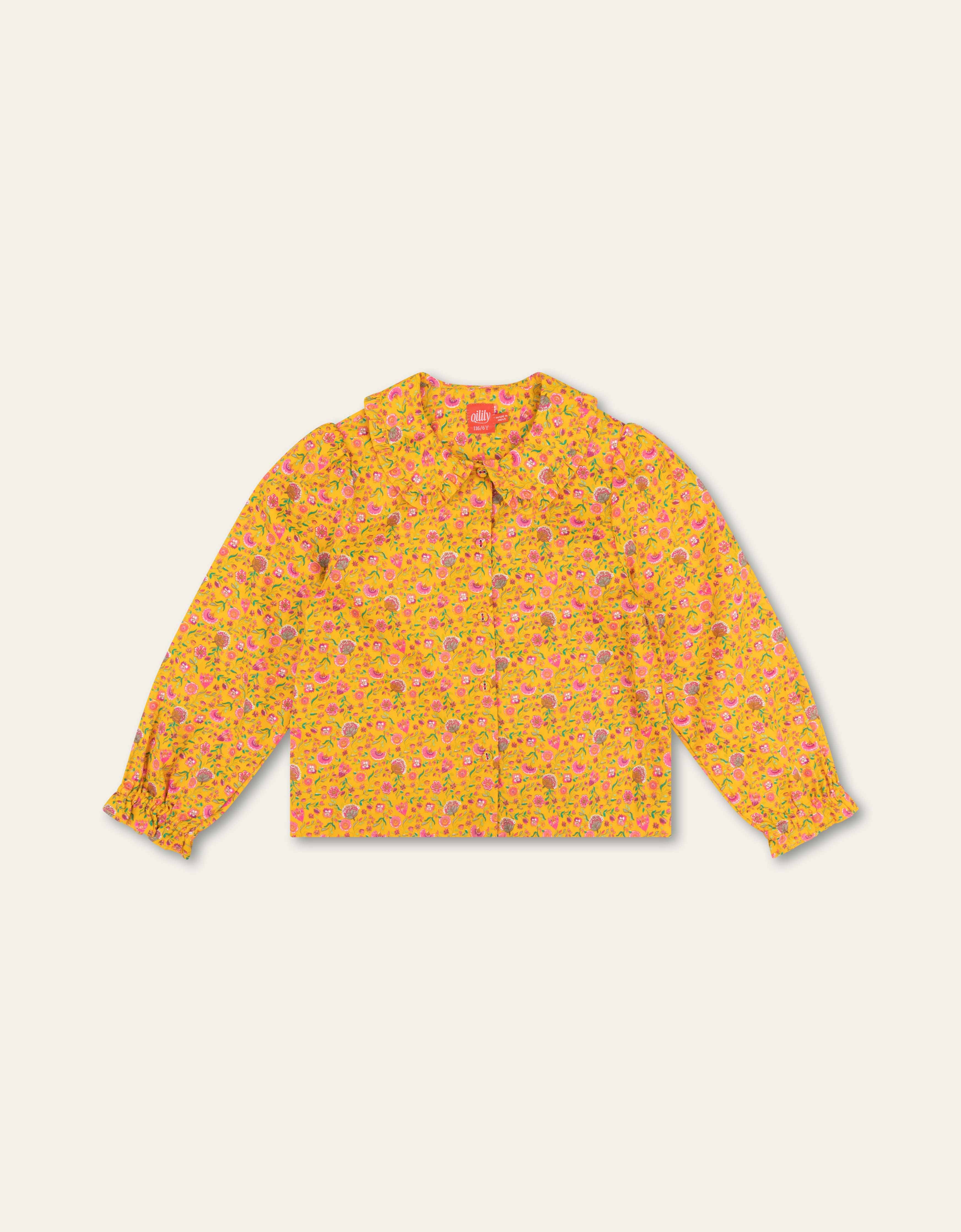 The colours of the Lily print are printed with cylinders. With this technique the colours differ in brightness and in placement. This gives this cotton blouse some playful depth.