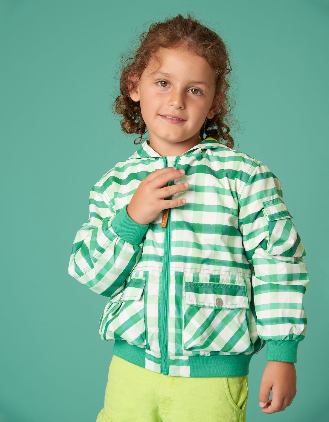 Cool hooded jacket for spring. The checks go in all cheerful directions, this is no ordinary Gingham. On the front we added flap pockets with pressed buttons because you never know what treasures you'll find in your neighbourhood.
