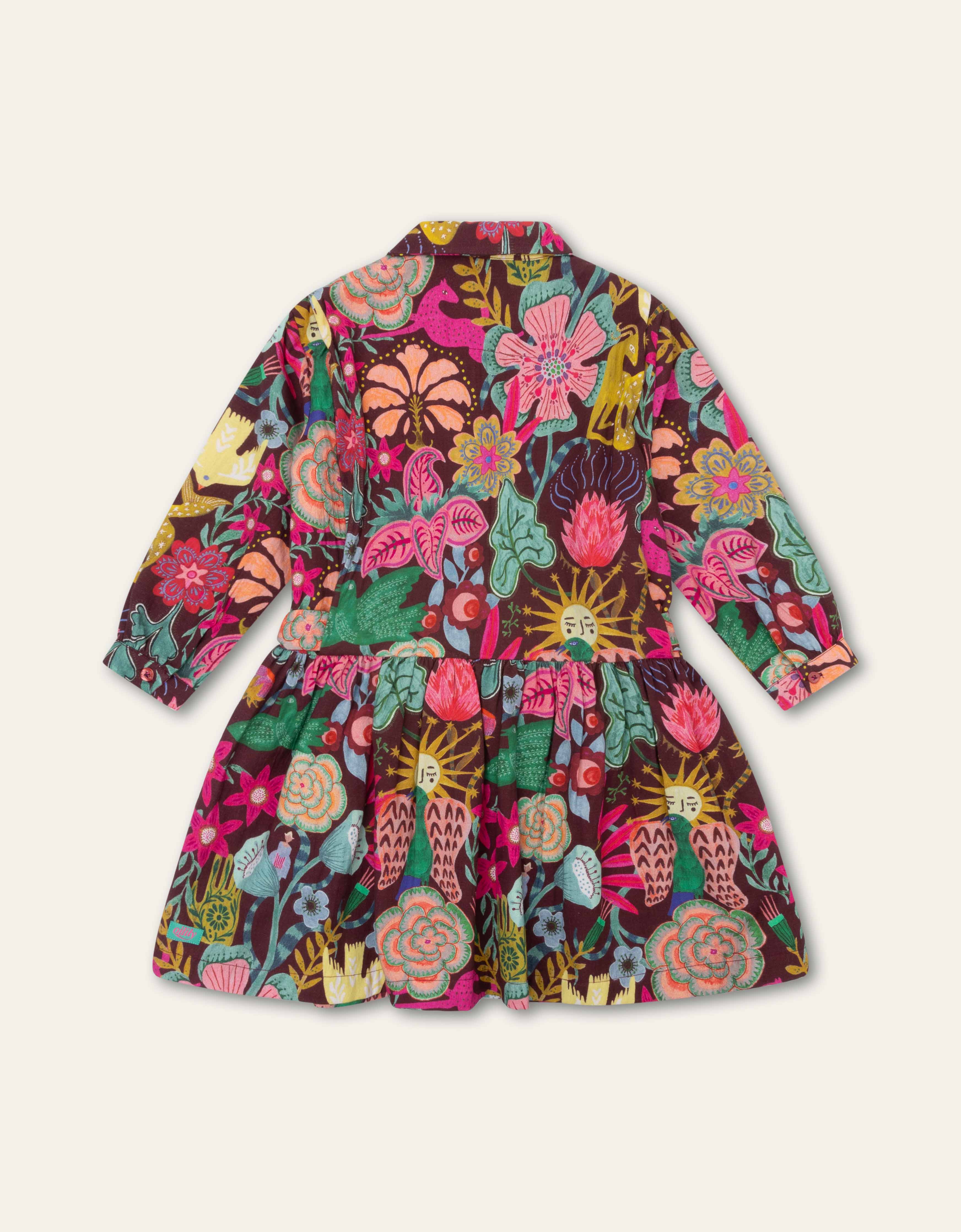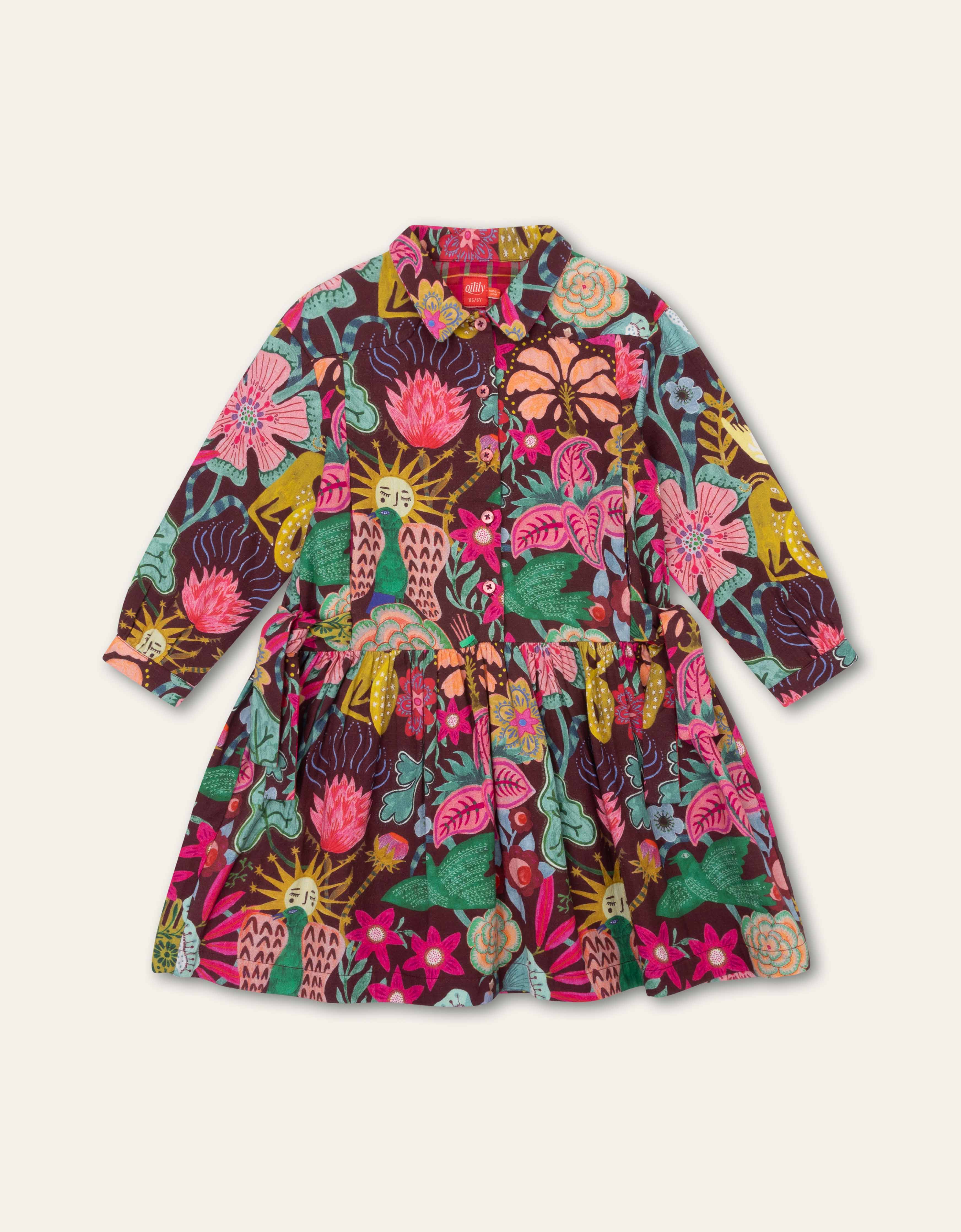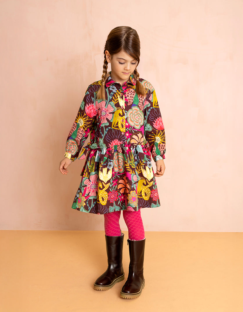 Print Schokland Treasures is a floral design of Scottish flowers and it looks wonderful on this remake of an archival Oilily dress. The boxy fit of the dress can be changed with the bows in the sides. Fun detail: the back of the ribbons have a tartan and the buttons are fabric-covered.