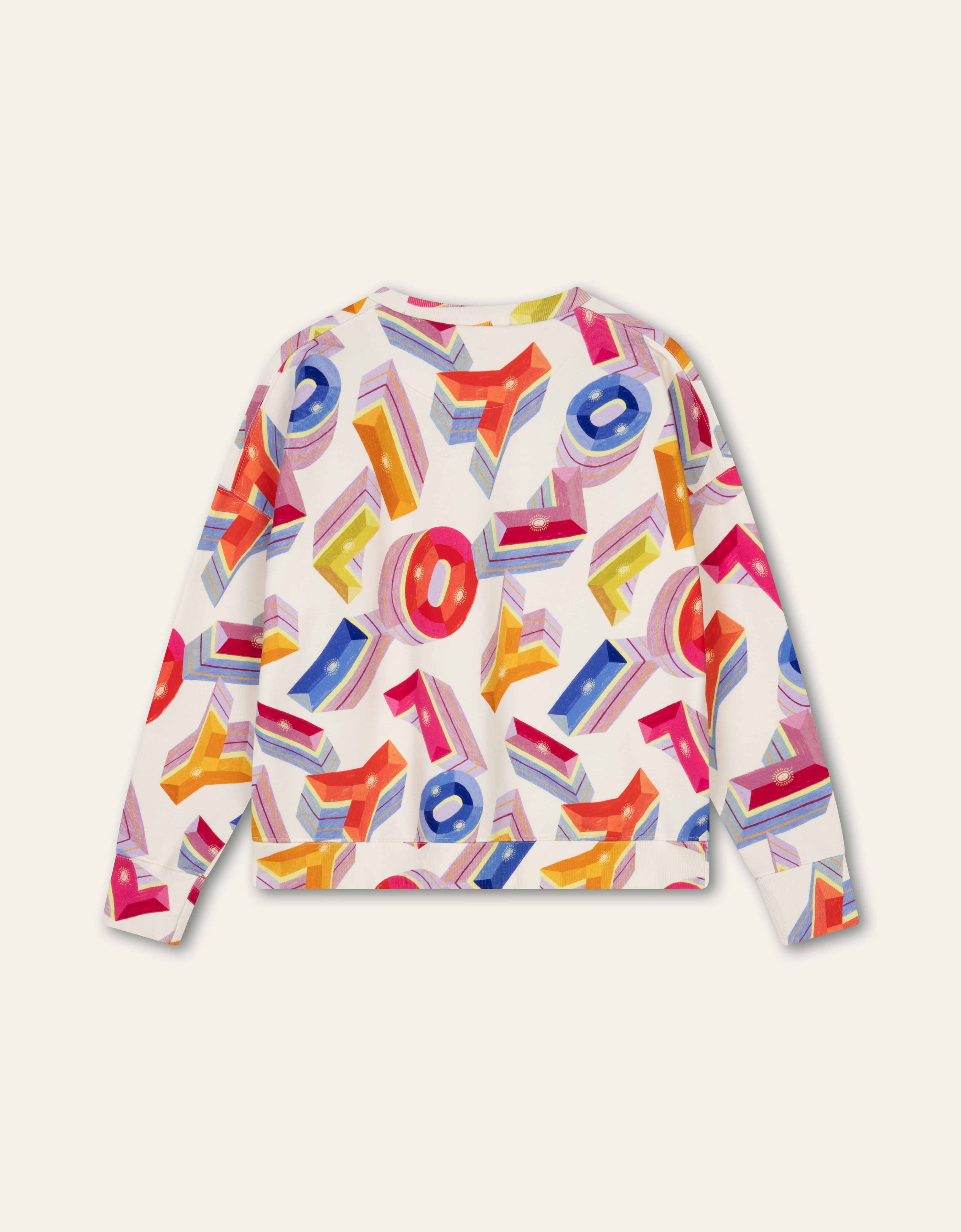 Sweater with hand-drawn letters inspired by Indian fruit trucks.