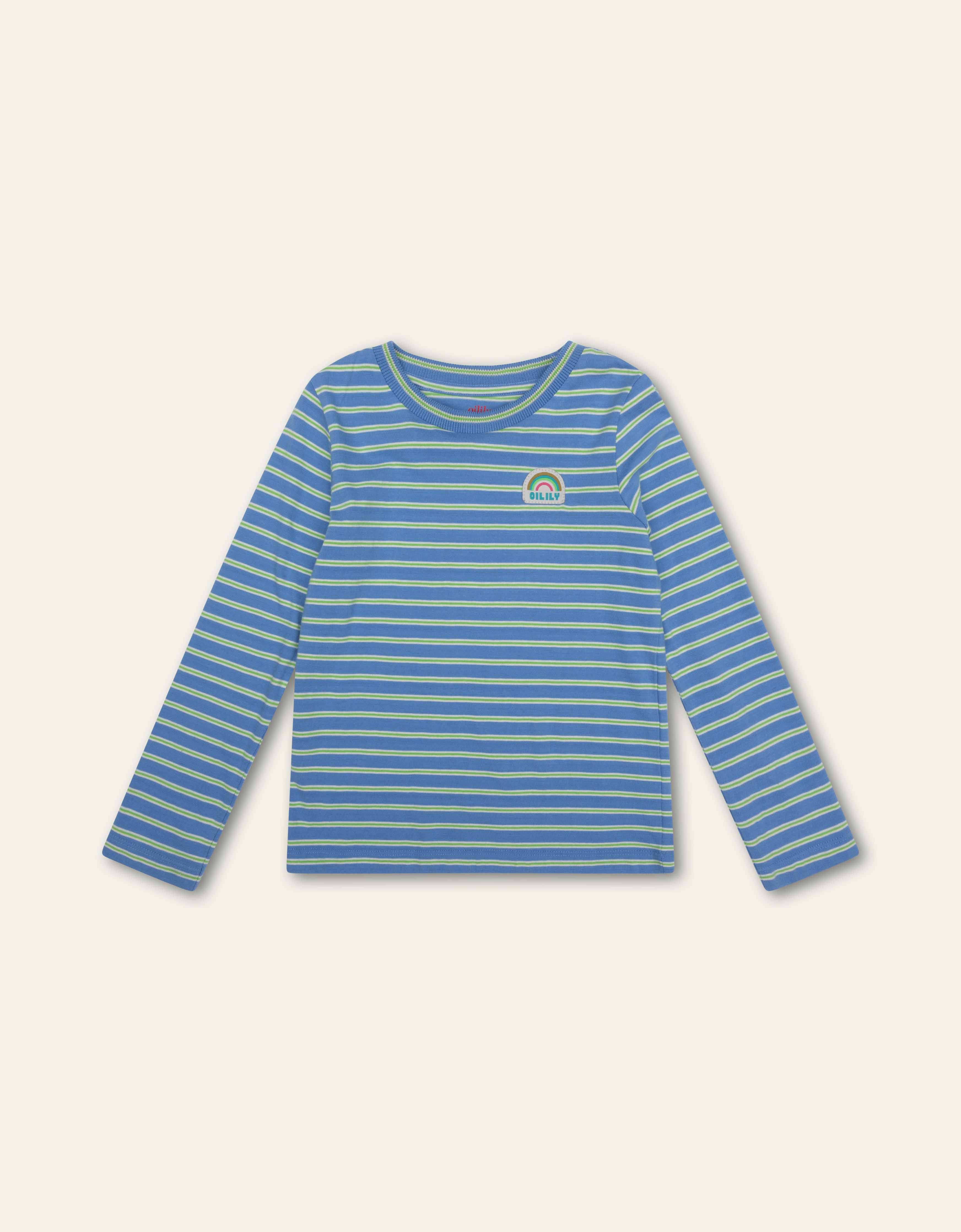 Yarn-dyed long sleeve unisex shirt with thin and thick stripes that flow nicely. The cute rainbow artwork is a treat.