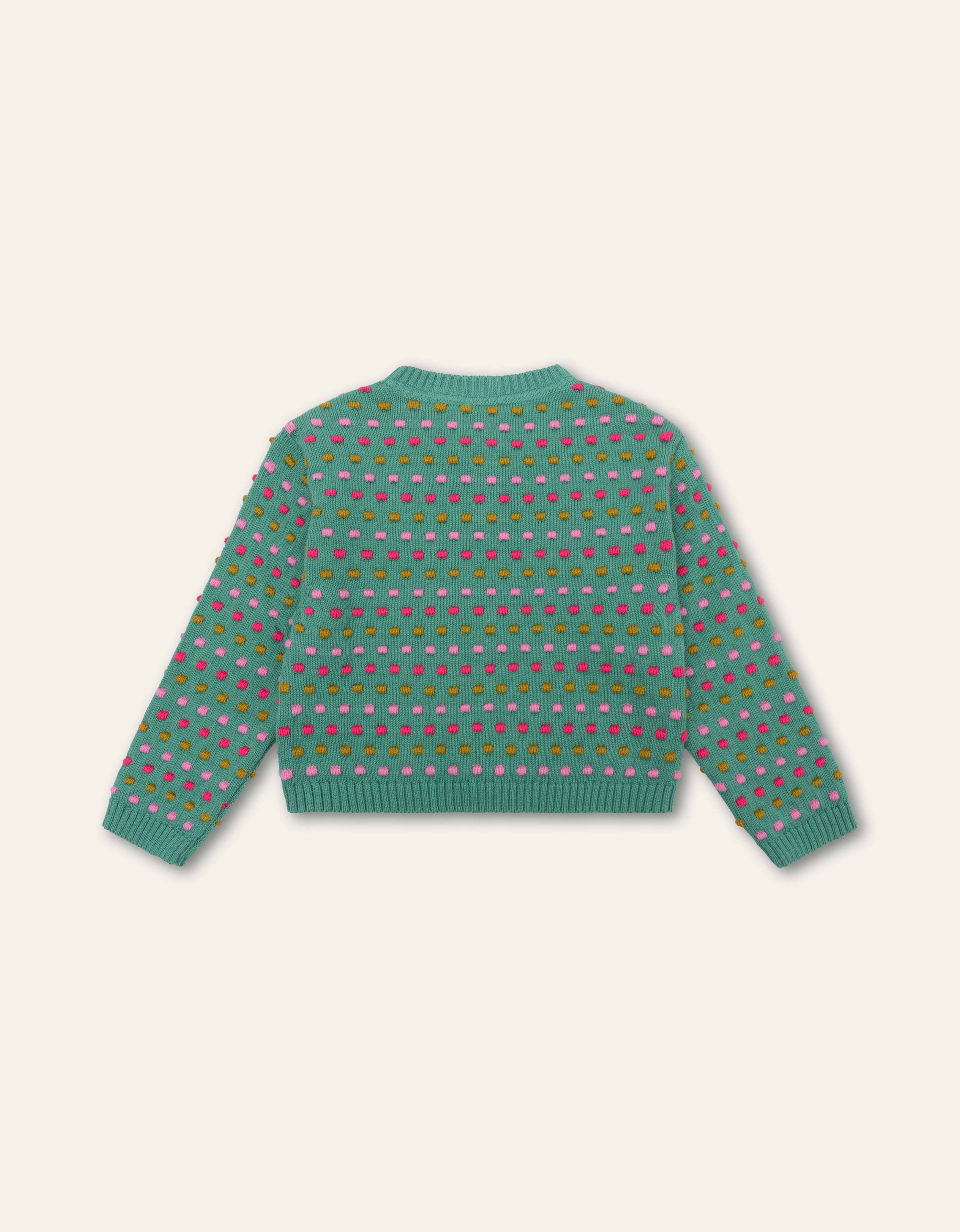 A cheerful cardigan brightens any outfit up. Especially this in one the colour crème de menthe with a playful dotted pattern and matching buttons.