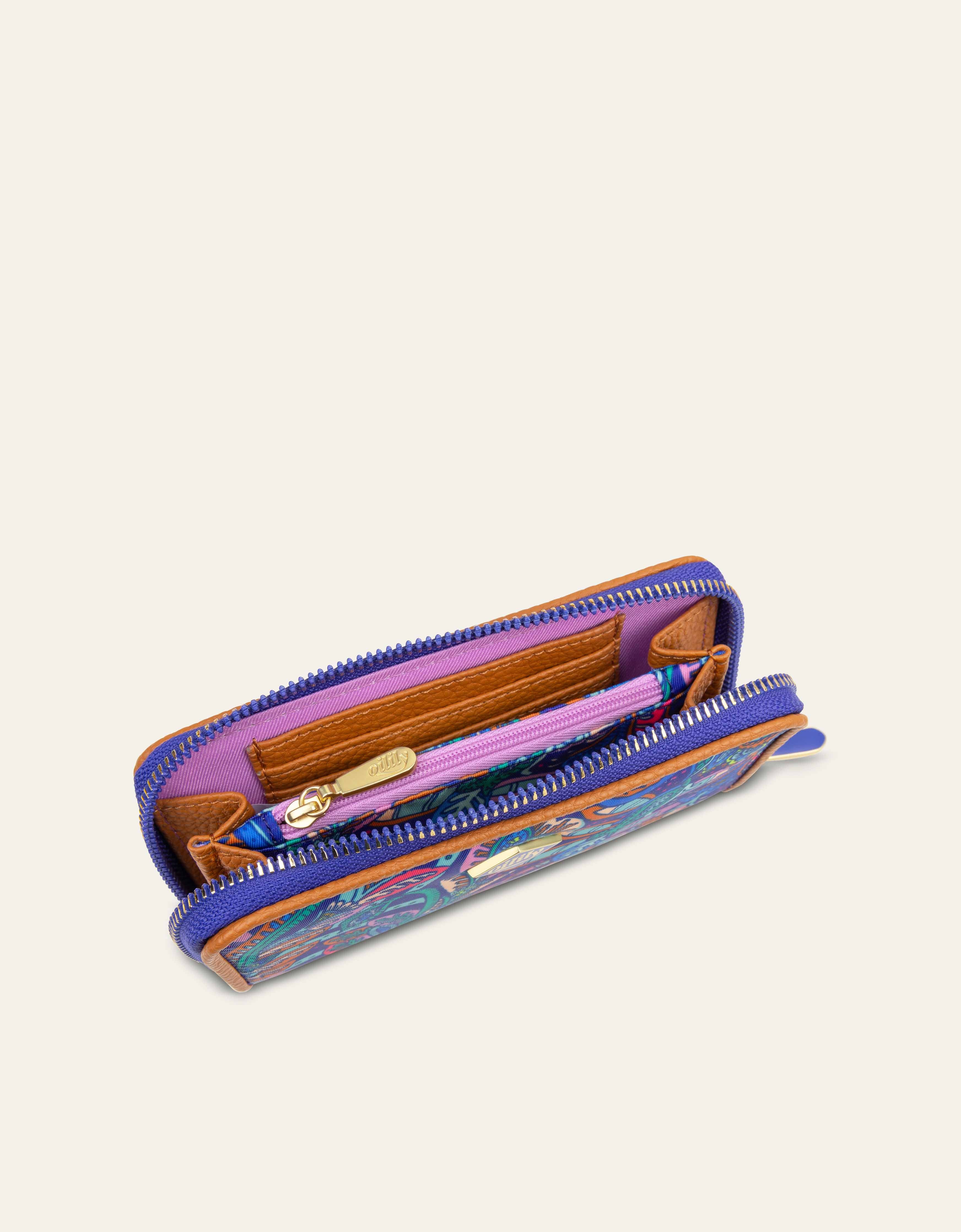 - Round zip closure provides access to 2 compartments, 1 zip pocket and 6 credit card slots