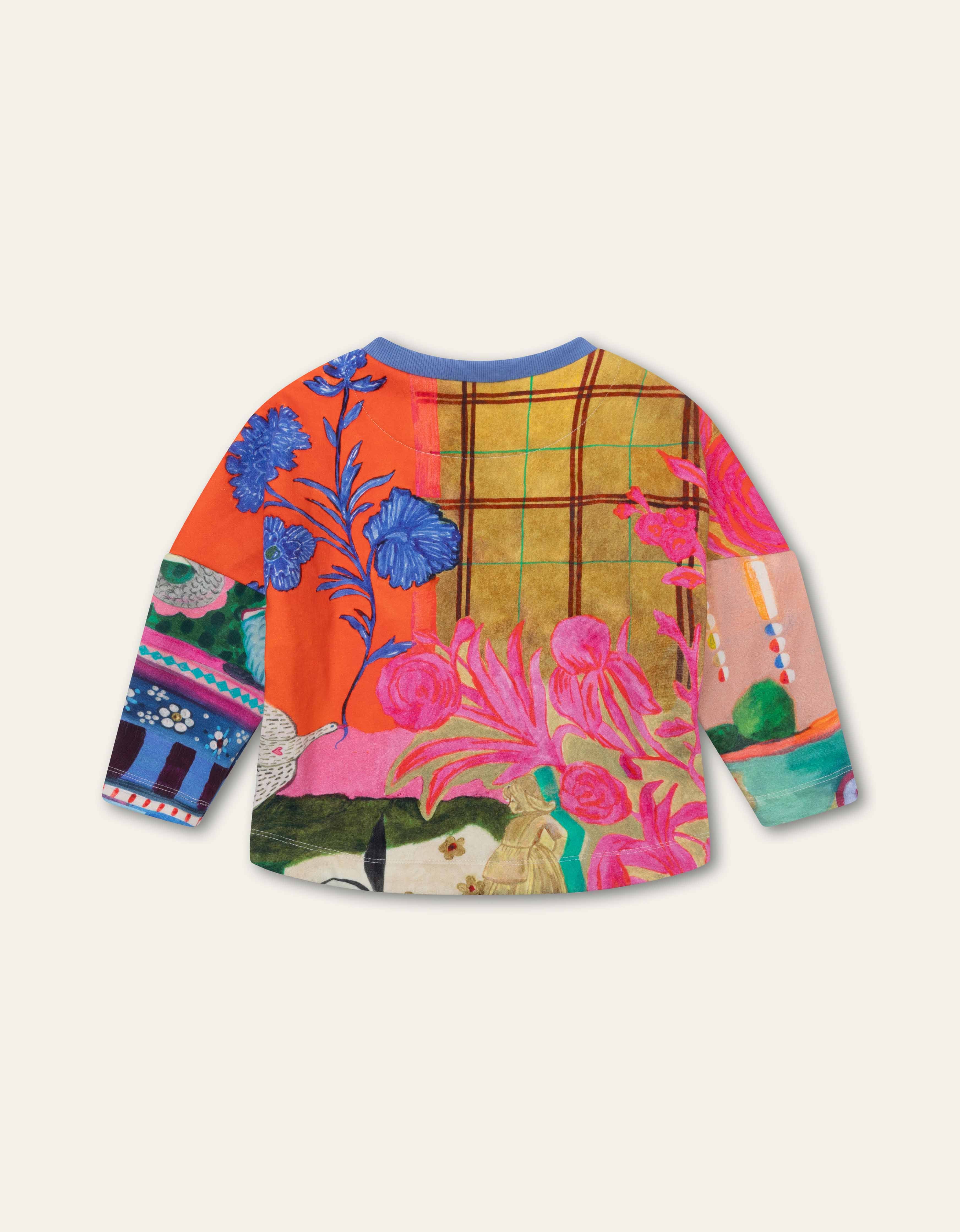 Bewonder de handgeschilderde vormen van de print Tissle Cheese met boten, bloemenweiden en meer, geïnspireerd door Schotland en Schokland. De onderkant van deze zachte trui is rond.