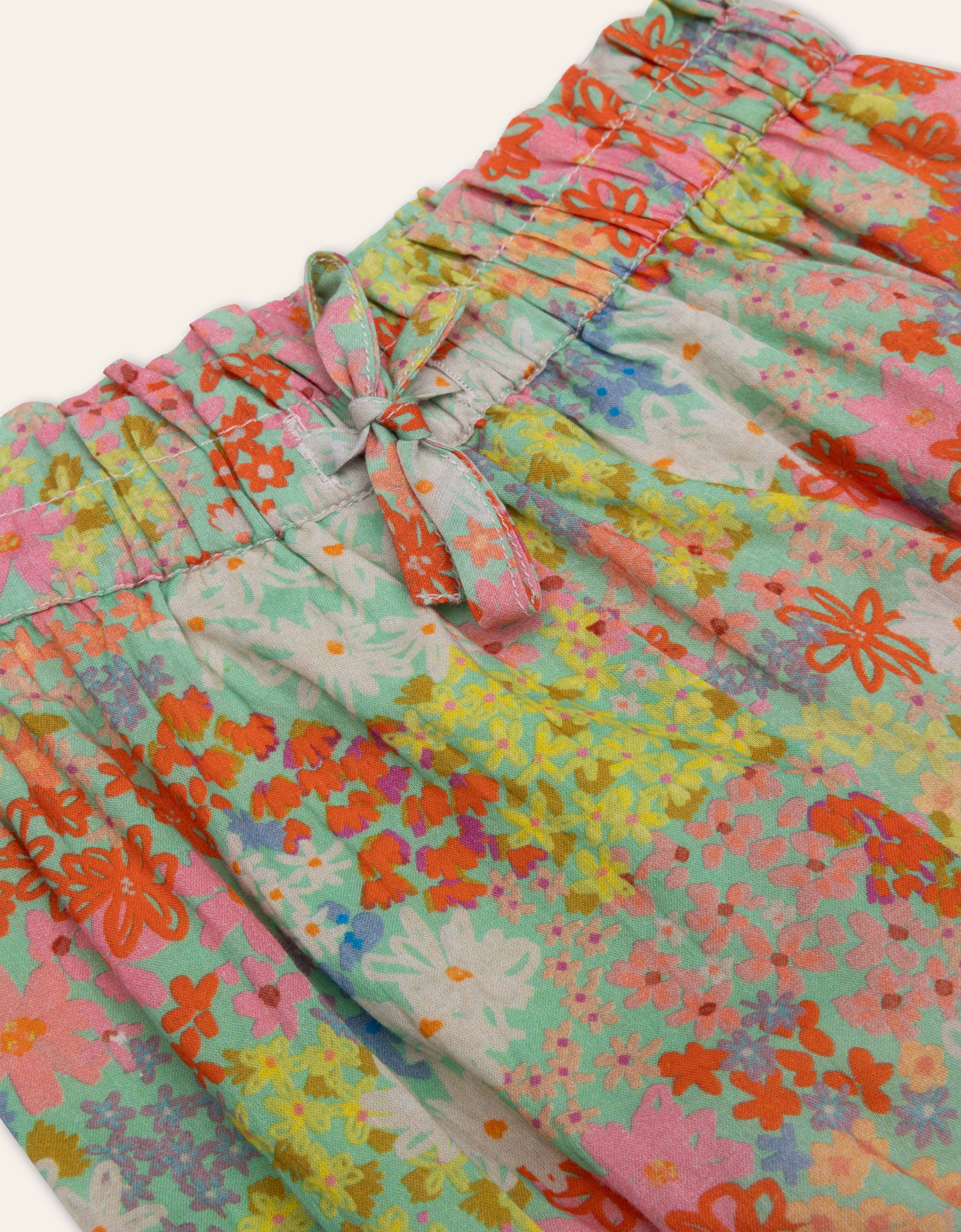 De digitaal getekende kleine bloemen van dessin Vitamin Flowers stralen op deze lieve katoen voile korte broek met lief klein ceintuurtje en elastische taille—een ware favoriet op zonnige dagen.