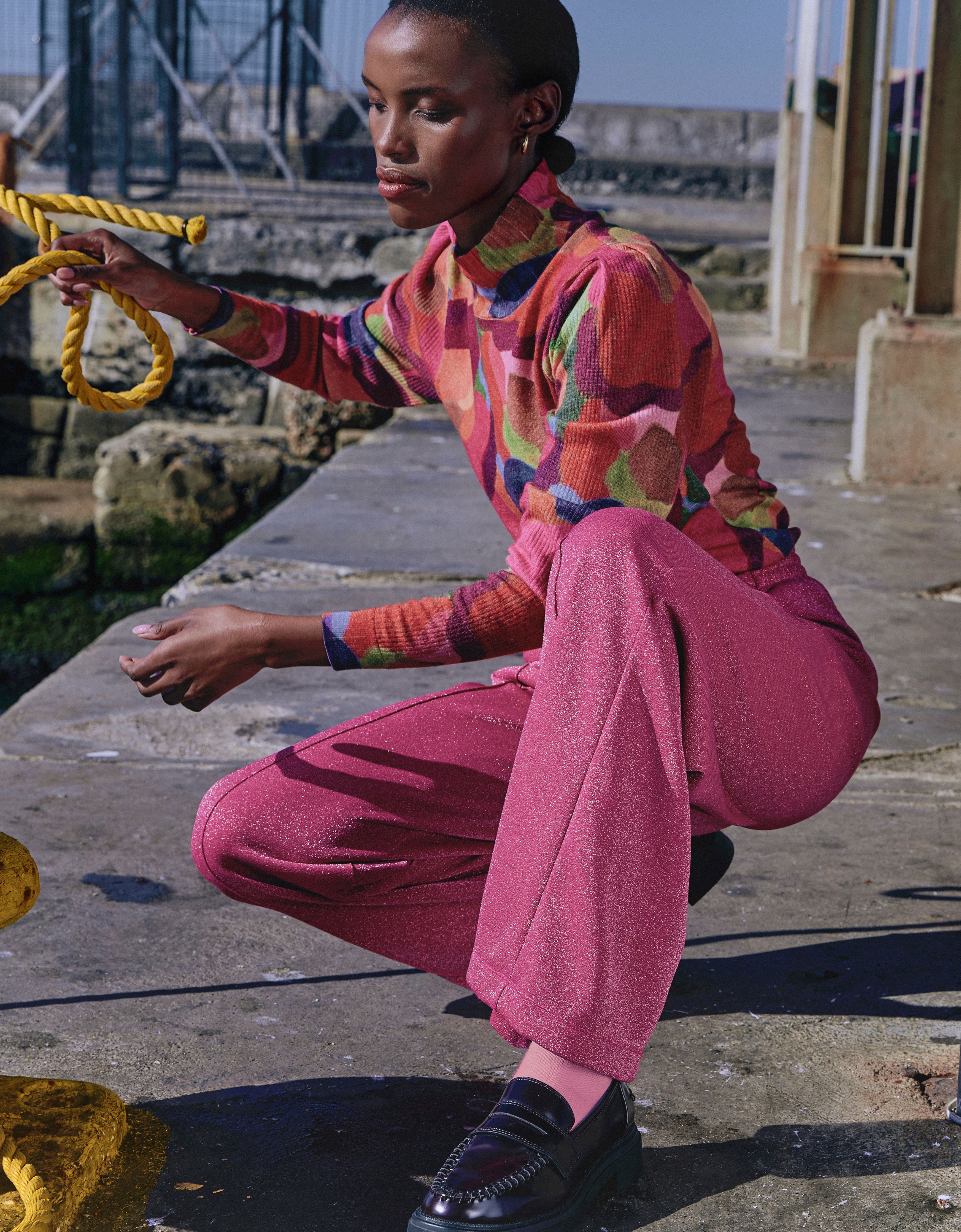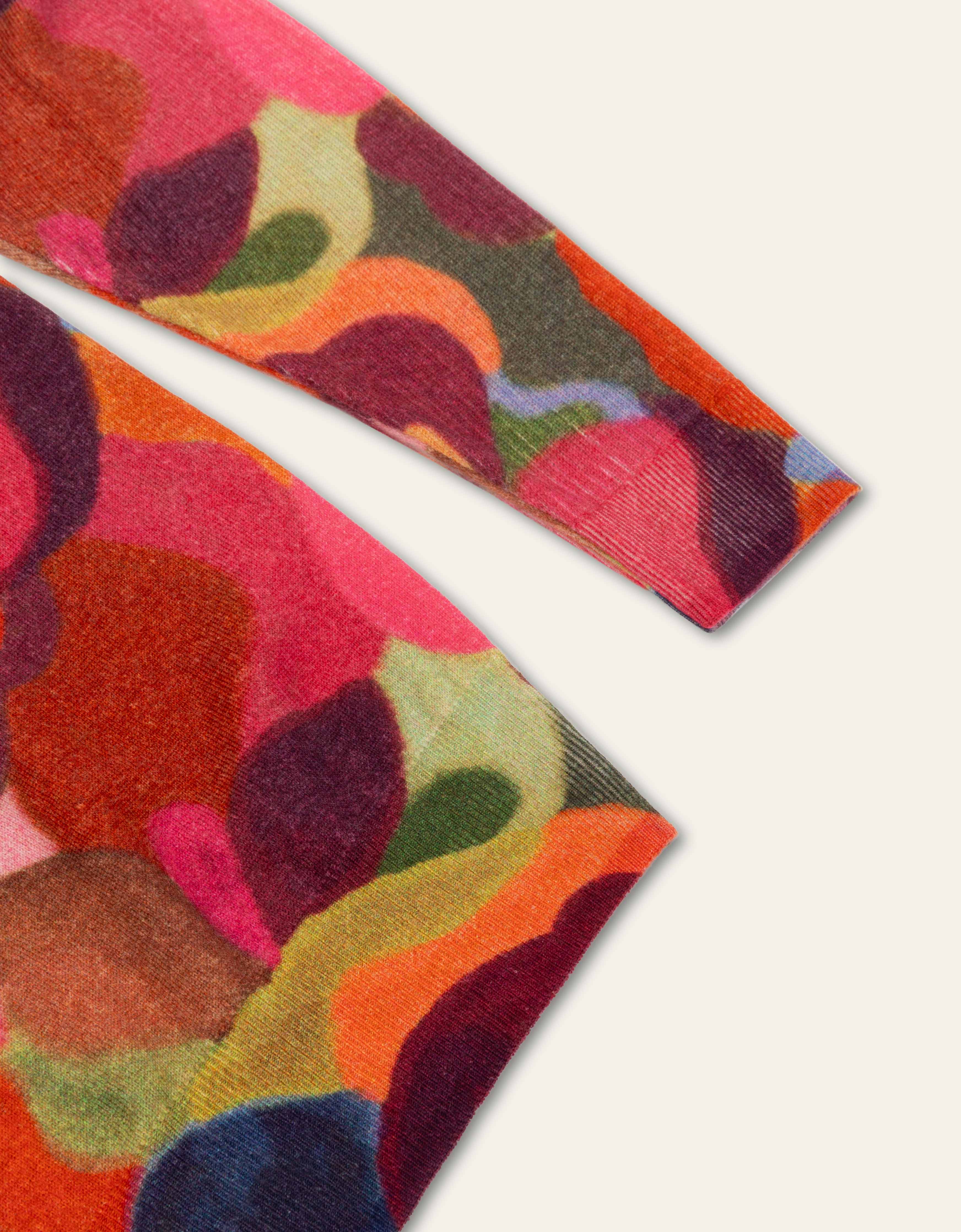 Rollneck trui dat geplooid is bij de schouders met een kleine ribstructuur zodat de plooi mooi uitvalt en wat volume aan de mouw geeft. Het dessin Veerle met de organische, overlappende vormen in rijk kleurenpalet komt prachtig uit op deze trui.