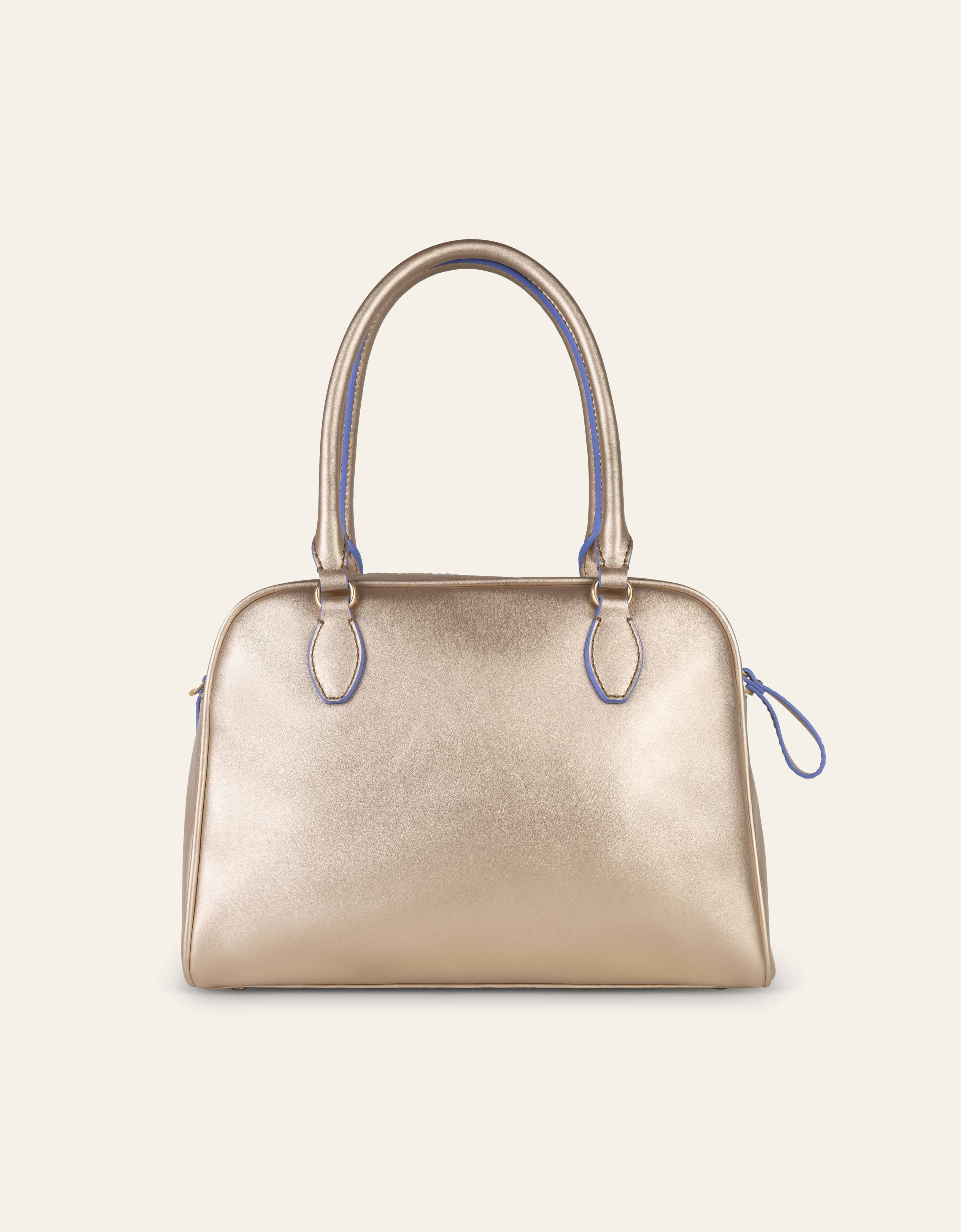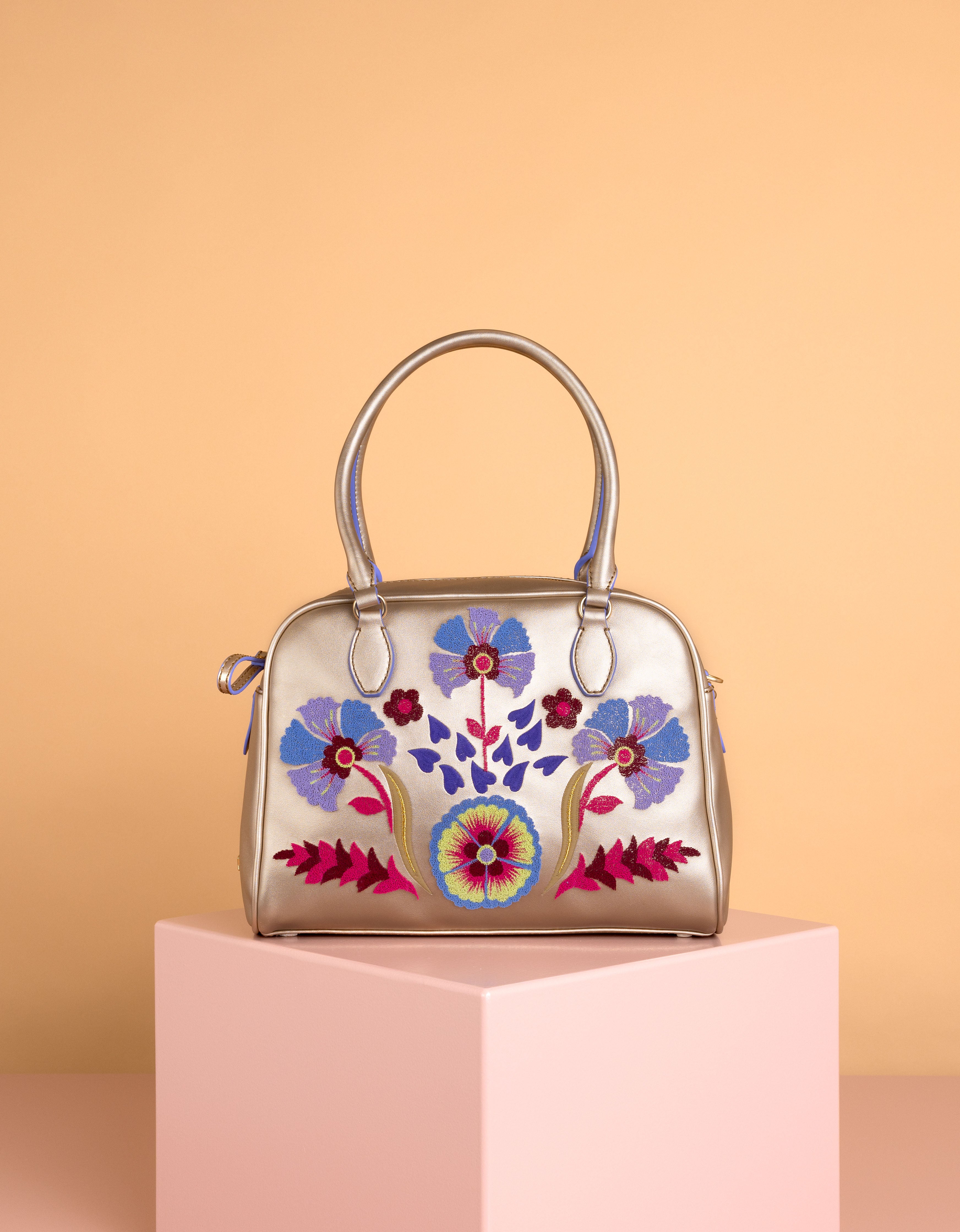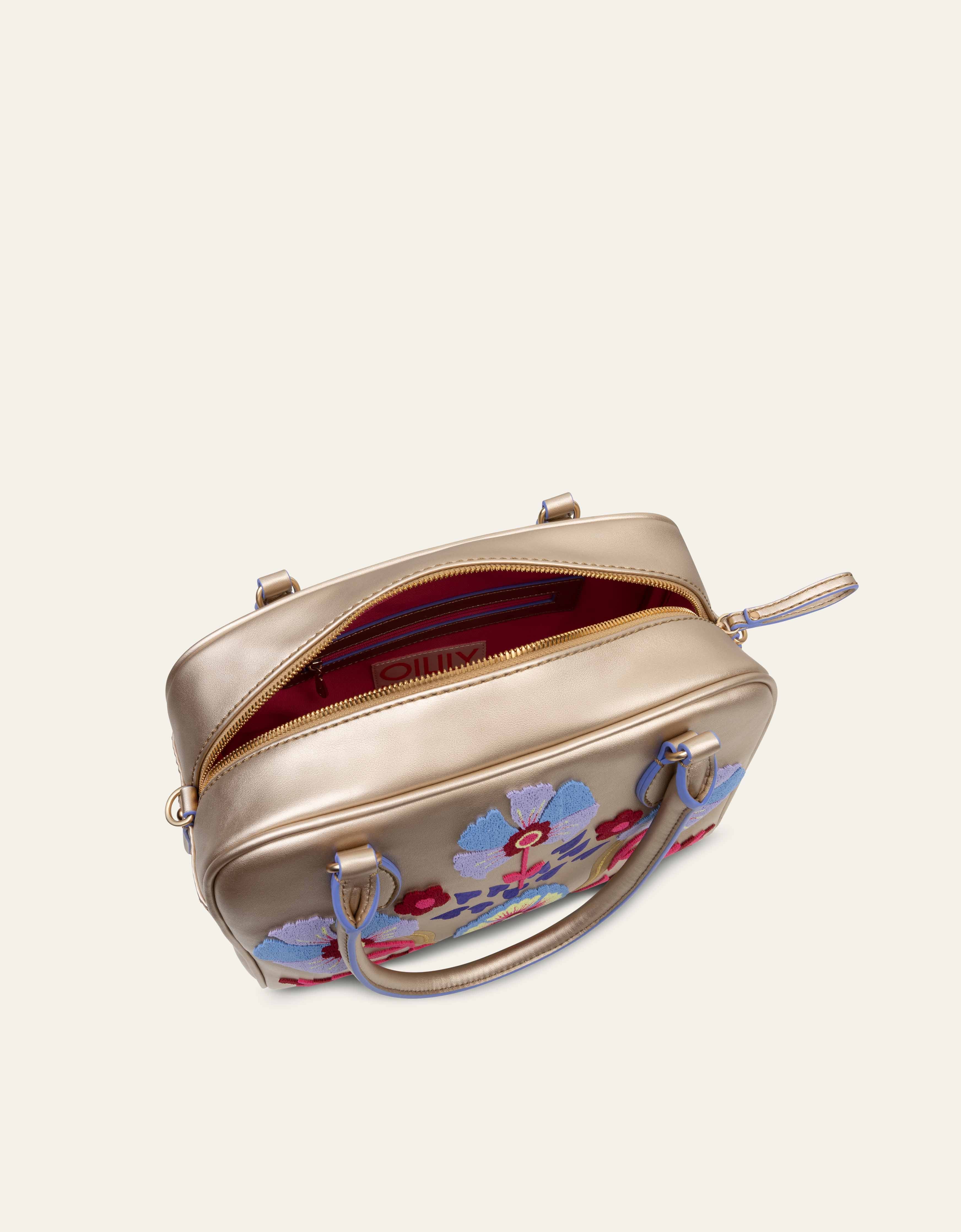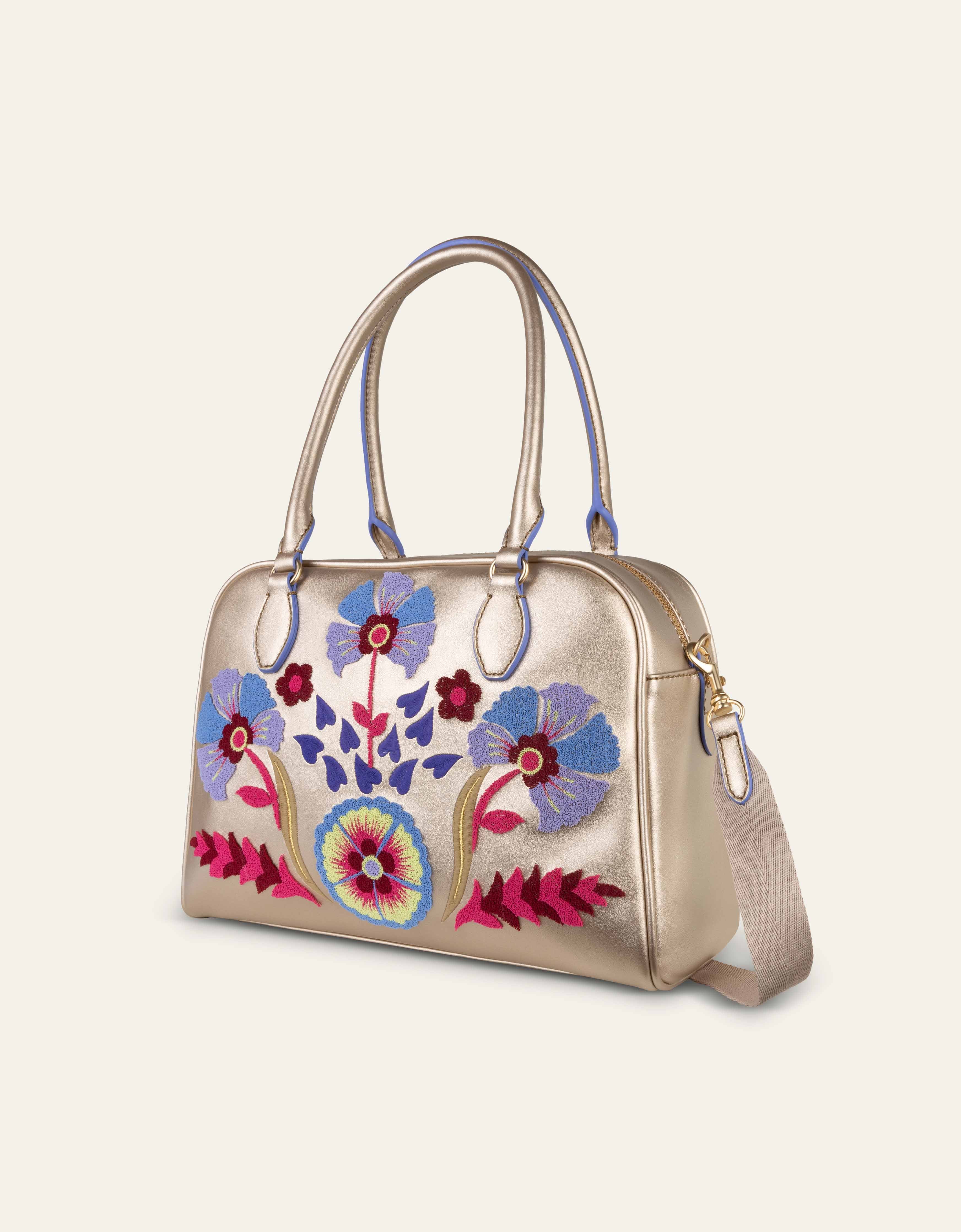 Een handtas met metallic look en opgeborduurde details.