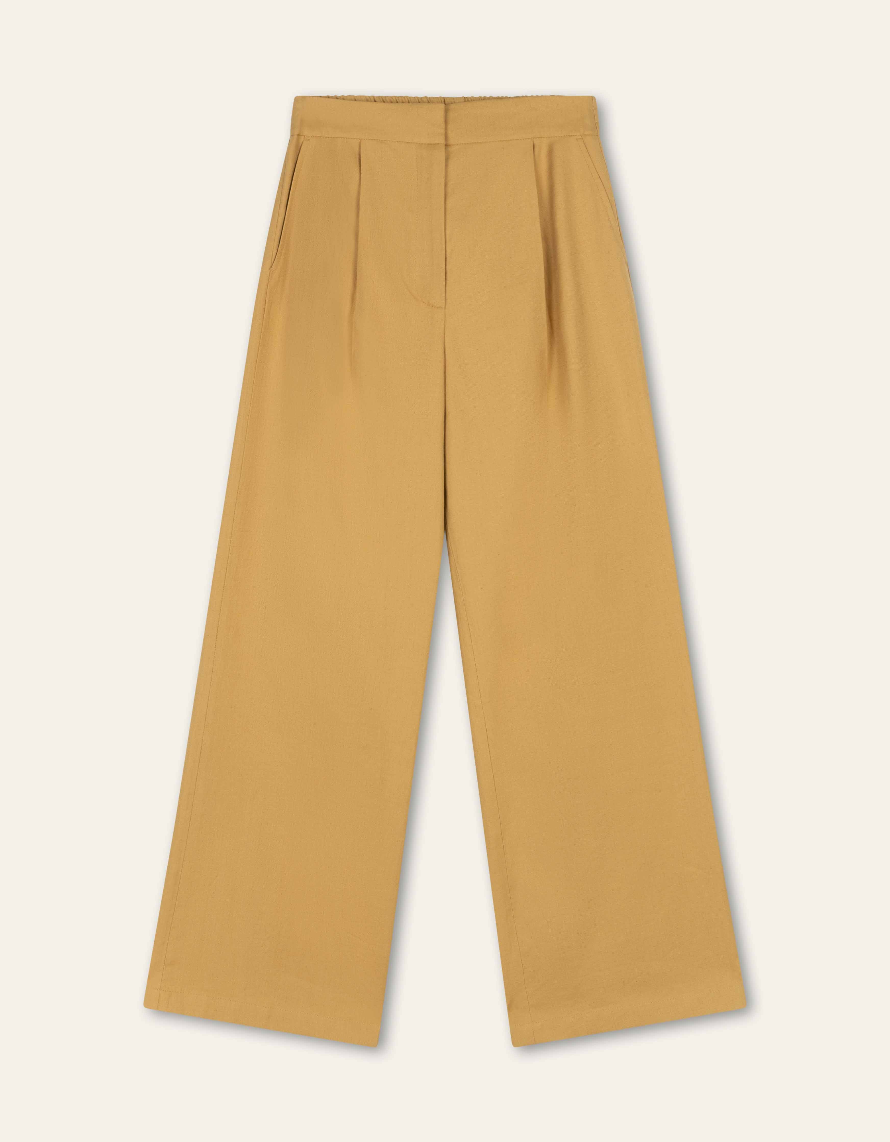 Rechte broek van 100% katoen, met plooien voor een verfijnde touch. Voorzien van een schijfknoop