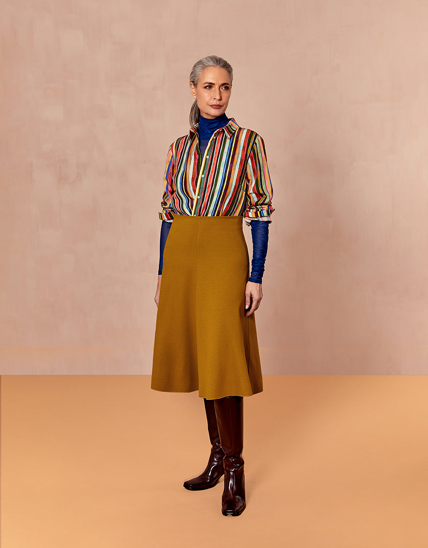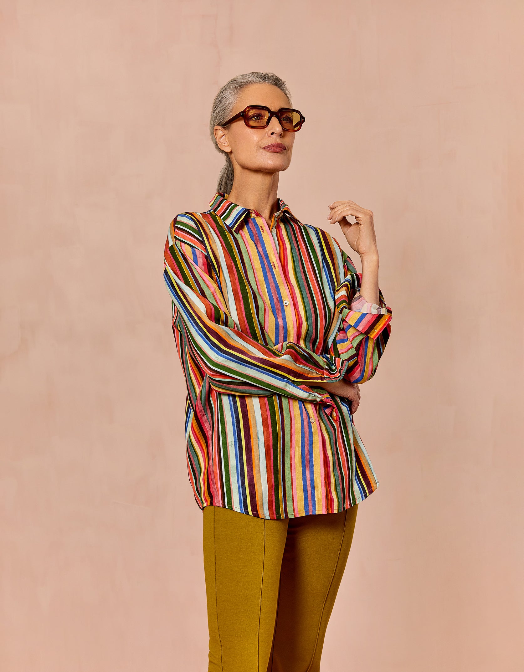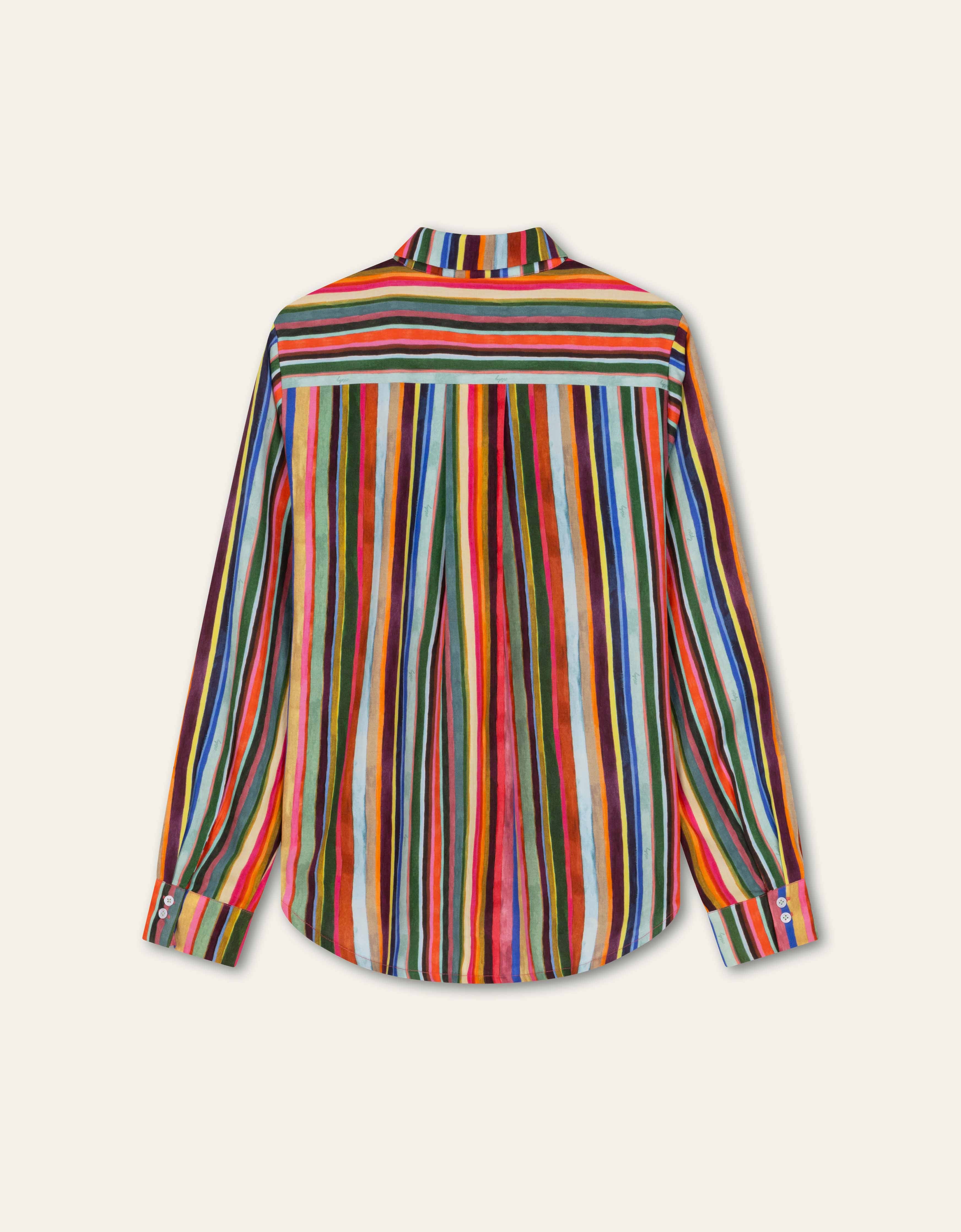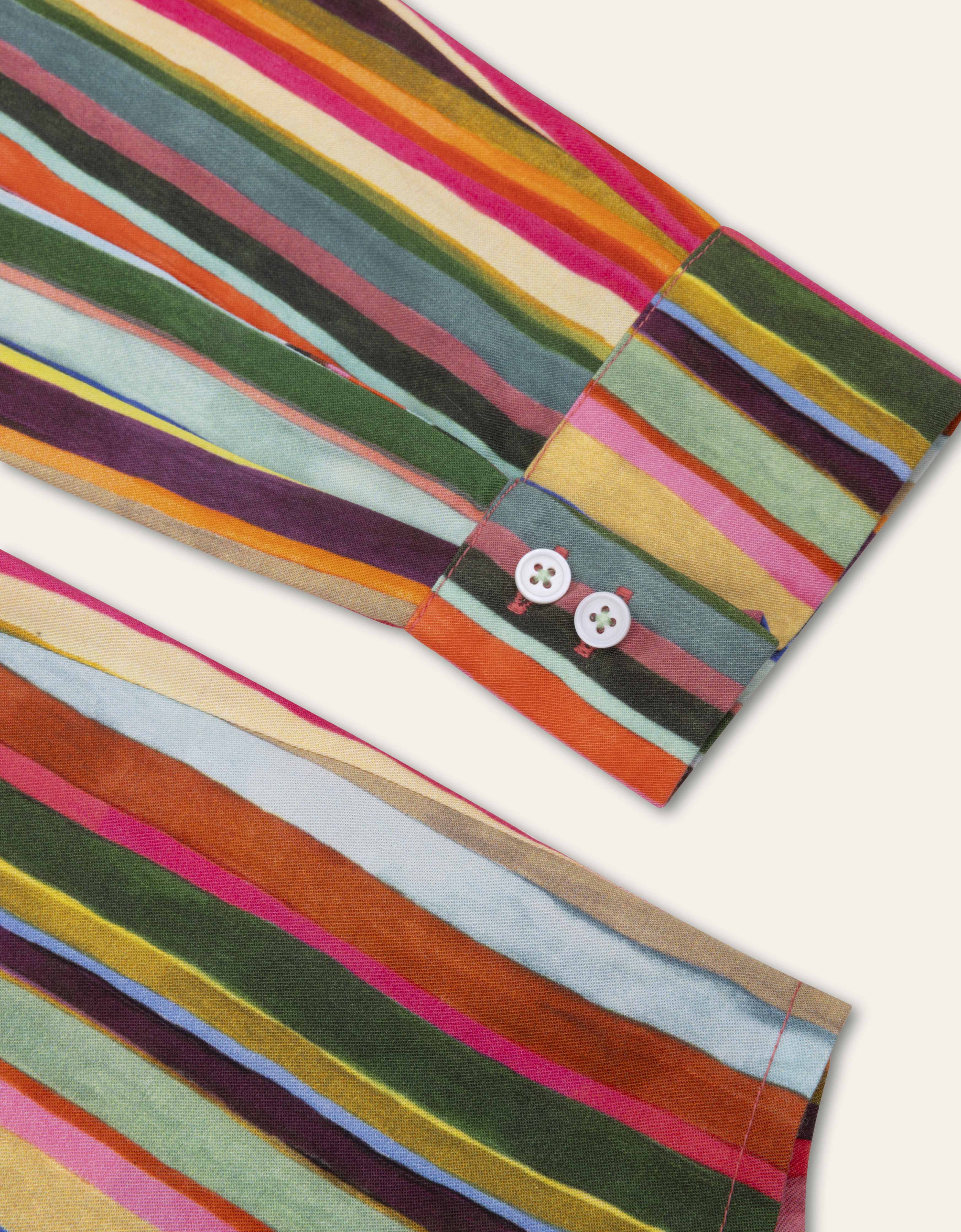 De straight fit met enkele plooi achter is de perfecte basis voor deze blouse in de kleurrijke print Pieternelle stripe. Voor dit dessin haalden we inspiratie uit de tulpenvelden van bovenaf gezien en tekenden deze kleuren in een streeppatroon na.