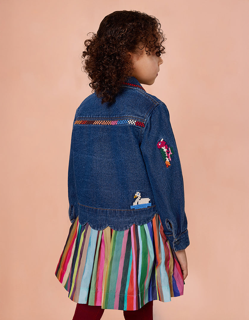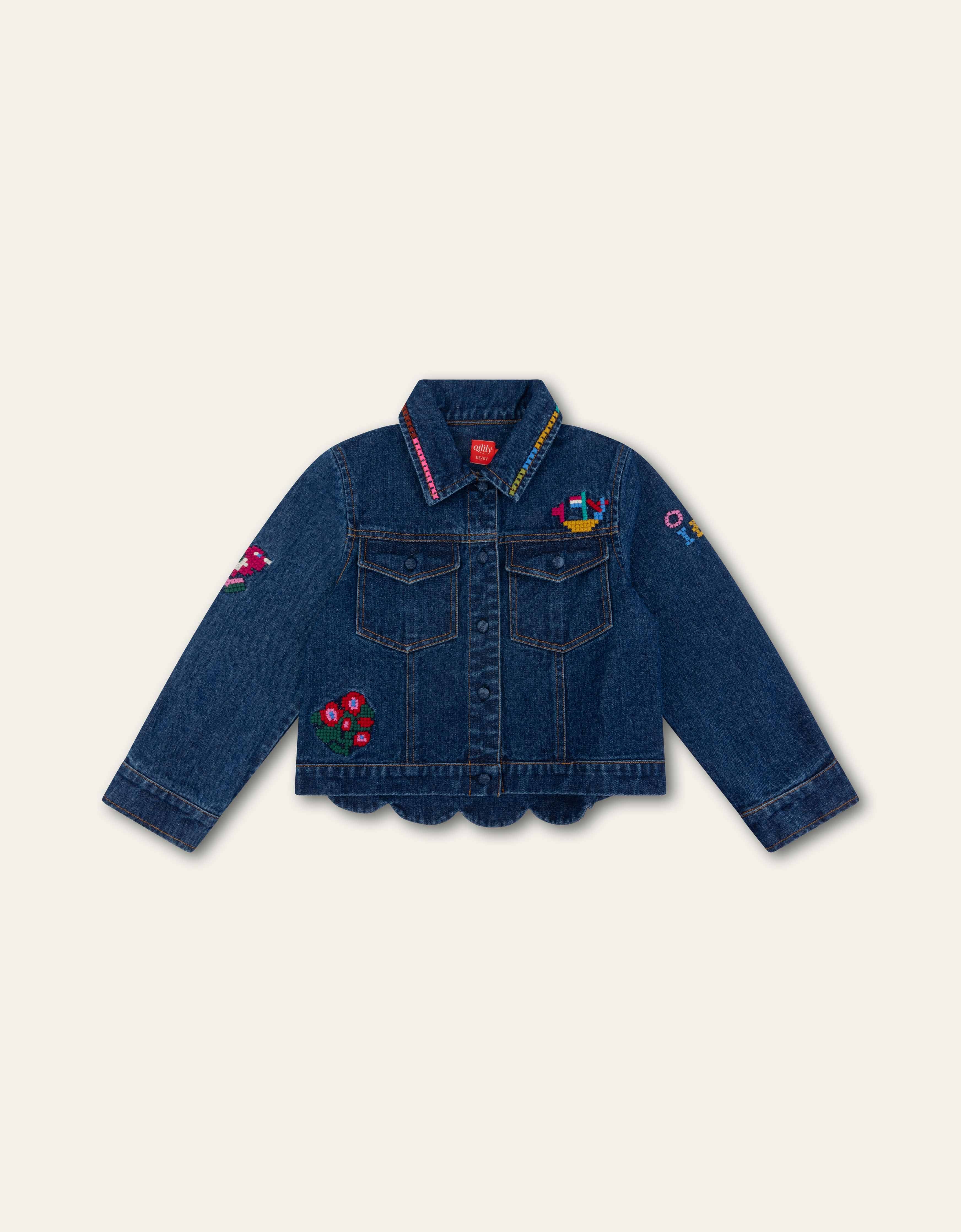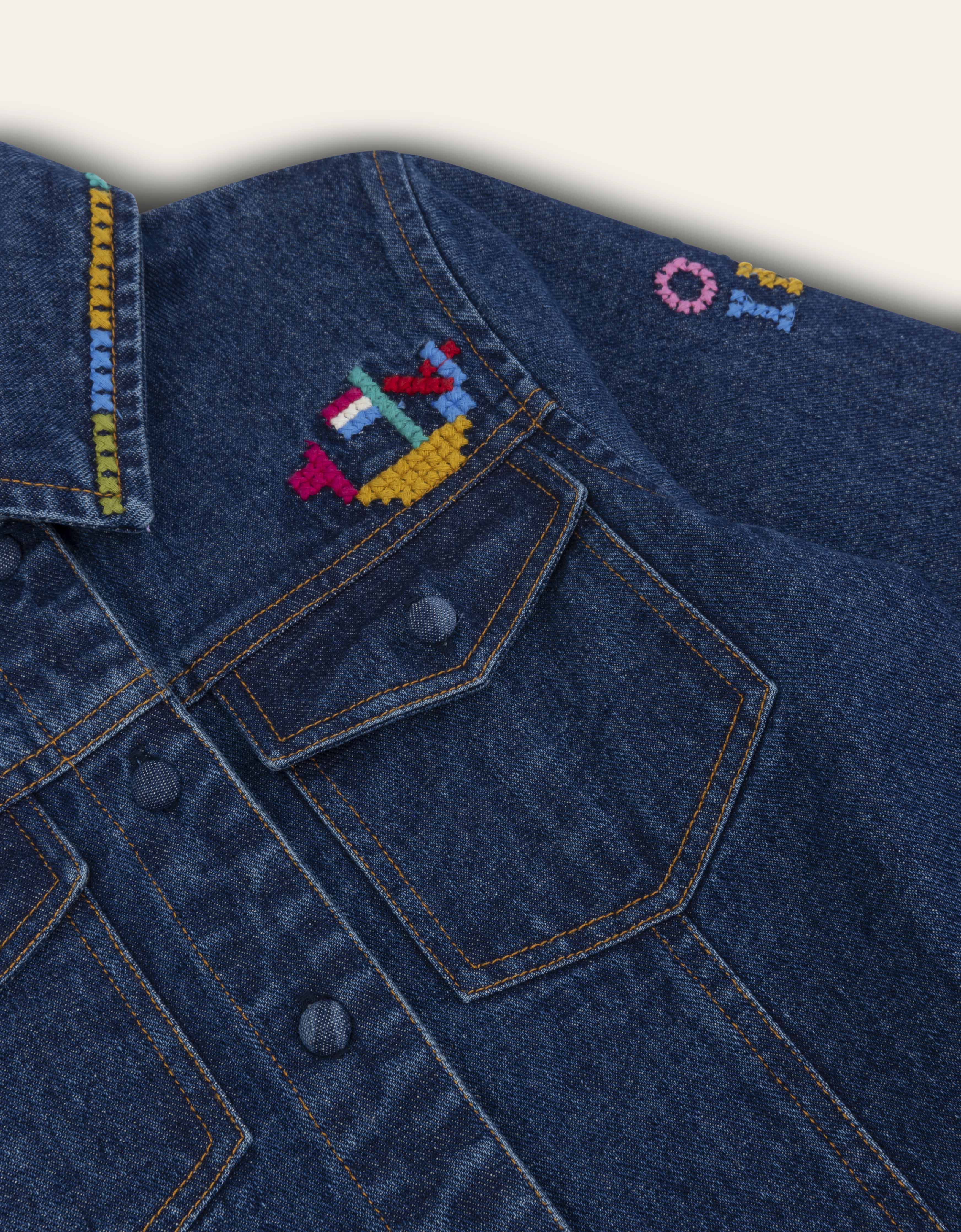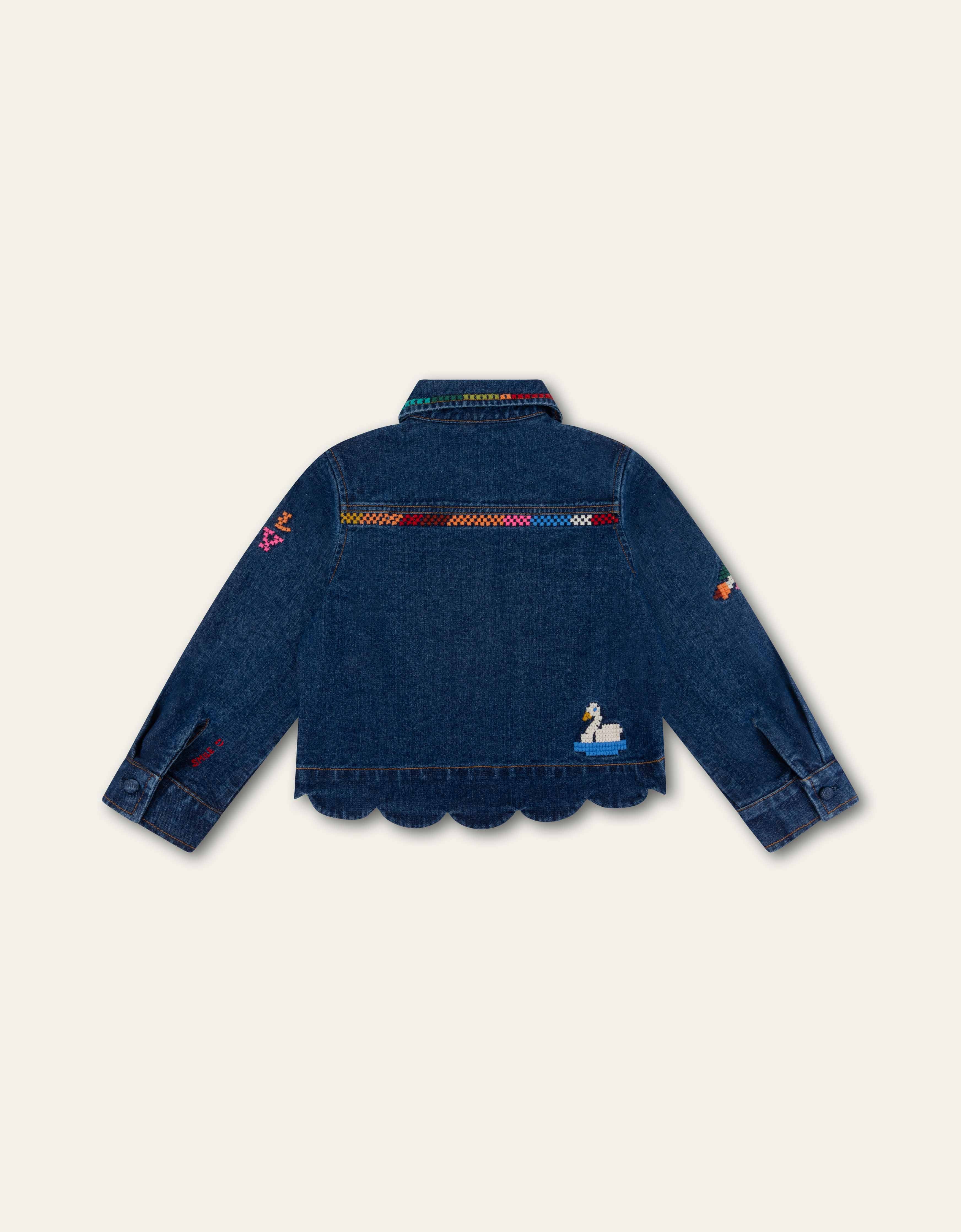 Dit spijkerjasje heeft veel mooie details waardoor het een feestje is om te dragen. Zoals de onderkant van de rug met schulpjes, maar vooral het speelse borduurwerk met leuke elementen geïnspireerd door folklore. Dit maakt het helemaal af.