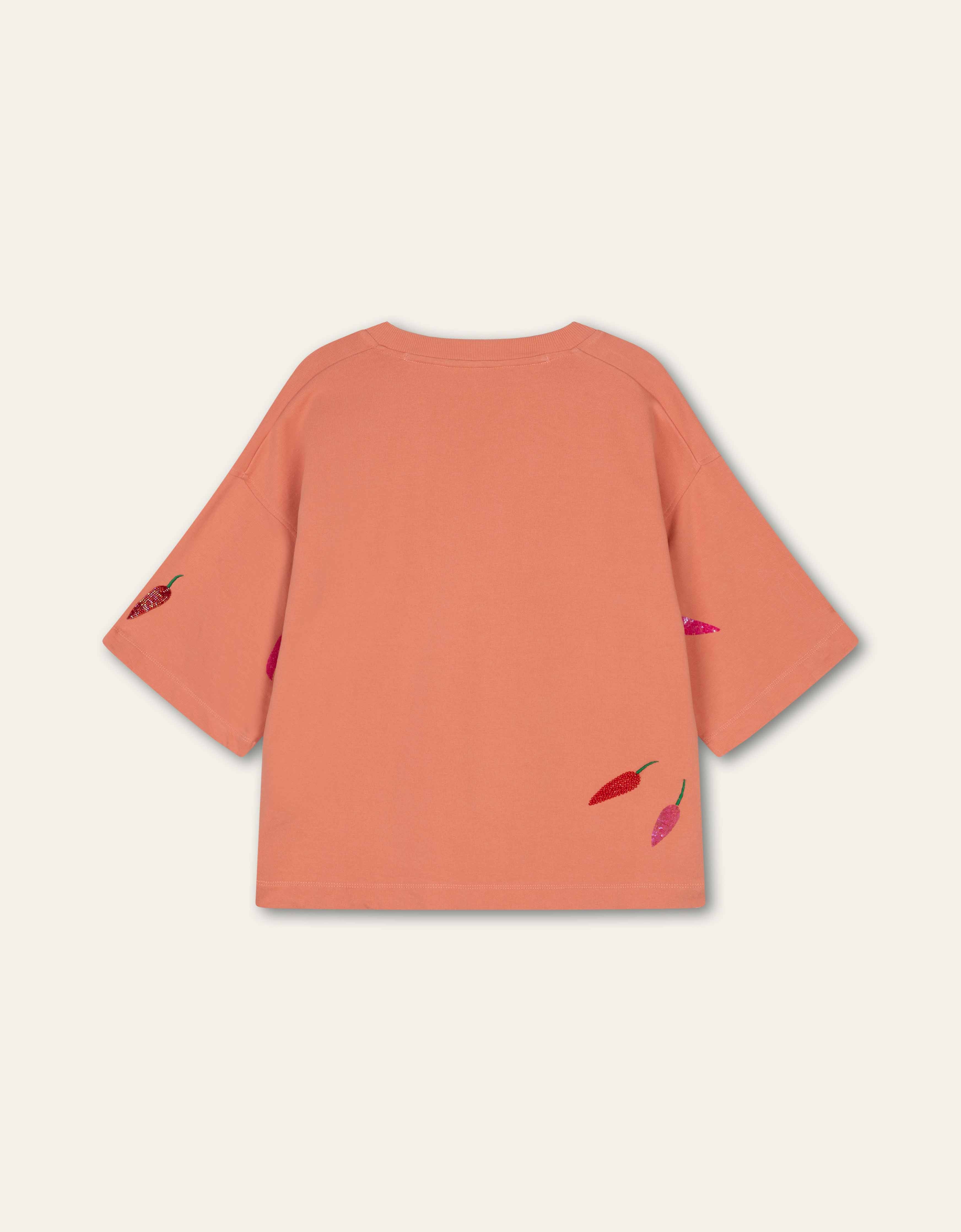 Speelse sweater met korte mouwen en V-hals, versierd met geborduurde pepertjes, kraaltjes en glinsterende pailletten voor een vrolijke, zomerse touch.