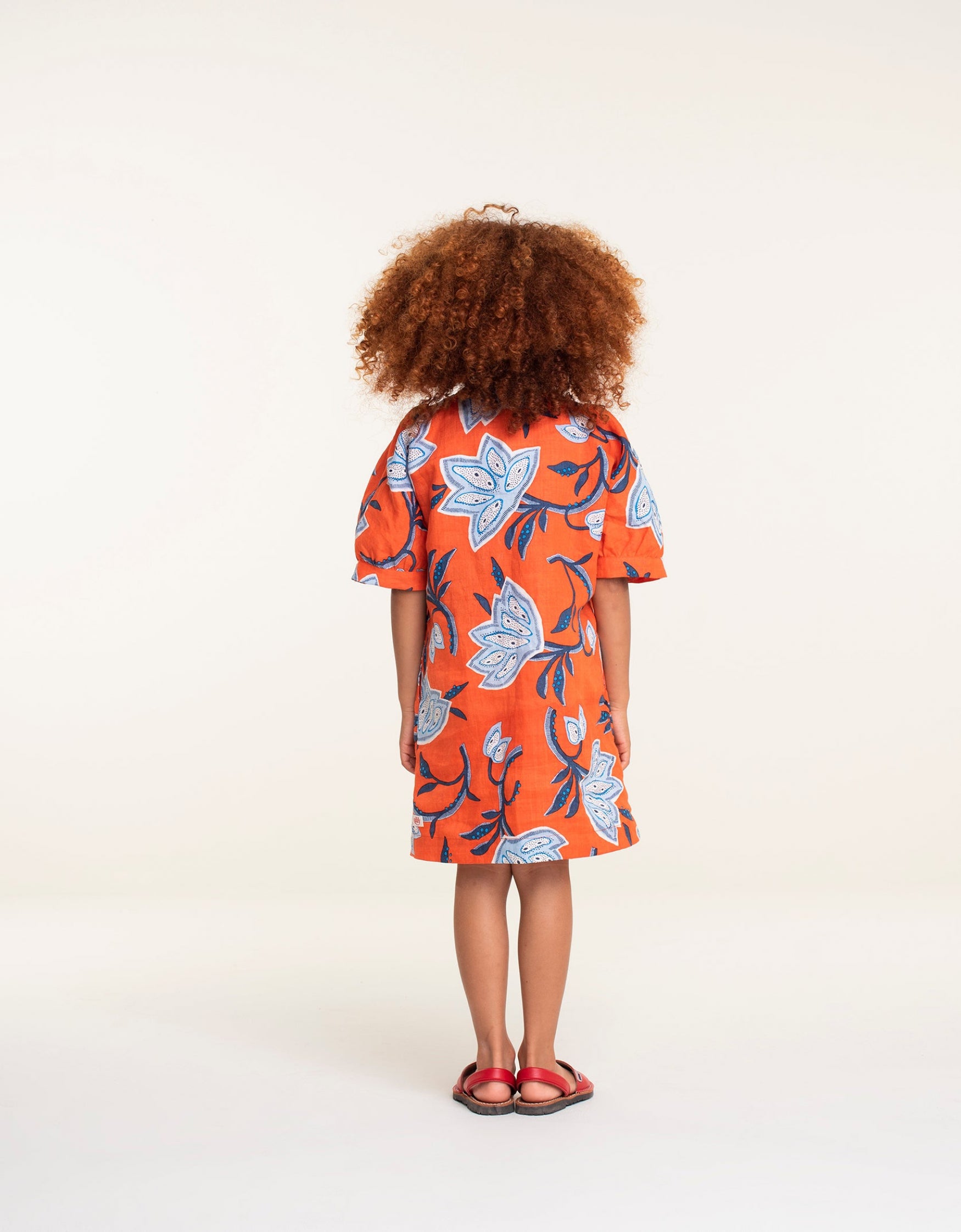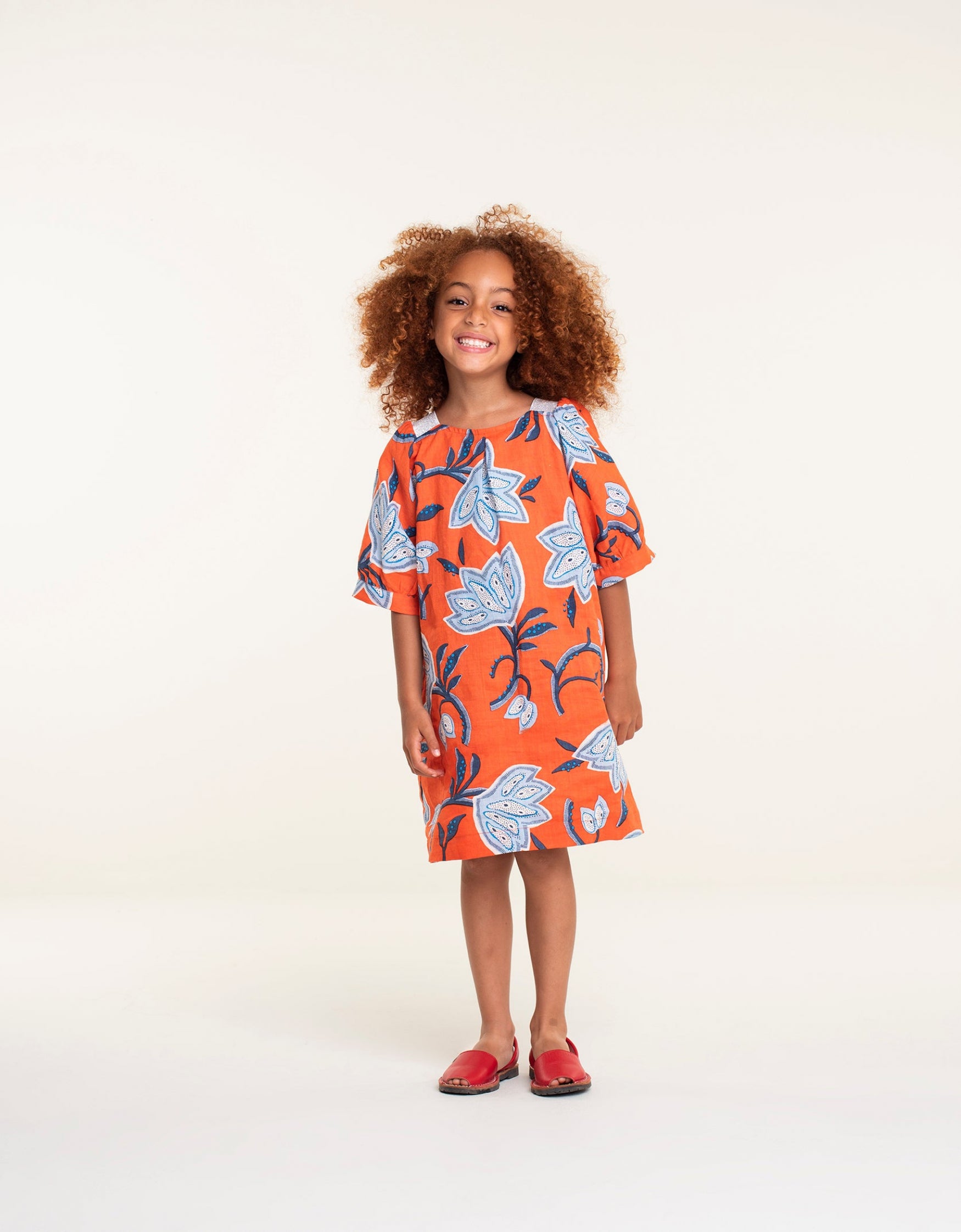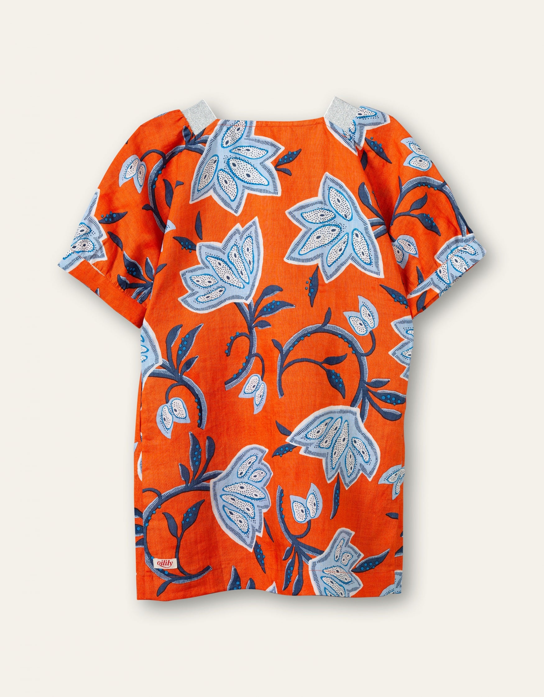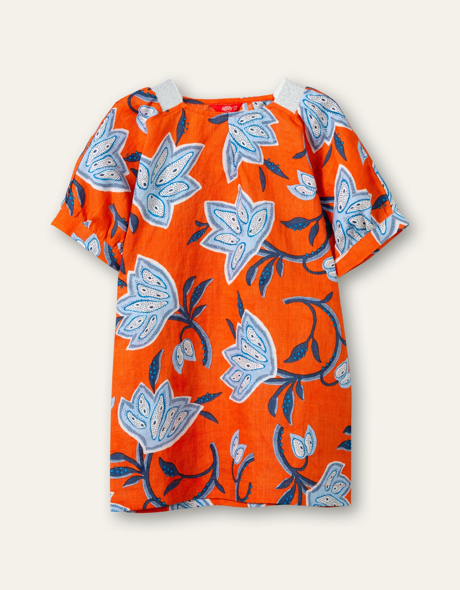 Lekker lichte en luchtige linnen jurk voor stoere meiden die houden van blauw, oranje en zilver. Deze jurk zit losjes, heeft een speelse pofmouw en coole, zilveren accenten bij de schouders. - Relaxed fit - 100% katoen - Met zakjes en flexibele boord