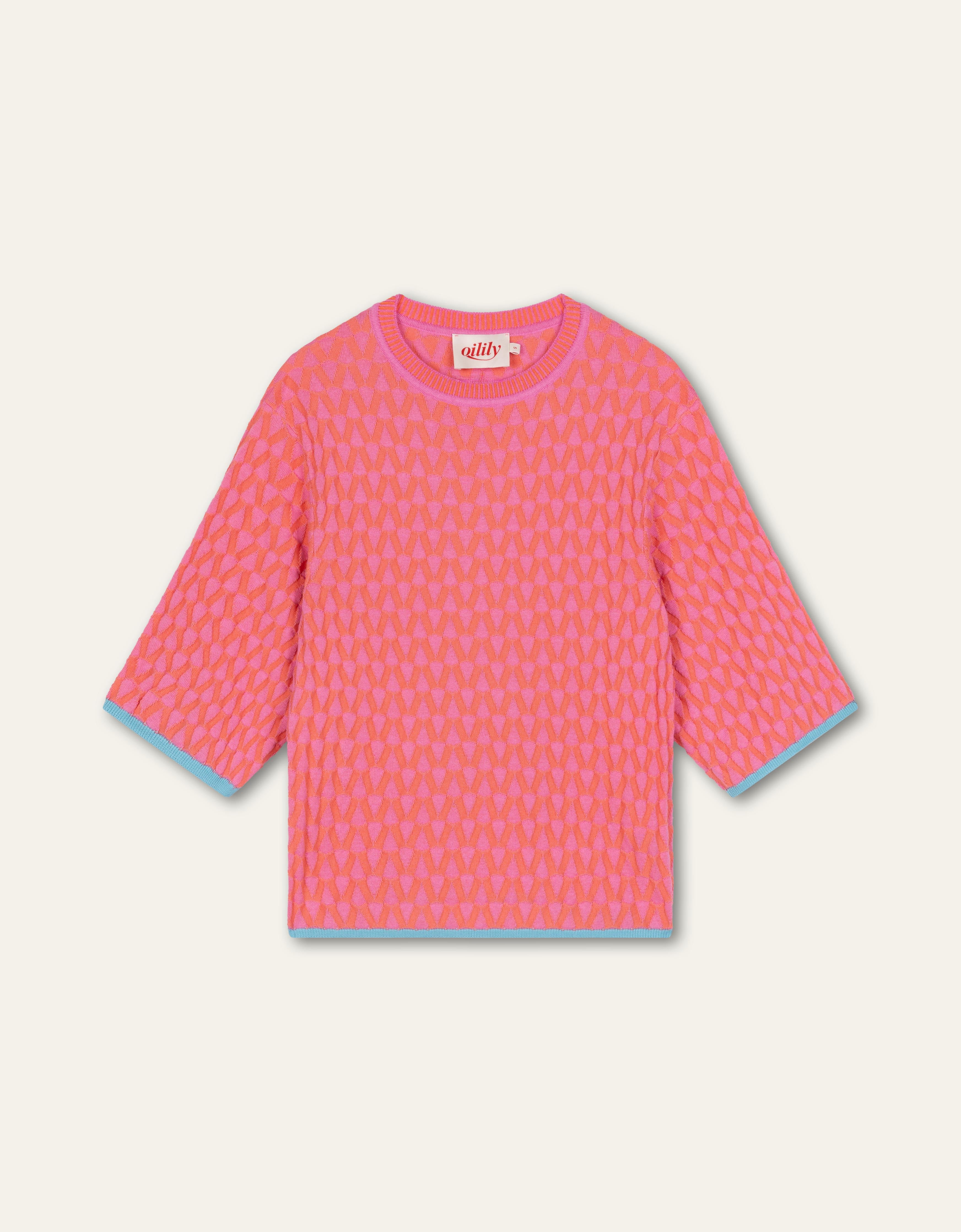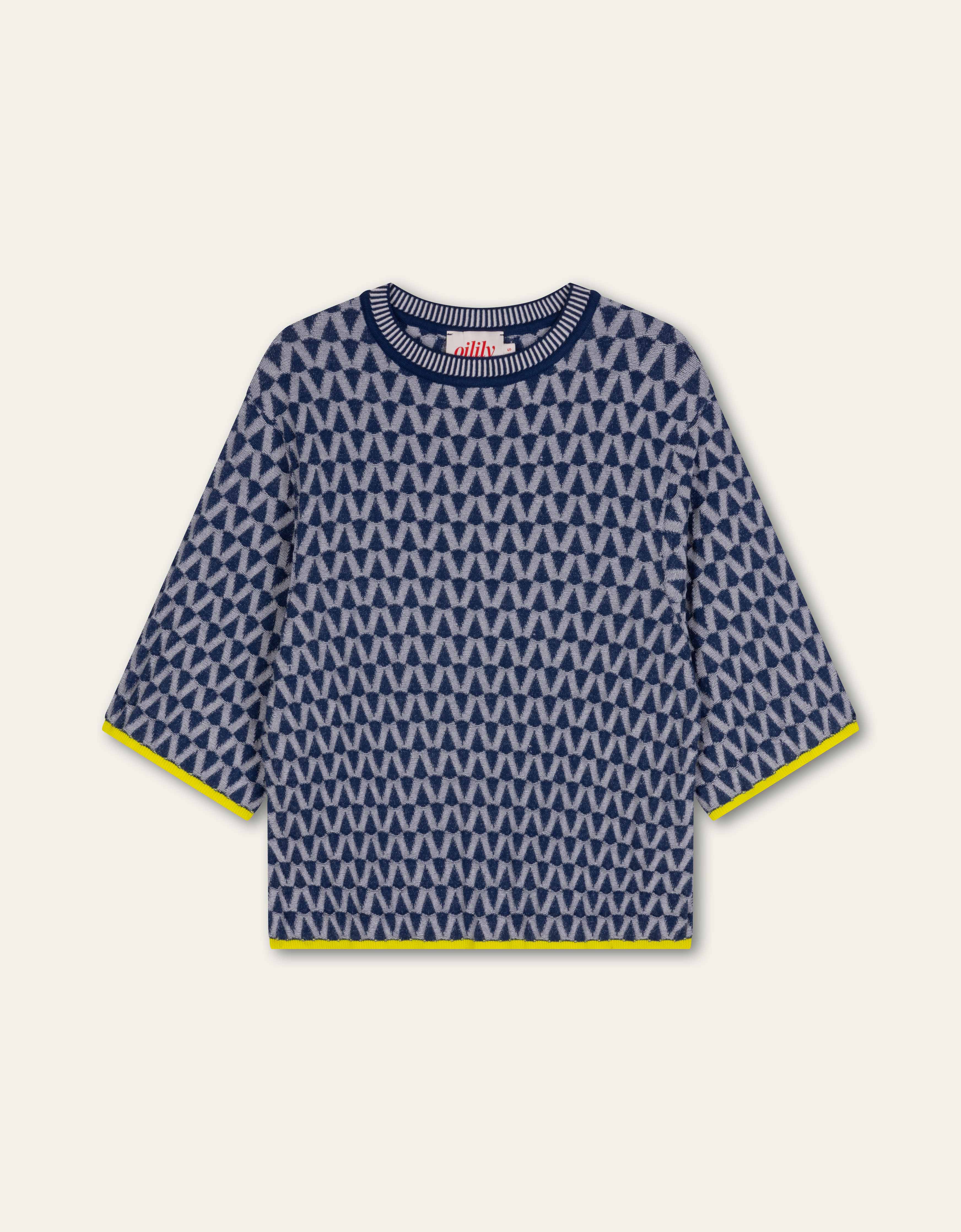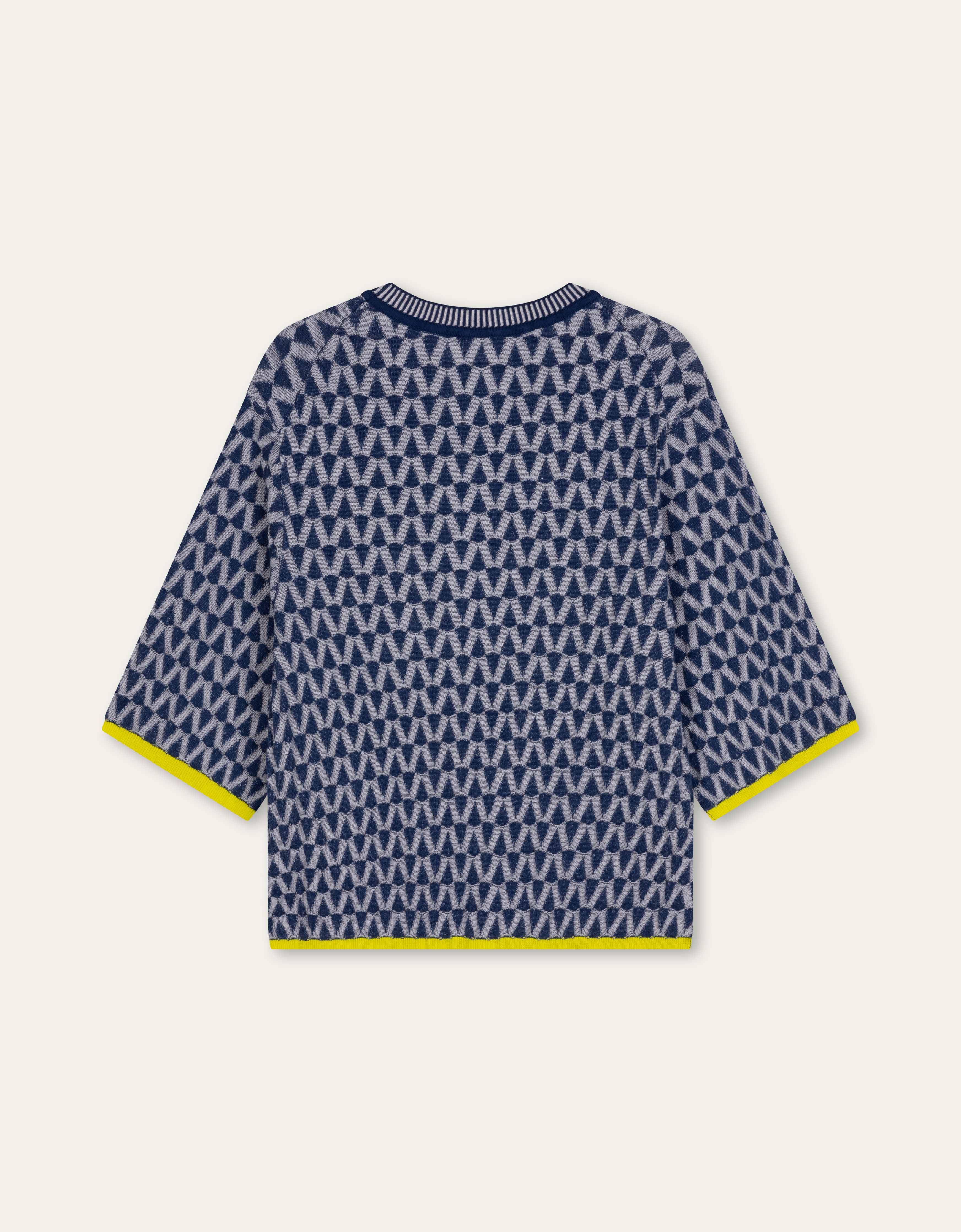 De relaxte fit maakt deze top uitermate geschikt voor ontspannen lentedagen. De verschillende steekpatronen boven en onder staan speels en uitnodigend. De mouwen hebben een driekwartlengte. We raden aan om knitwear opgevouwen in je kast te leggen en vooral niet op te hangen.