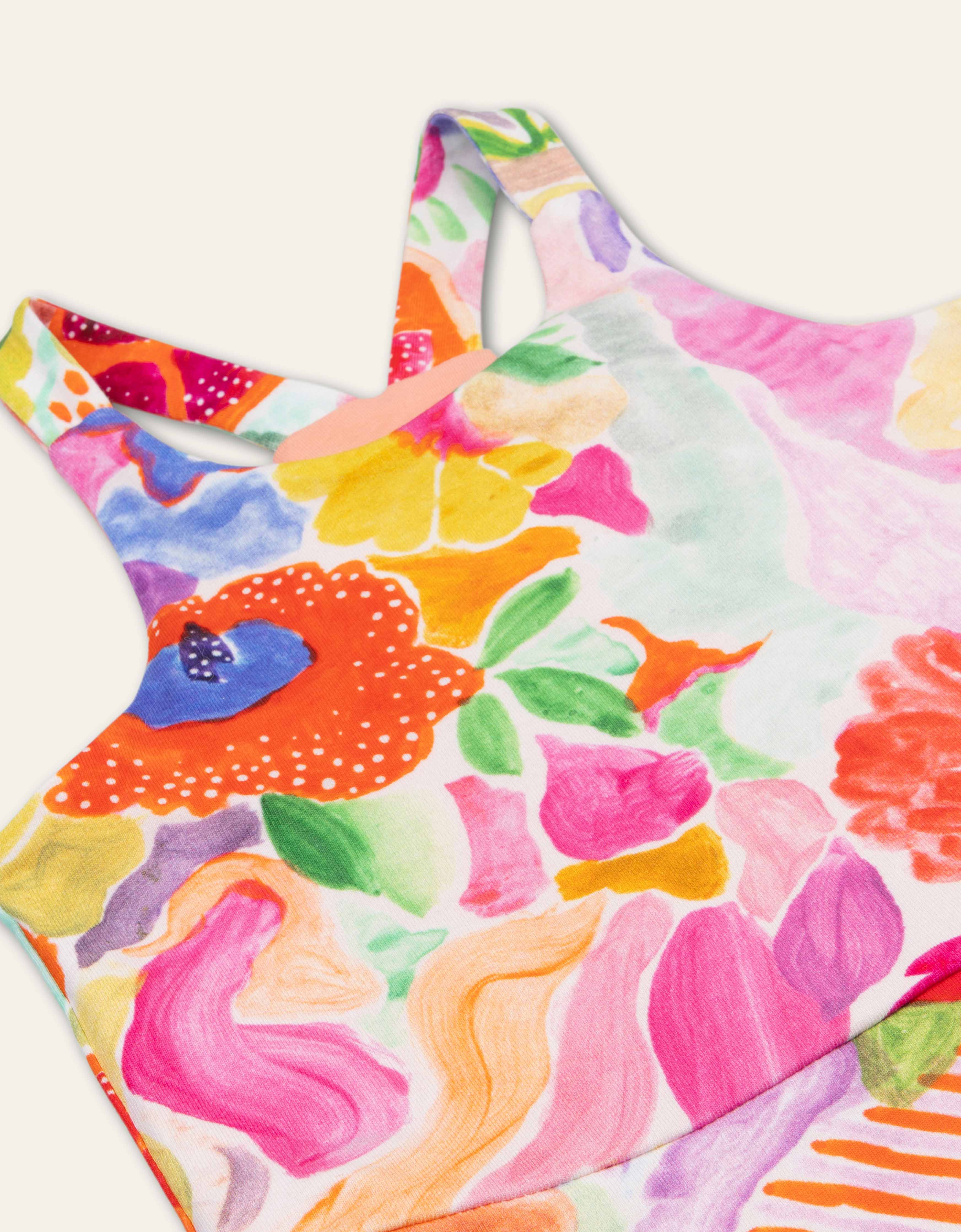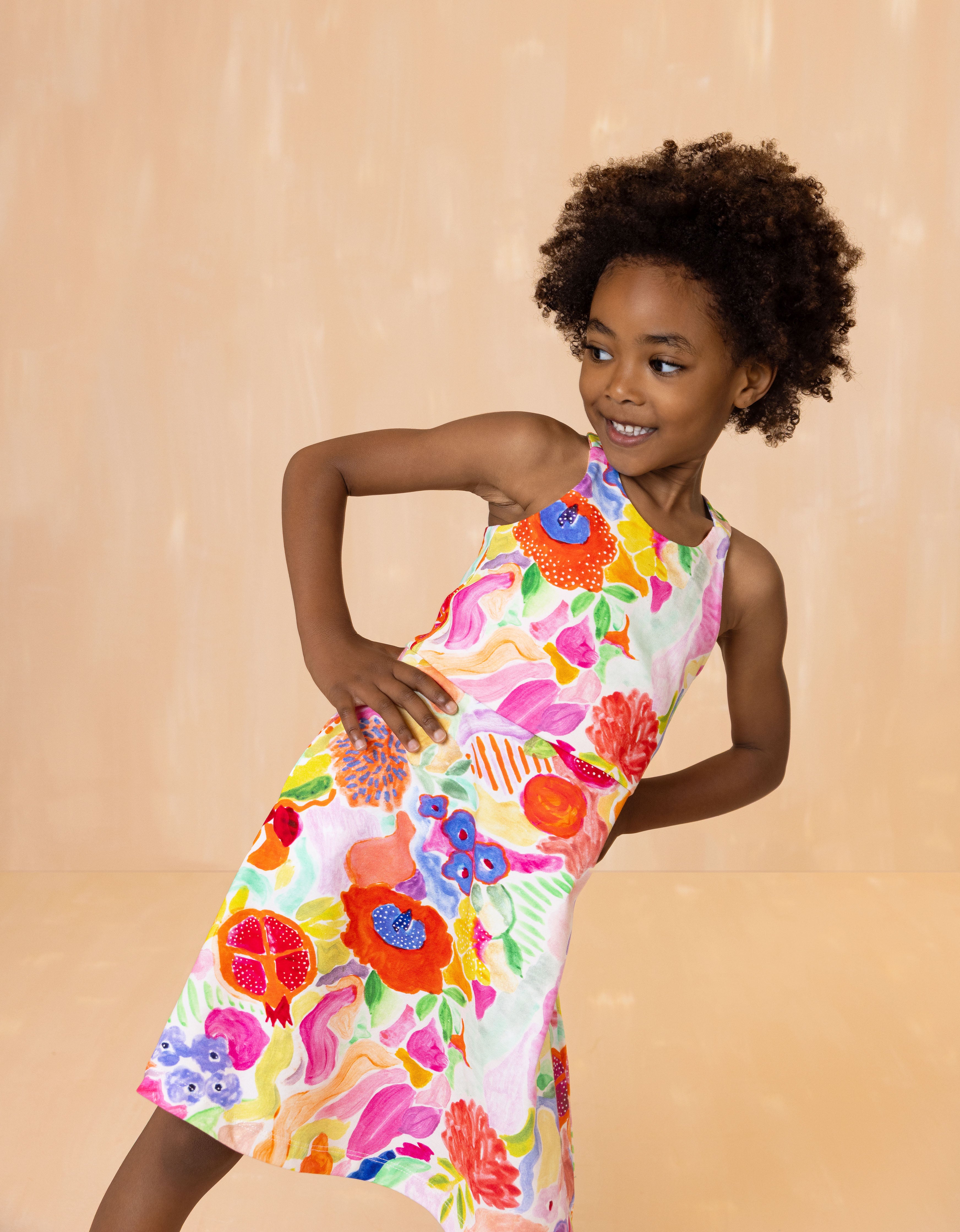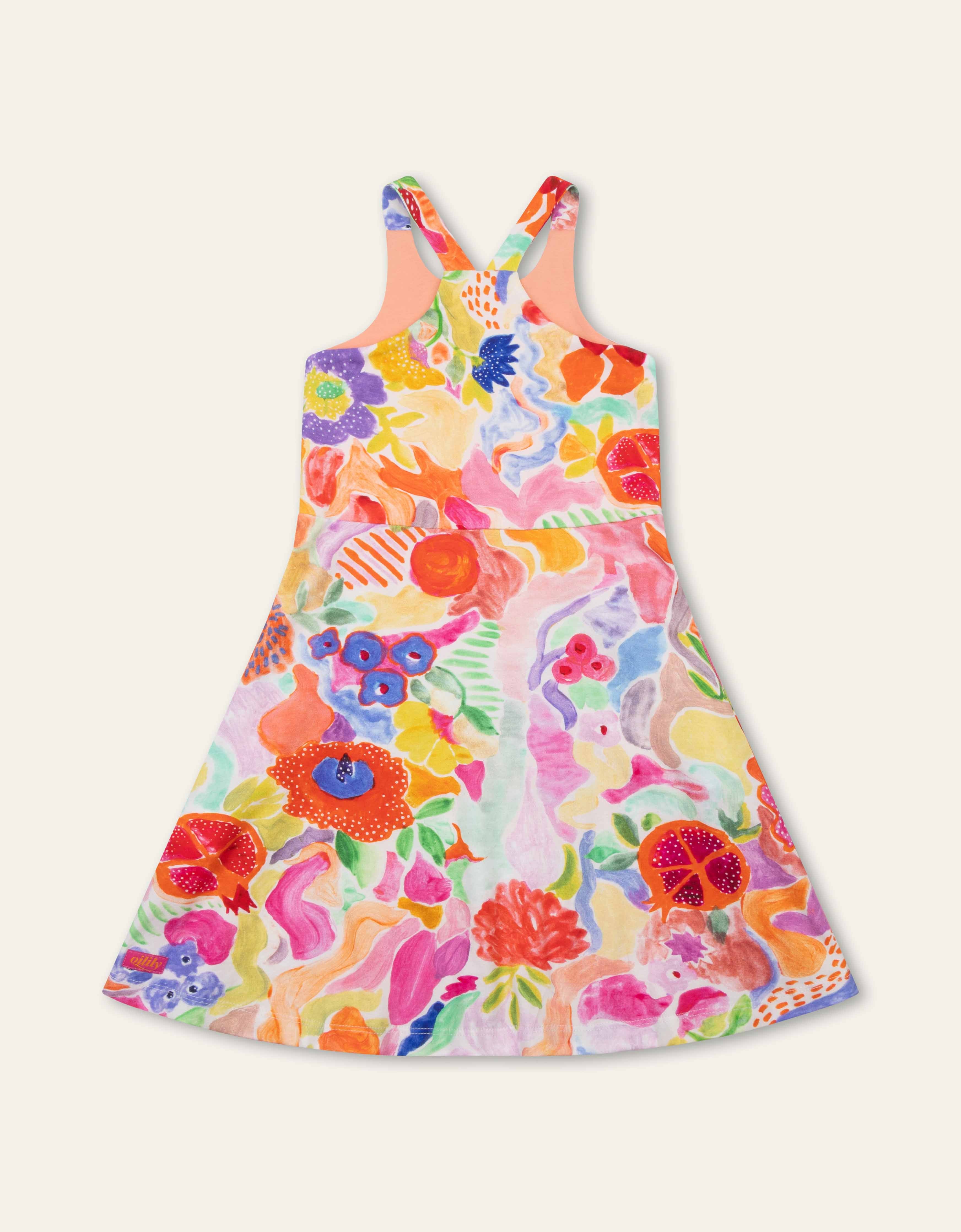 Met verf doodlen we vrolijk gekleurde bloemen en sierappeltjes voor de print Ananya. Dit hoogzomer jurkje is gemaakt van heerlijk zacht organisch katoen.