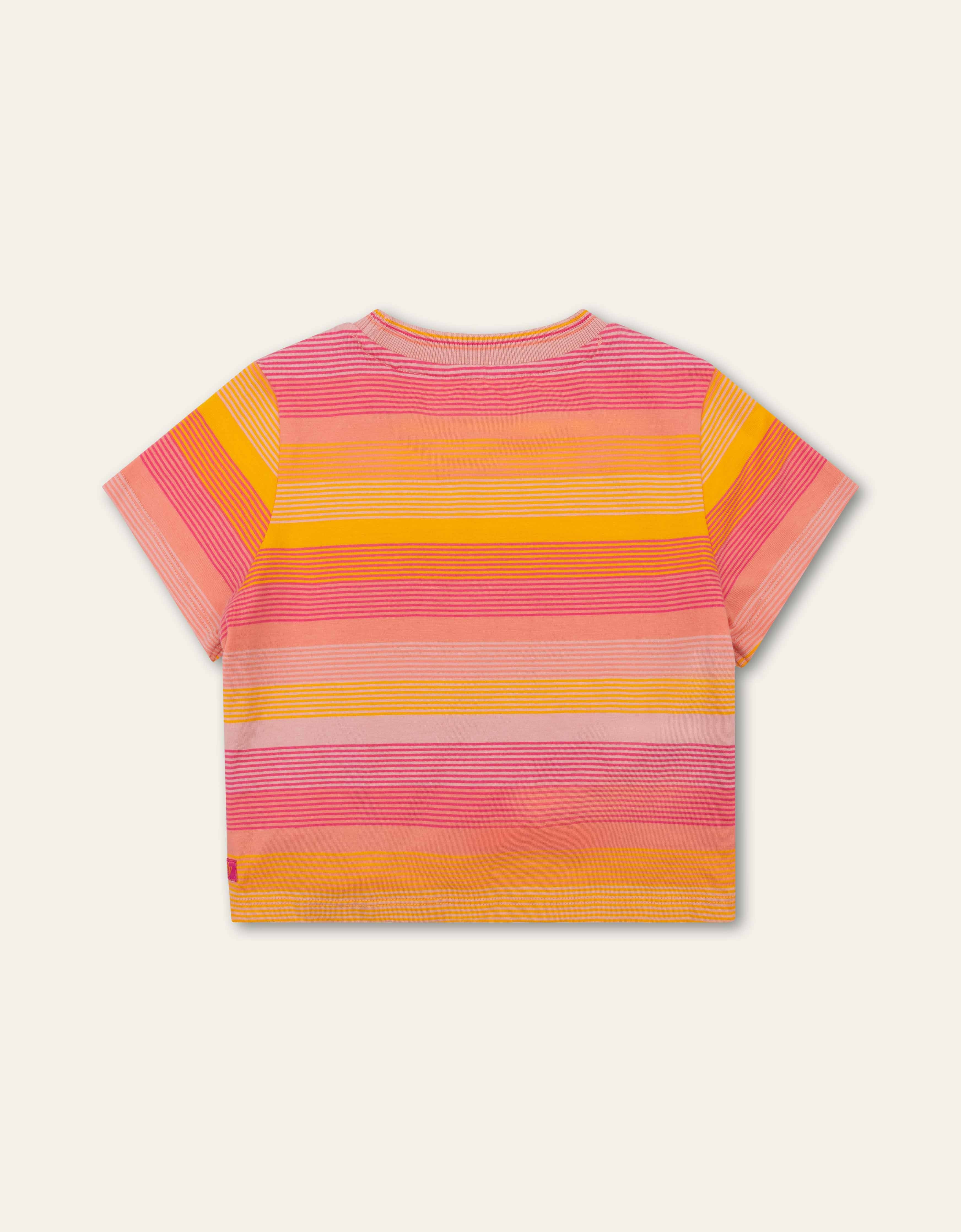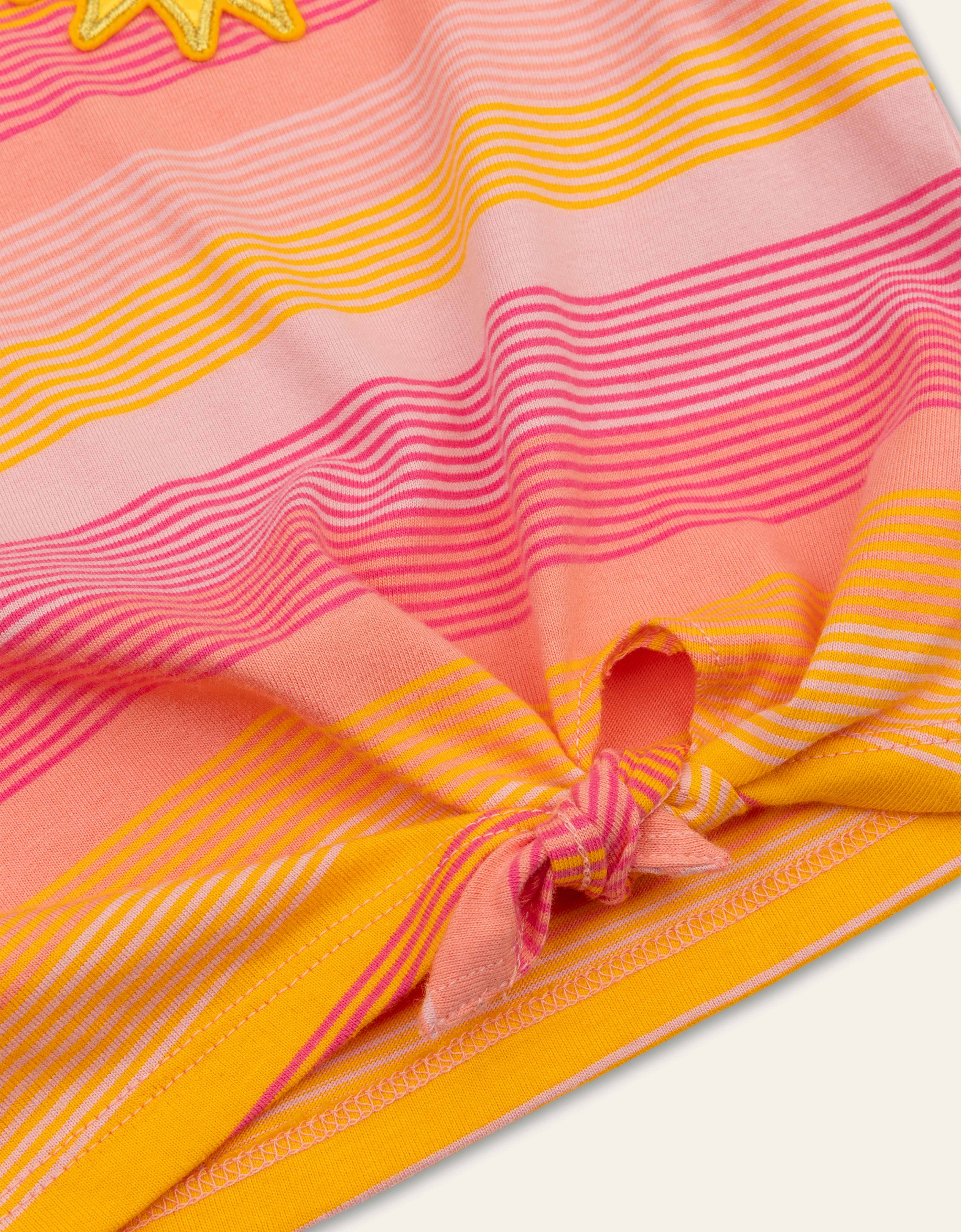 Zomers cropped t-shirt met knot. De yarn-dyed streep in roze tinten is geïnspireerd op Jaipur, de Roze Stad van India – symbool van gastvrijheid en zonneschijn. Perfect voor zonnige dagen!