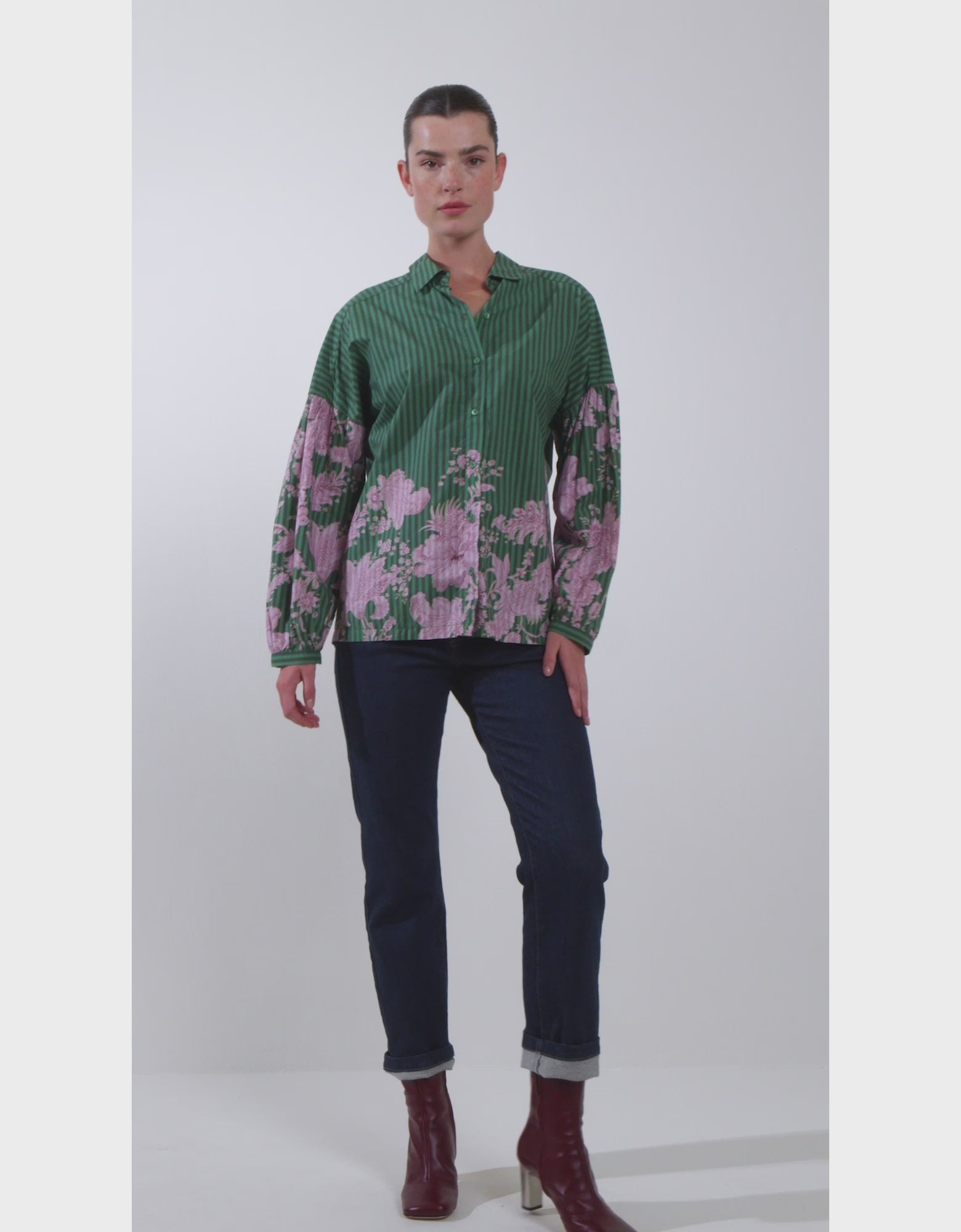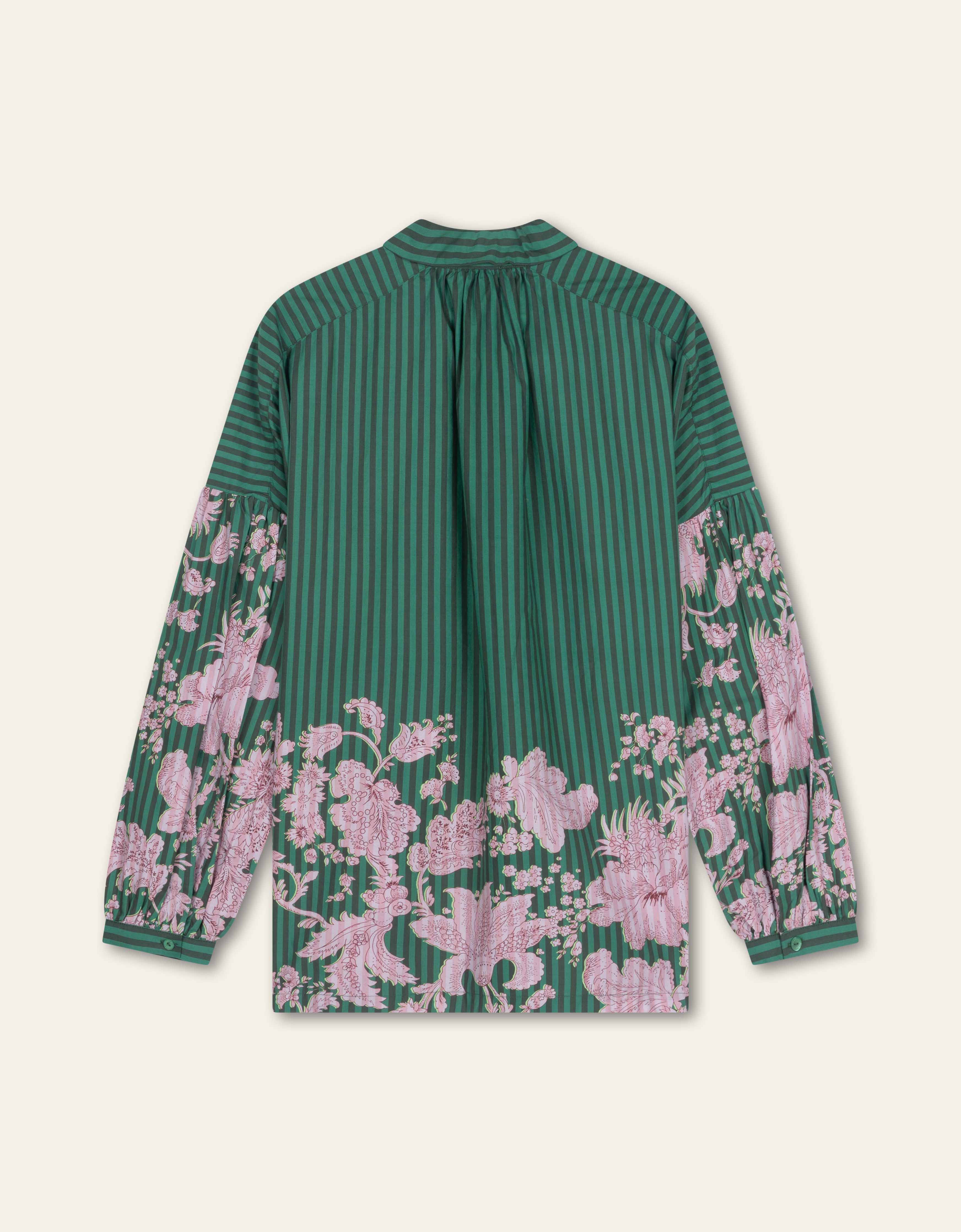 Deze roze-groene katoenen blouse combineert kleuren en vormen op speelse wijze. De grote Sits bloemen en strepen komen samen, waarbij de strepen transparant over de bloemen heen lopen. De smalle plooien geven de mouwen veel volume.