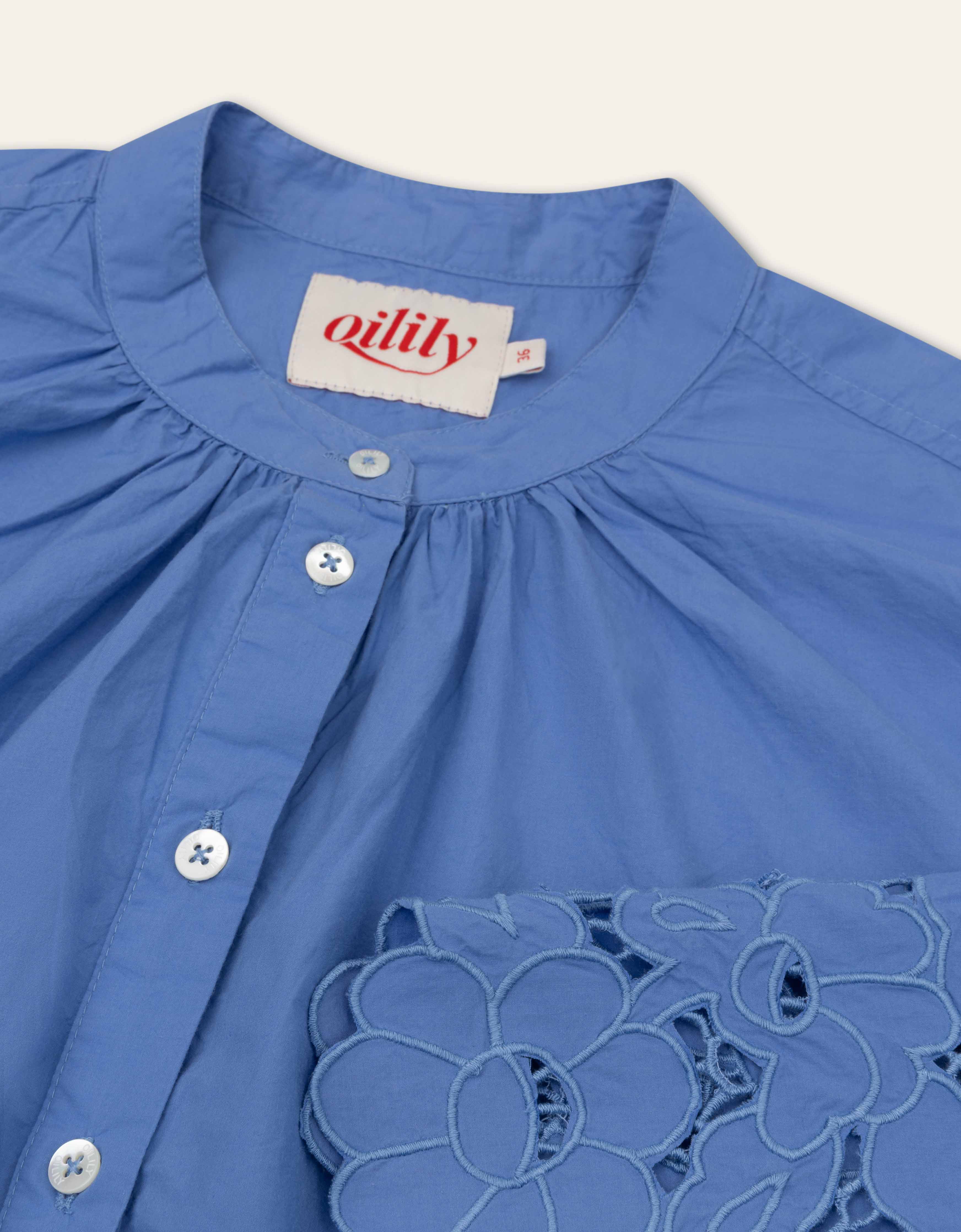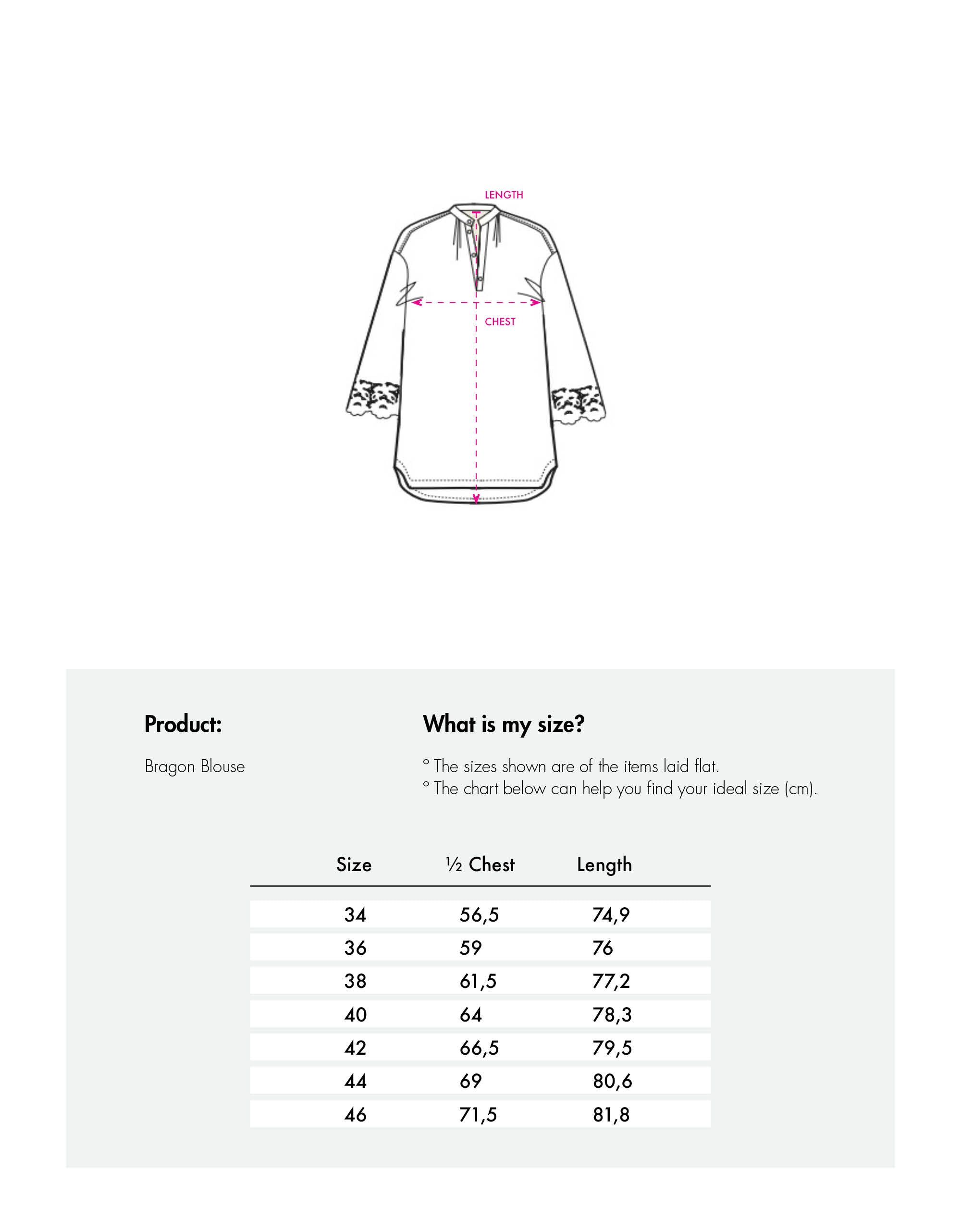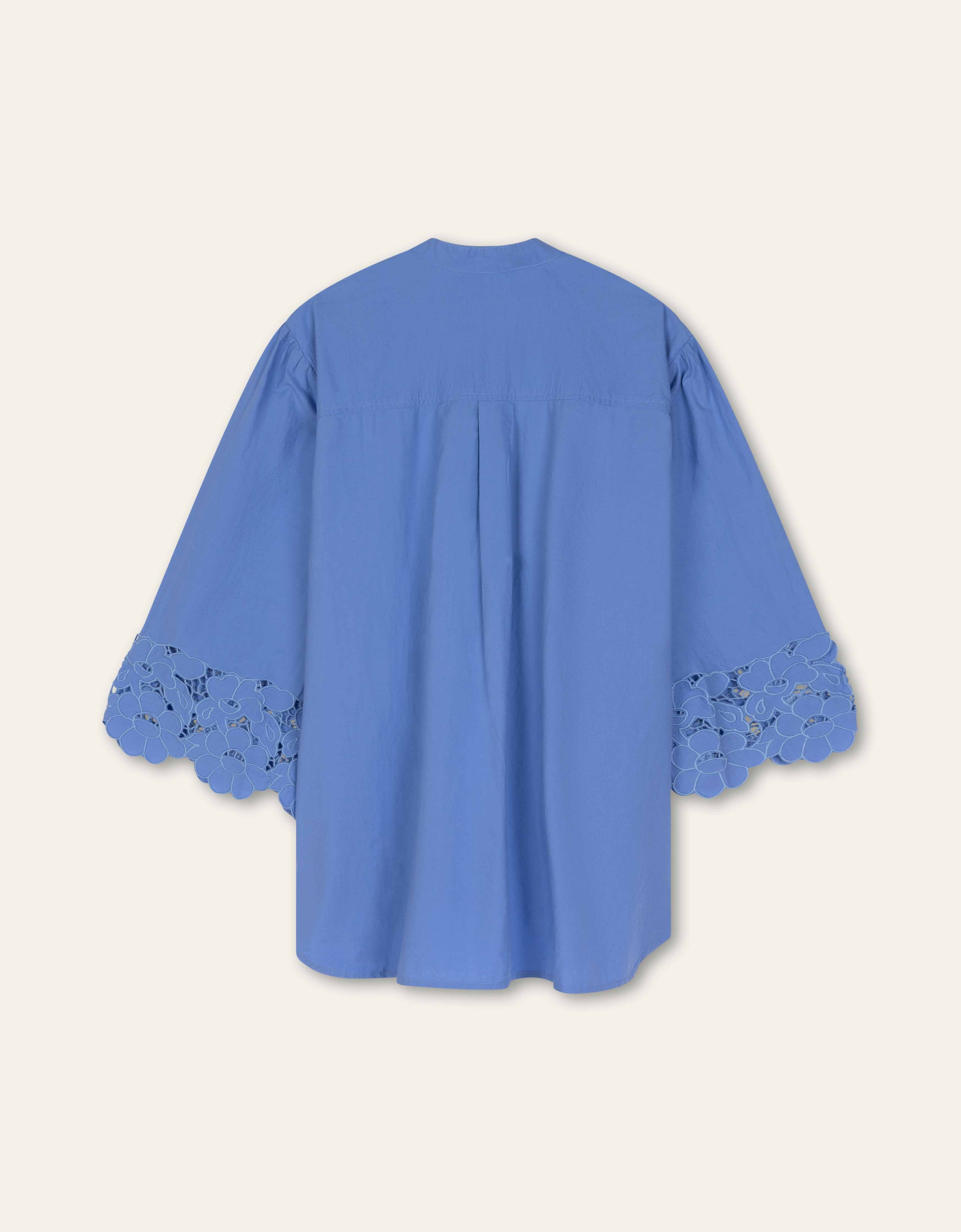 Deze blouse is heel speels met prachtige broderie anglaise details met deels opengewerkte bloemen op de 7/8 mouwen en manchetten. Met parelmoeren knoopjes en een iets langere achterkant. Mooi, frivool en op en top zomers.