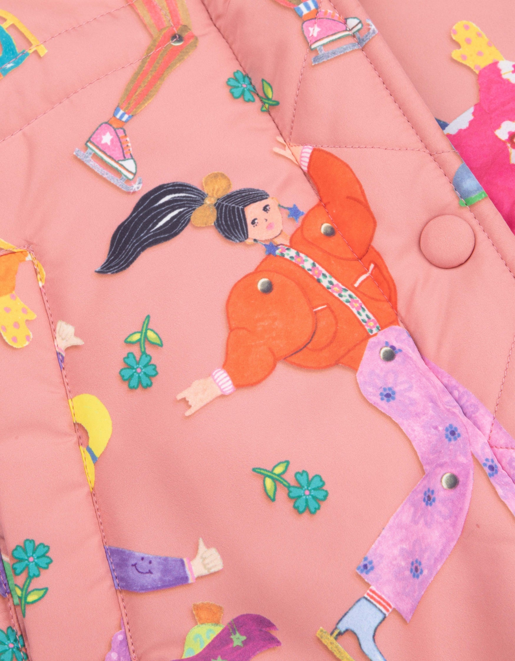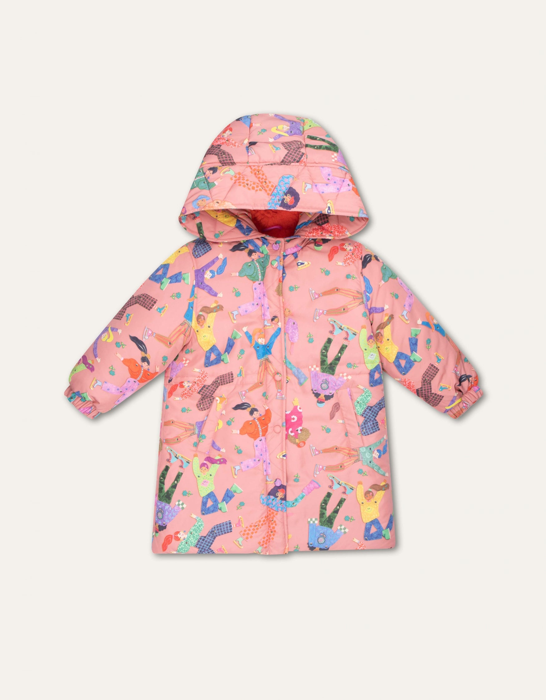De vrolijke, rond schaatsende meisjes gaan overal met je mee naartoe. Ze shinen in het Skatehop dessin dat een feestje is op deze winterjas. Geheel gemaakt van gerecyclede materialen, zo ook het zachte fake fur in de capuchon en voering.