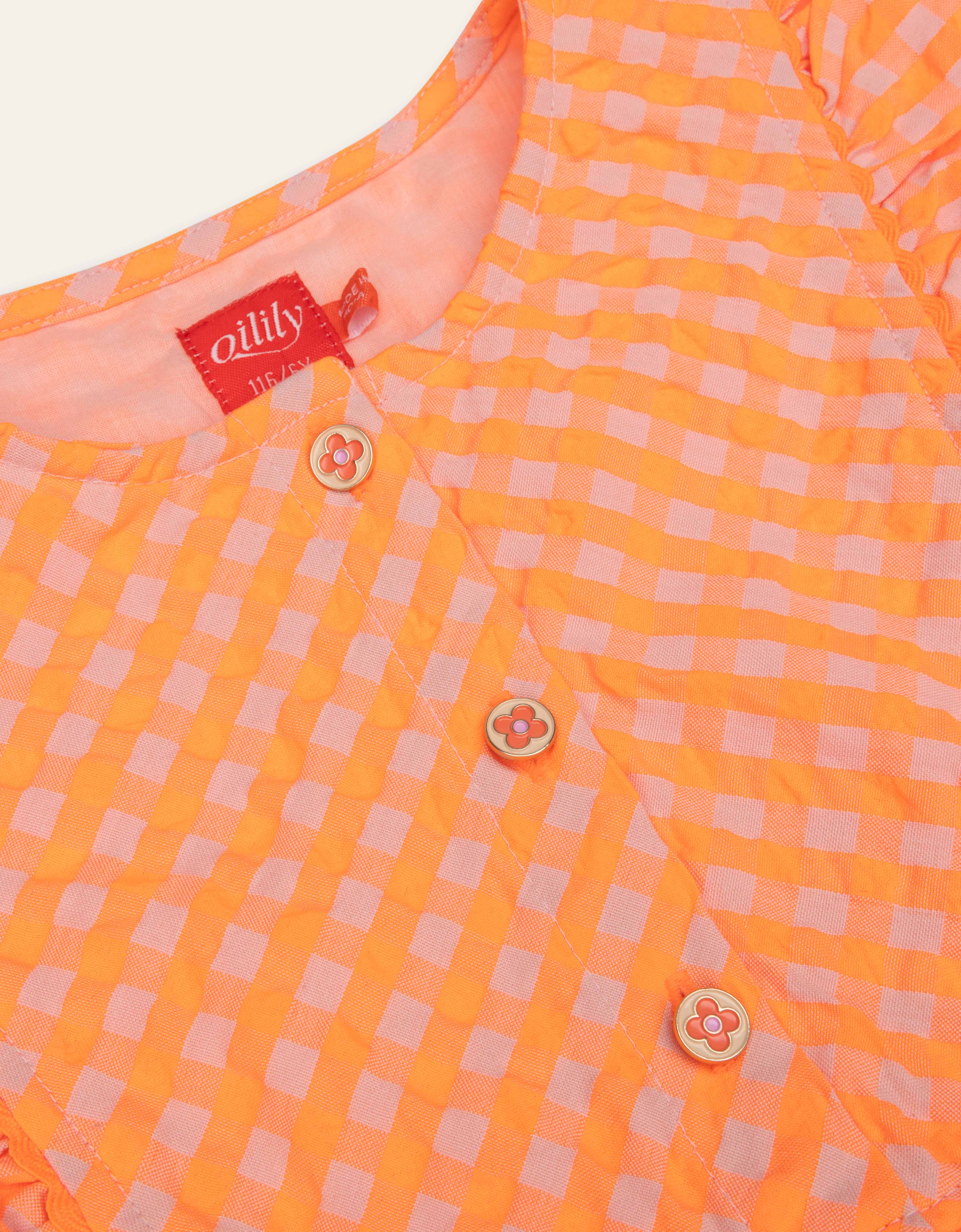 - oranje. Je bent een bundeltje vrolijkheid in deze heerlijke mouwloze jurk met ruches en emaille knopen.