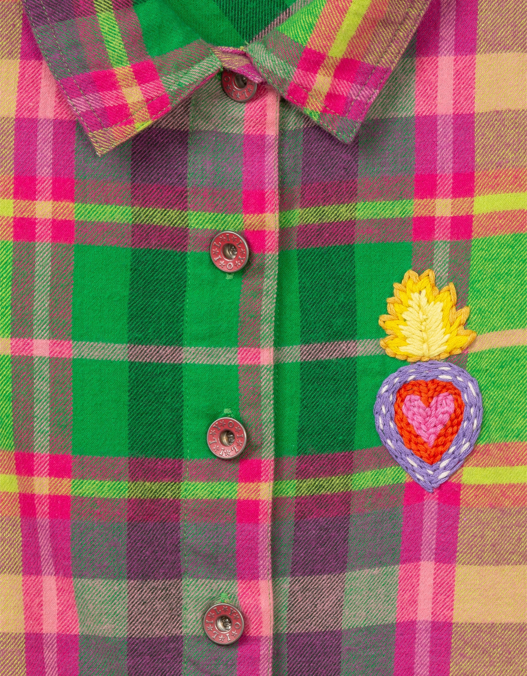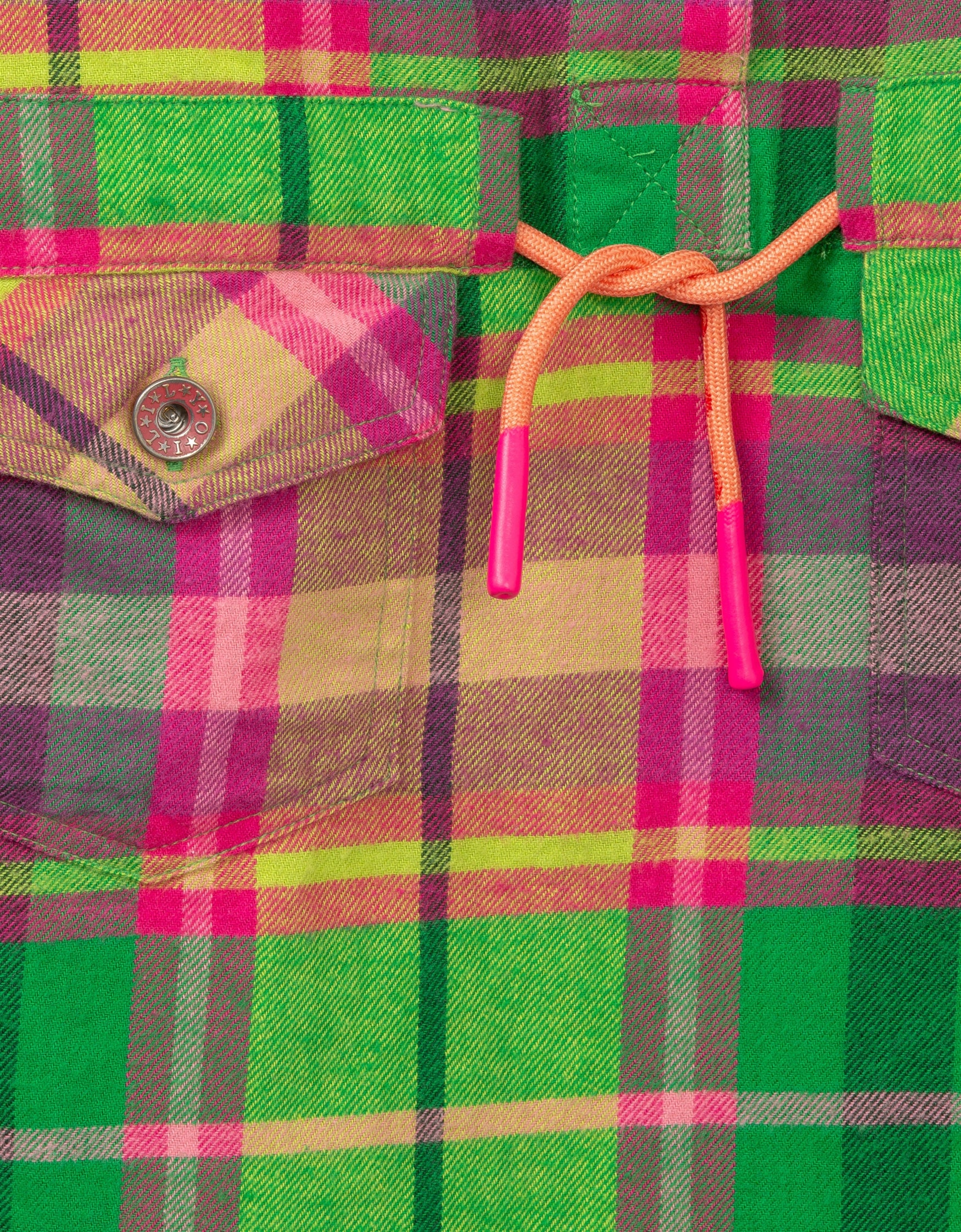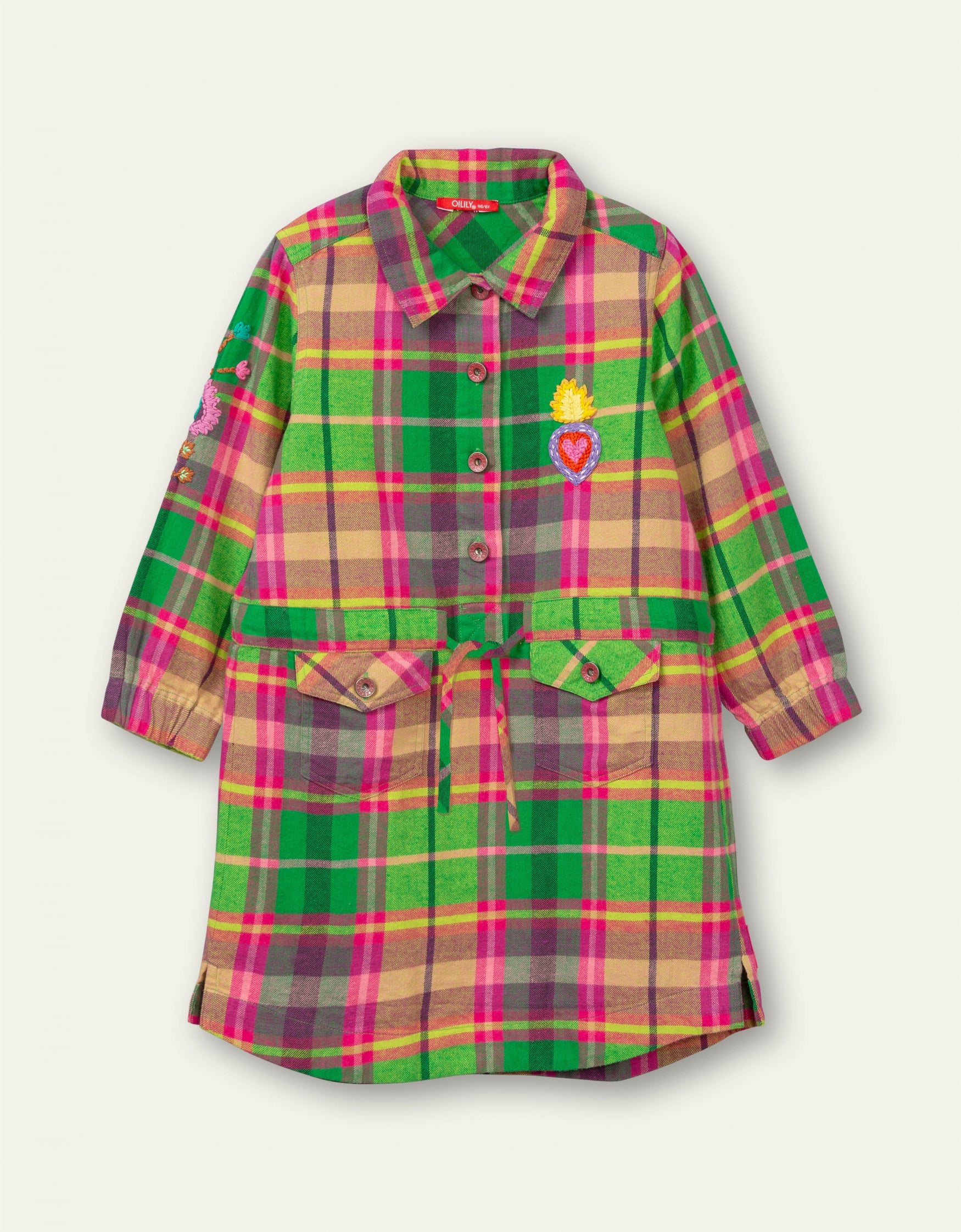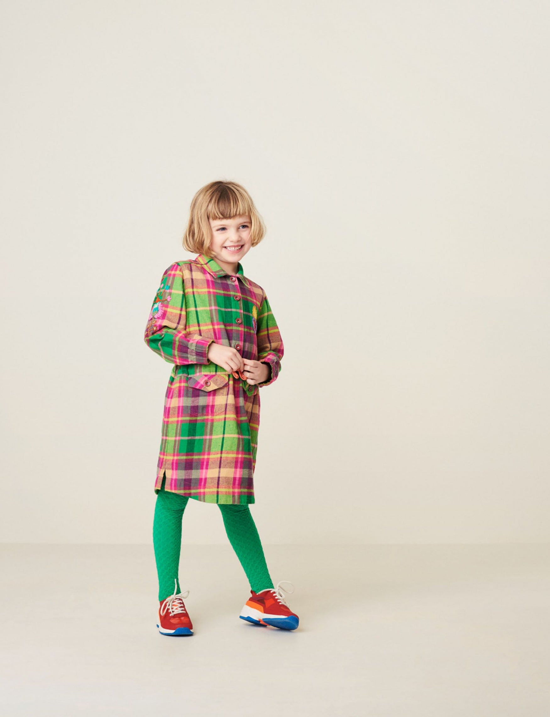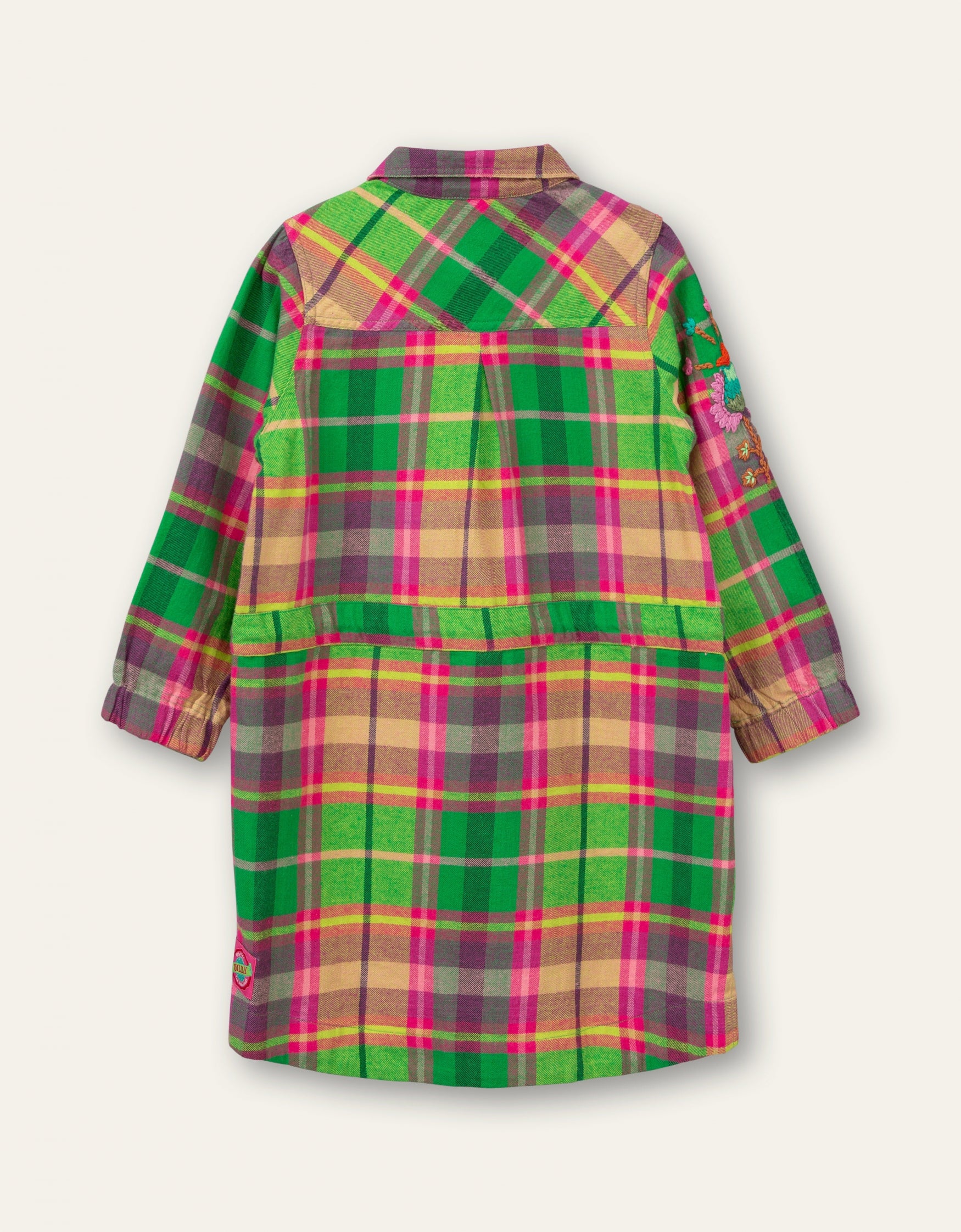 Je bent een beetje cowgirl meets flowergirl in dit zachte jurkje. Flanellen ruitjes in vrolijke kleuren met speelse handgeborduurde bloemen-details. Twee zakken aan de voorkant, met stoere knopen en een drawstring in je taille. - 100% Katoen - Relaxed fit - Ronde zoom - Elastiek bij de mouwen