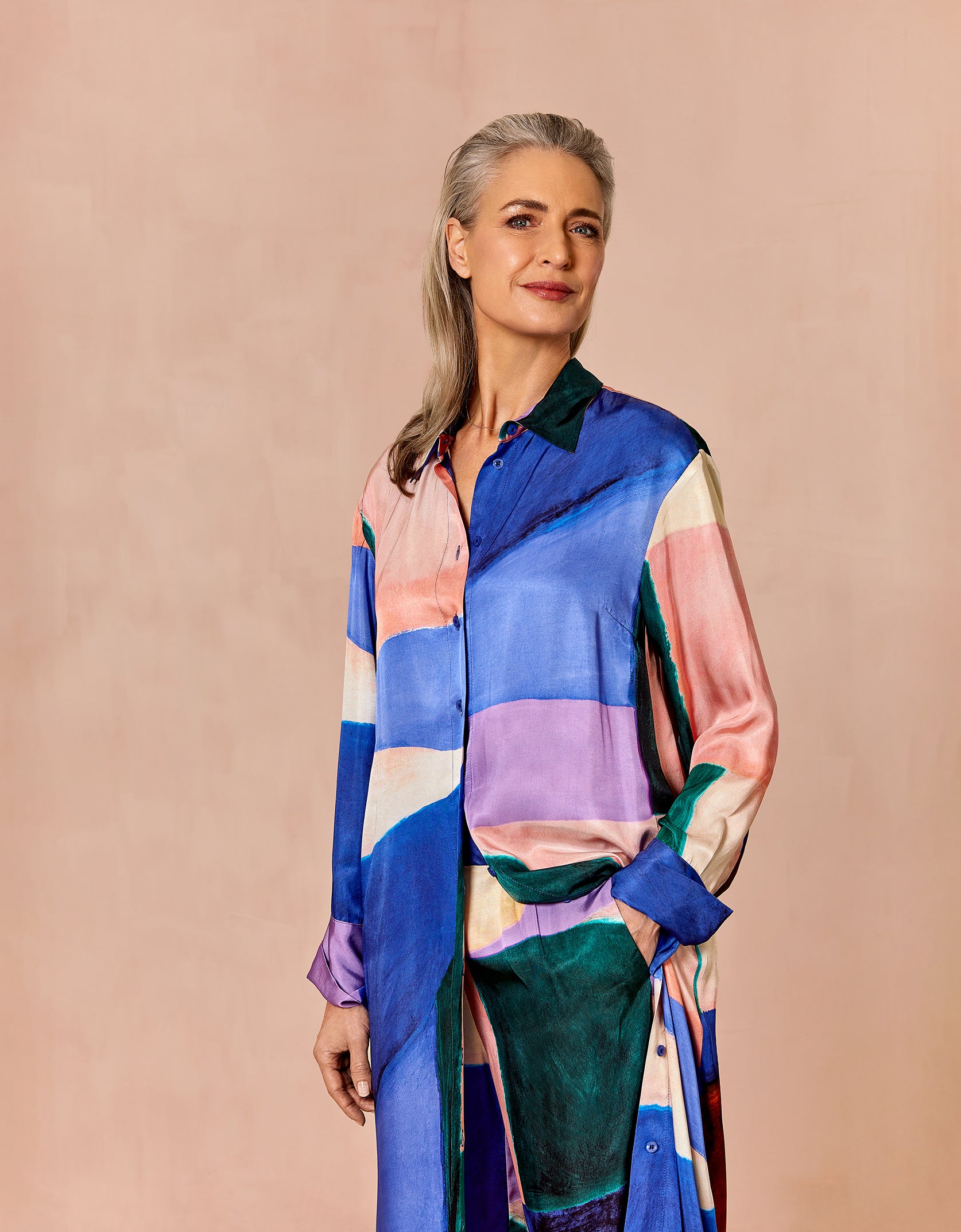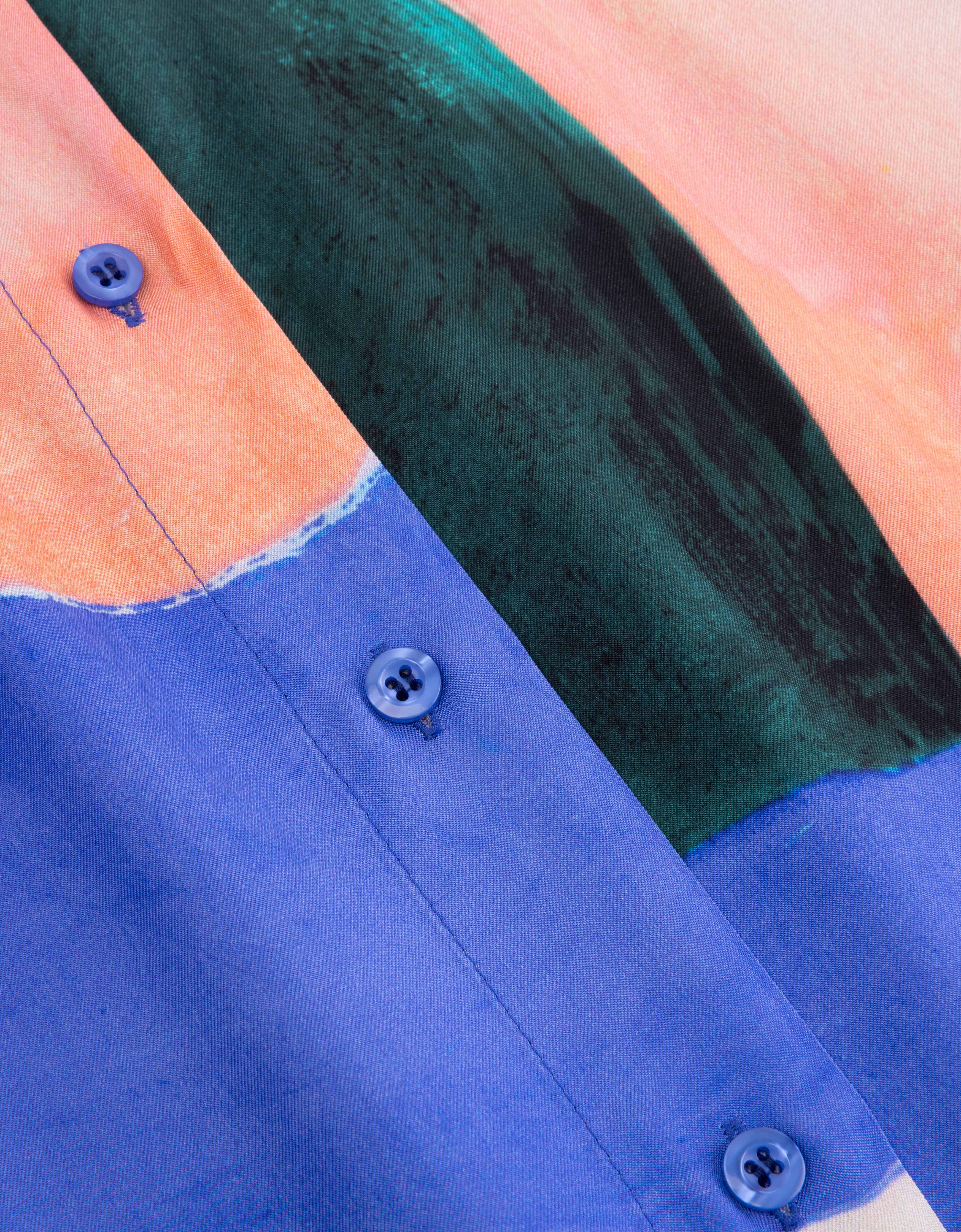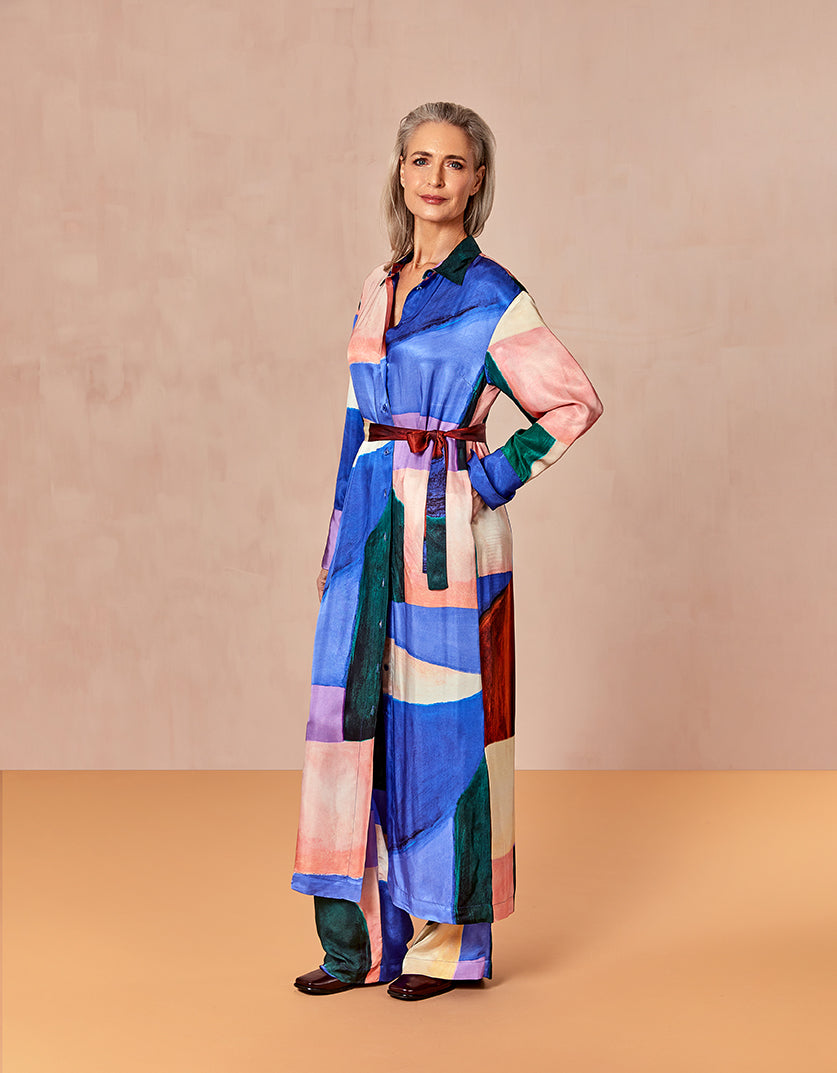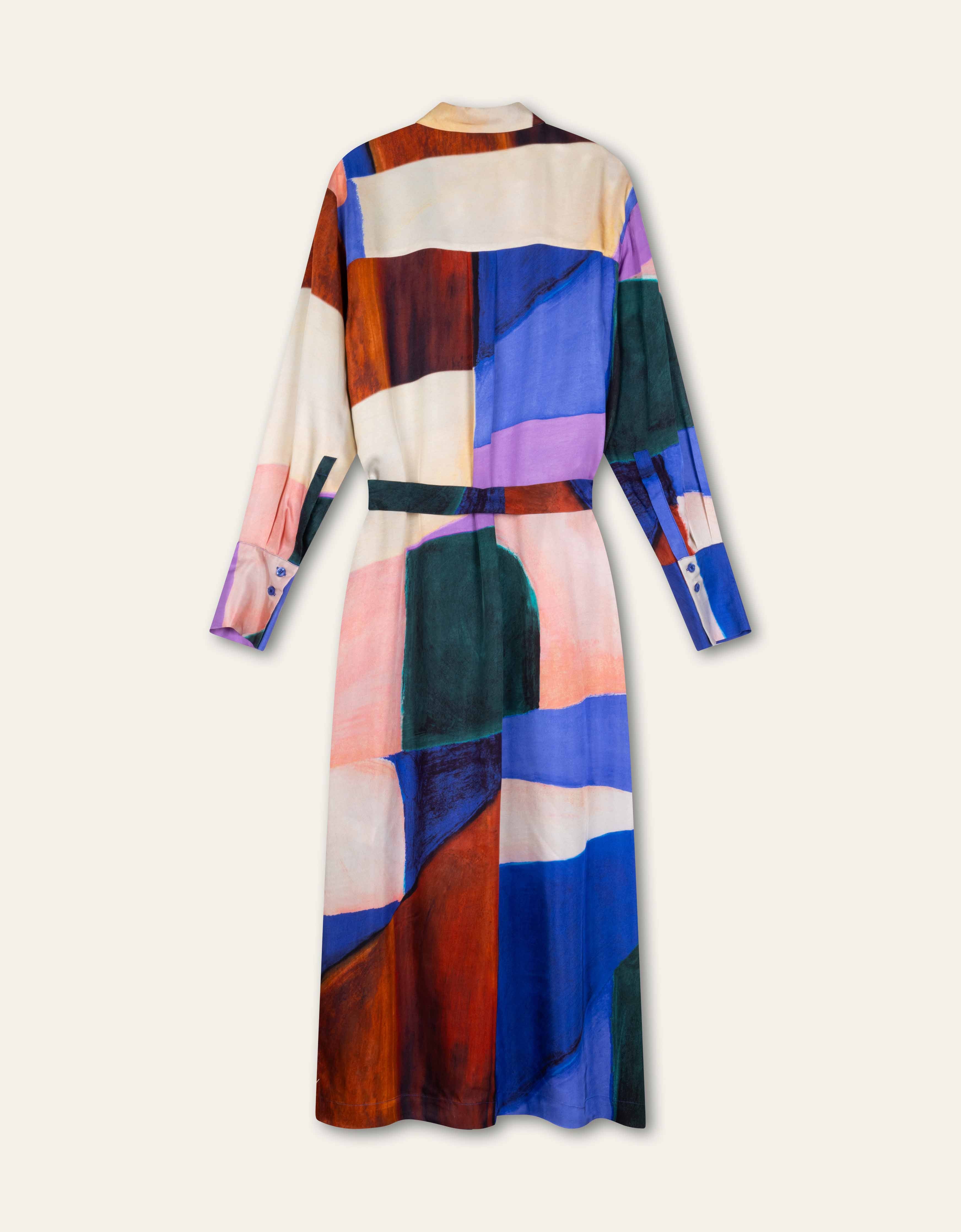 Midi lange doorknoopjurk met een subtiele glans in de prachtige, met de hand geschilderde print Hueland Hues met grote abstracte vormen. Stijl de jurk zoals je wilt met de matching ceintuur.