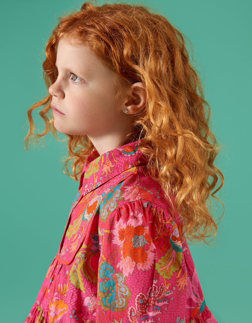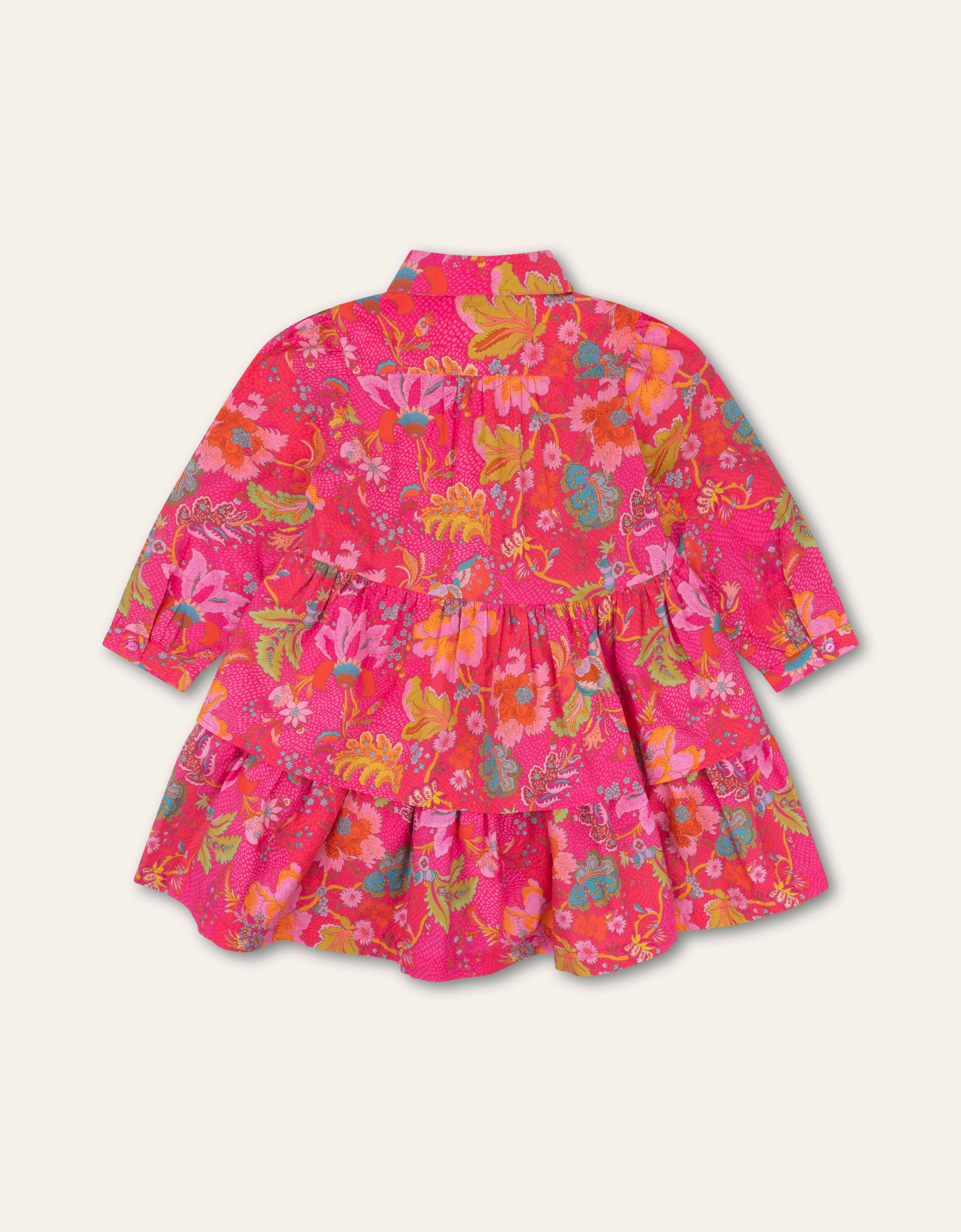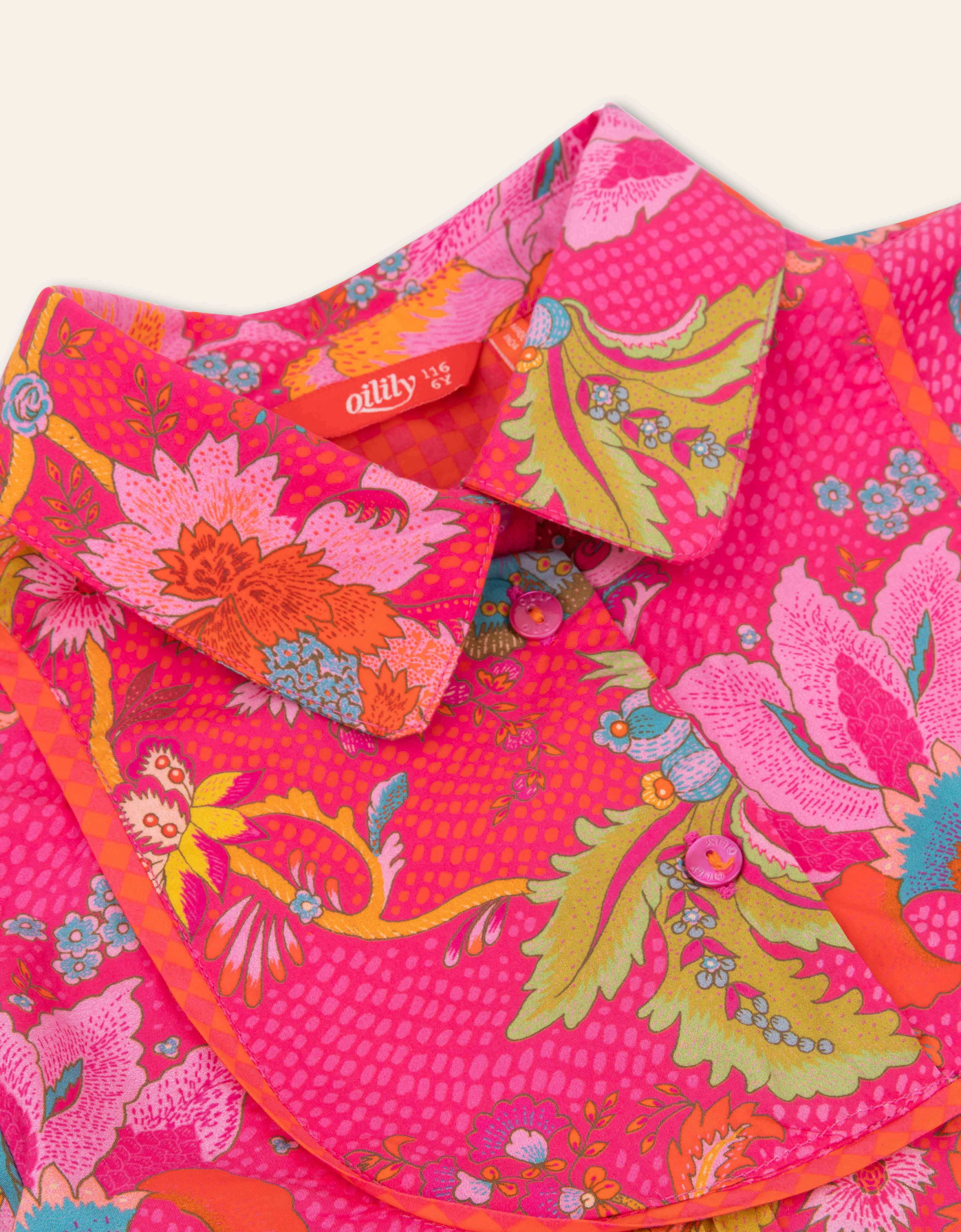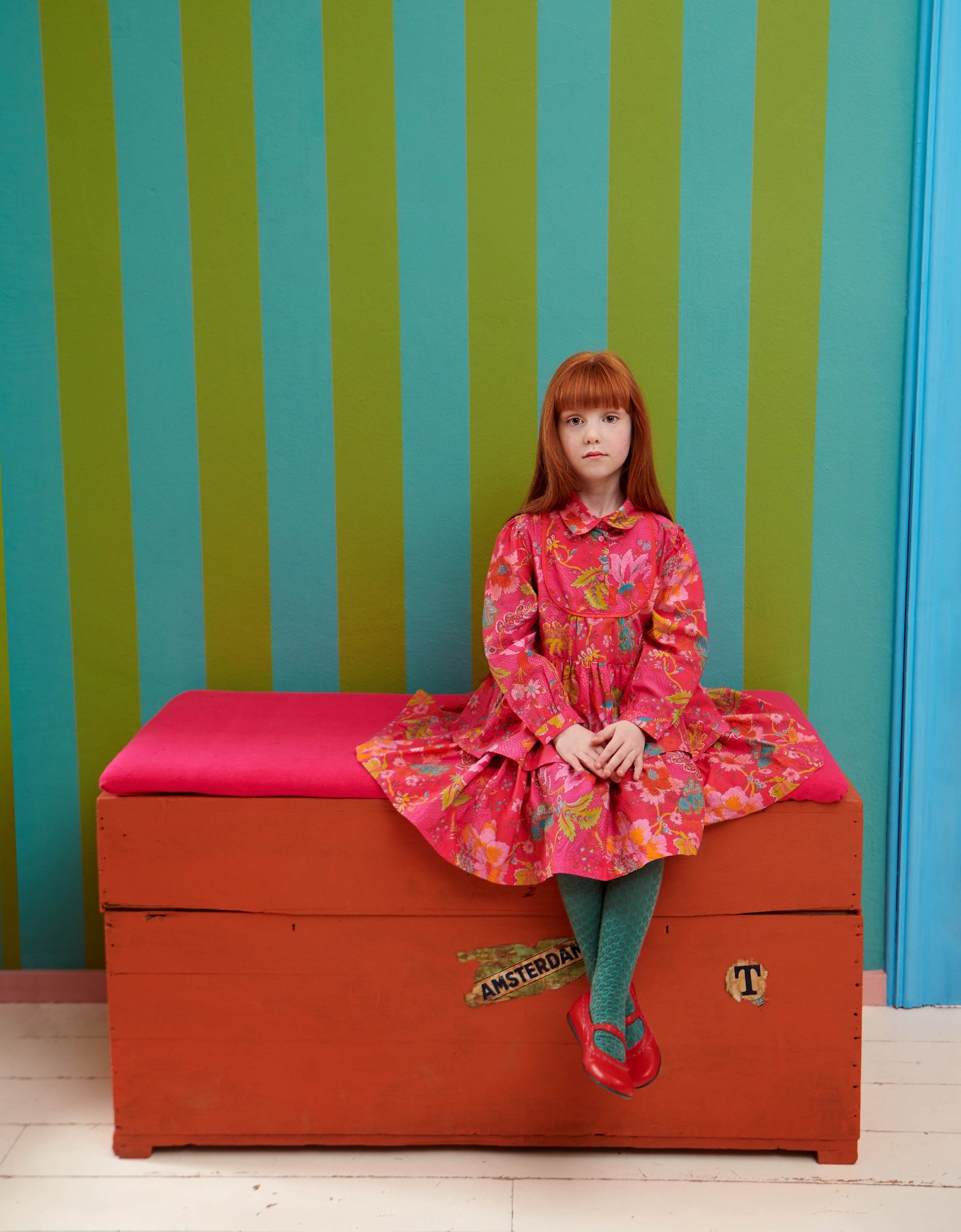 Dit jurkje is een model uit de Oilily archieven en hebben we vernoemd naar de ontwerpster van toen, Dorothee. Het jurkje heeft een tweelaags rokje en het straalt door het vrolijke Saits dessin. Dit creëerden we van Sits bloemen die we op een tablet hebben getekend.