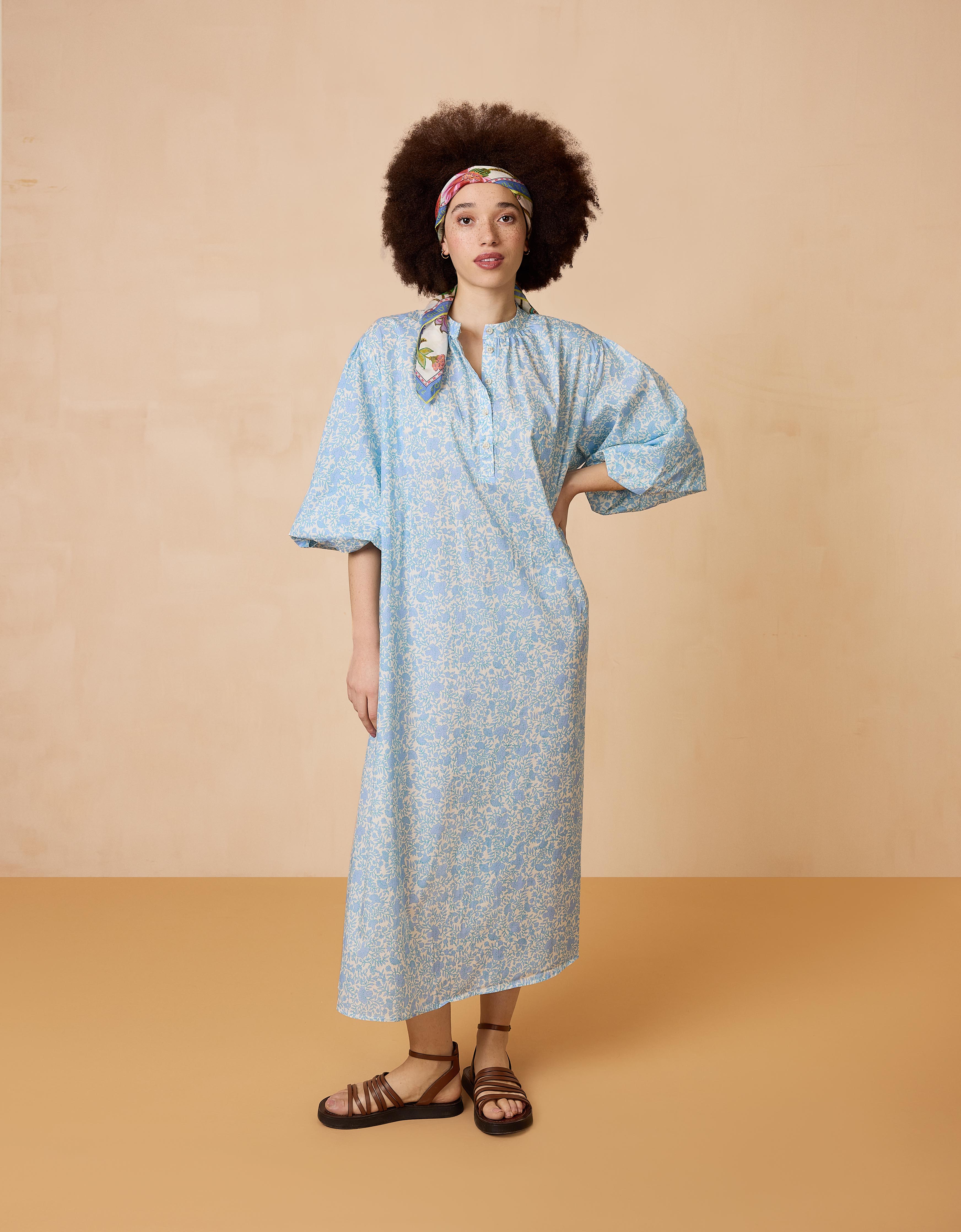 Het dessin Mientje met haar lieve bloemetjes geeft een vrolijke elegantie dat perfect past bij de losheid van deze jurk. De knoopjes van deze heerlijke jurk gaan tot de helft. De wijde fit met gathering bij de mouwen en langs de hals geven nog meer luchtigheid.