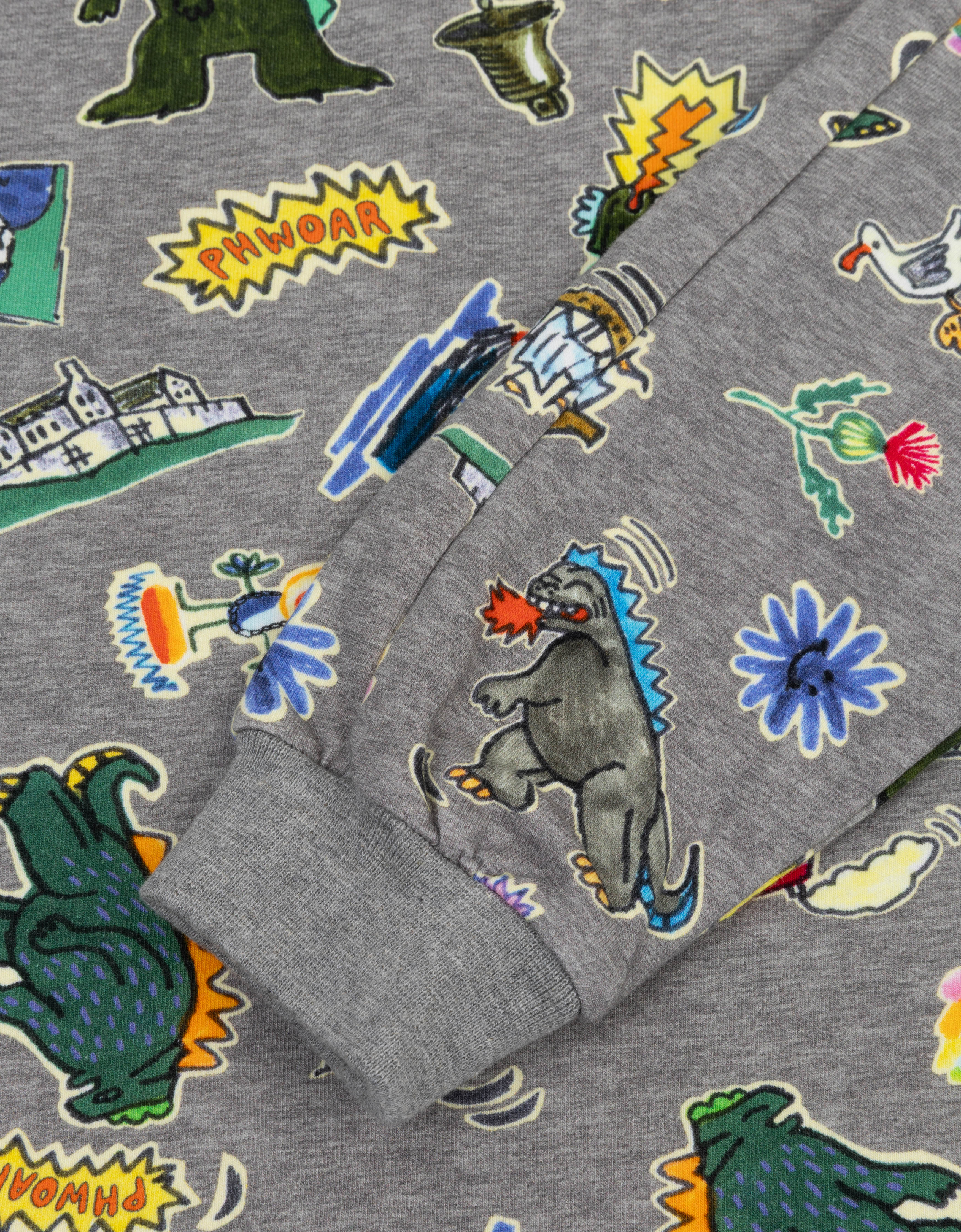 Geniet van print Salt Marsh Souls met de hand getekend met viltstiften en vol met zeelui, dieren en zeemonsters uit het oude Schokland en Schotland. Ontdek het allemaal op deze sweater.