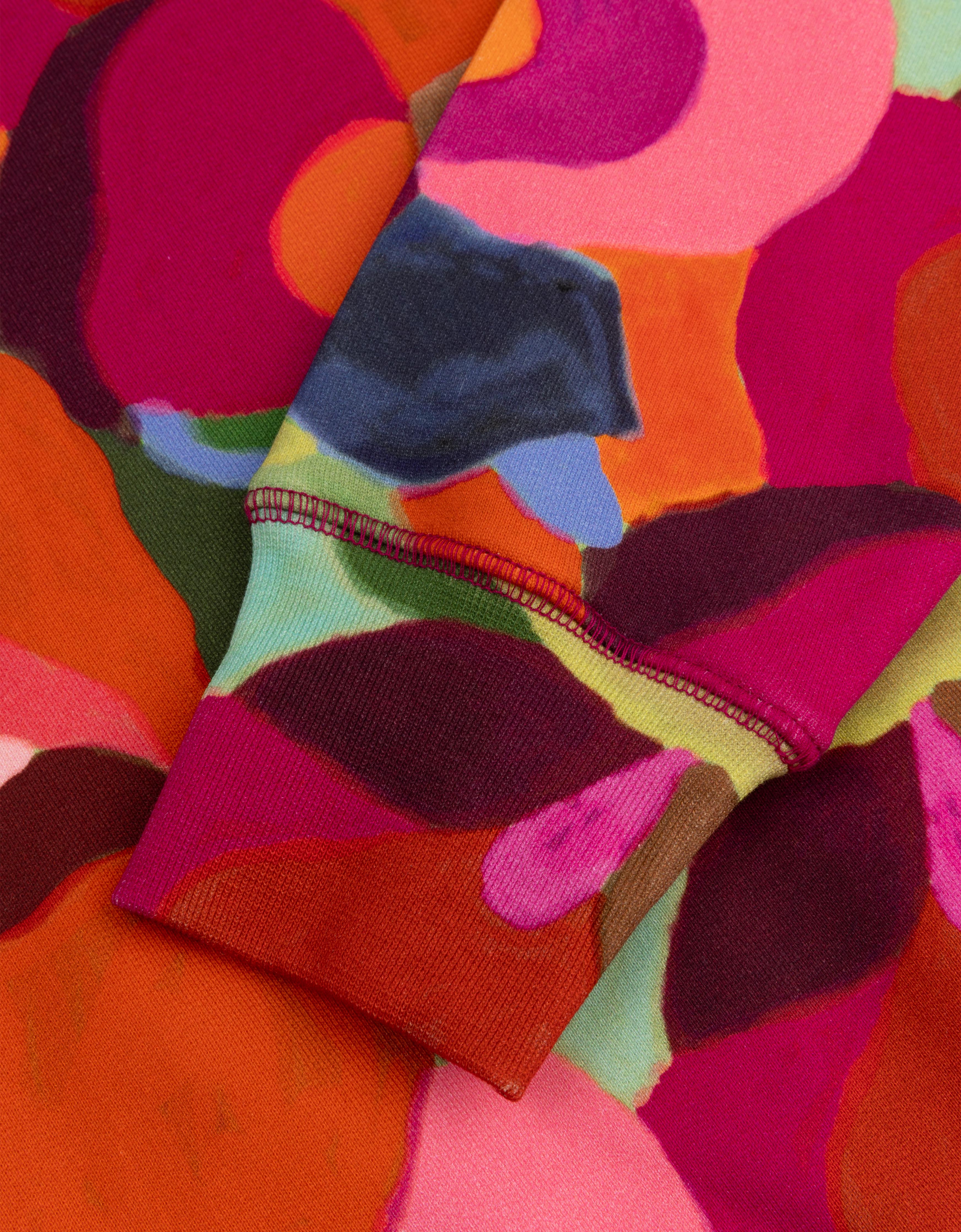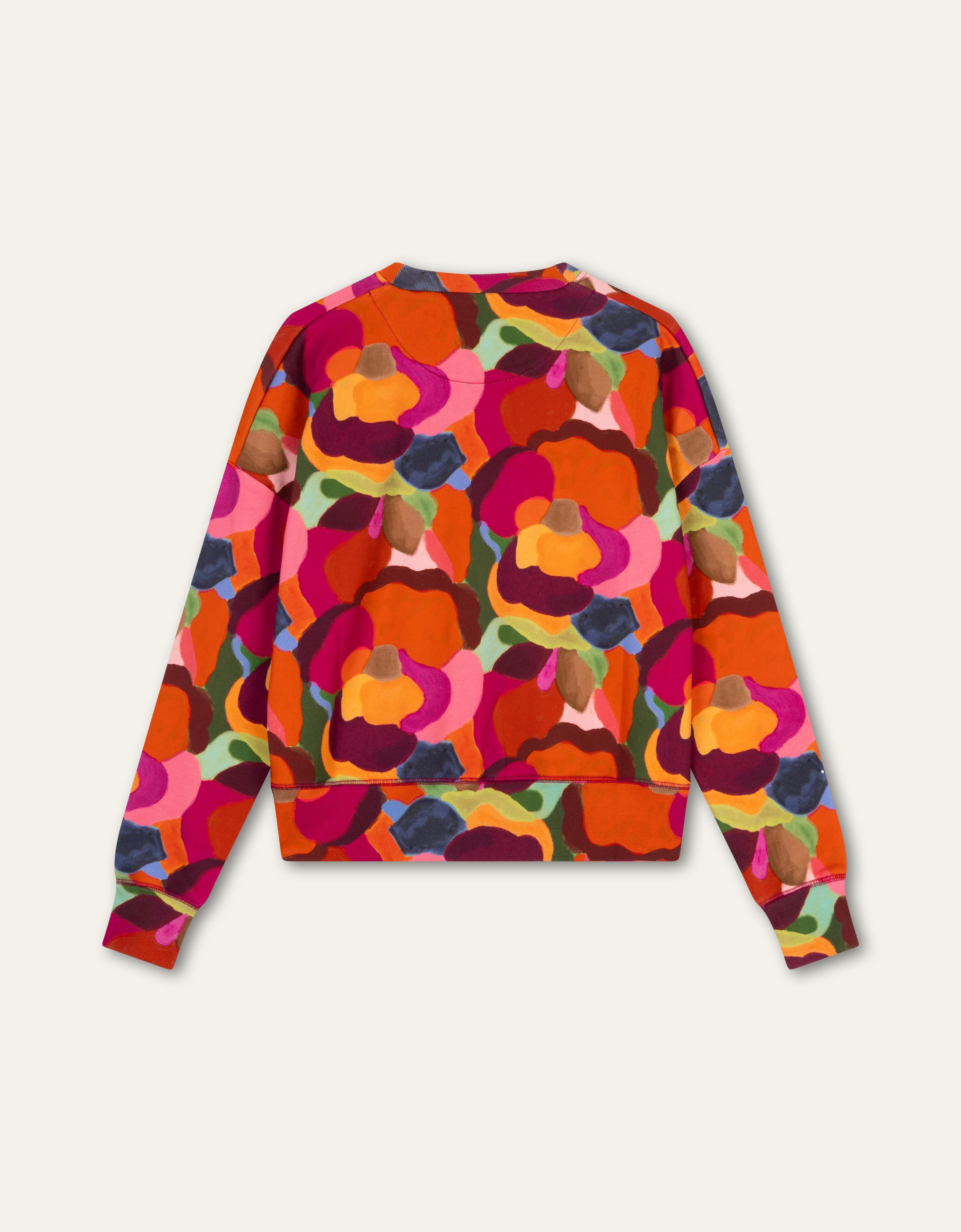 Oversized trui in warme kleuren en grote, organische vormen die elkaar overlappen en horen bij print Veerle.