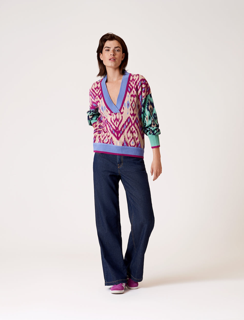 Speelse jacquard gebreide trui in Ikat-stijl. De ruime V-hals staat elegant. Deze trui is ware eye candy met contrasterende mouwen in vrolijke kleurrijke patronen.