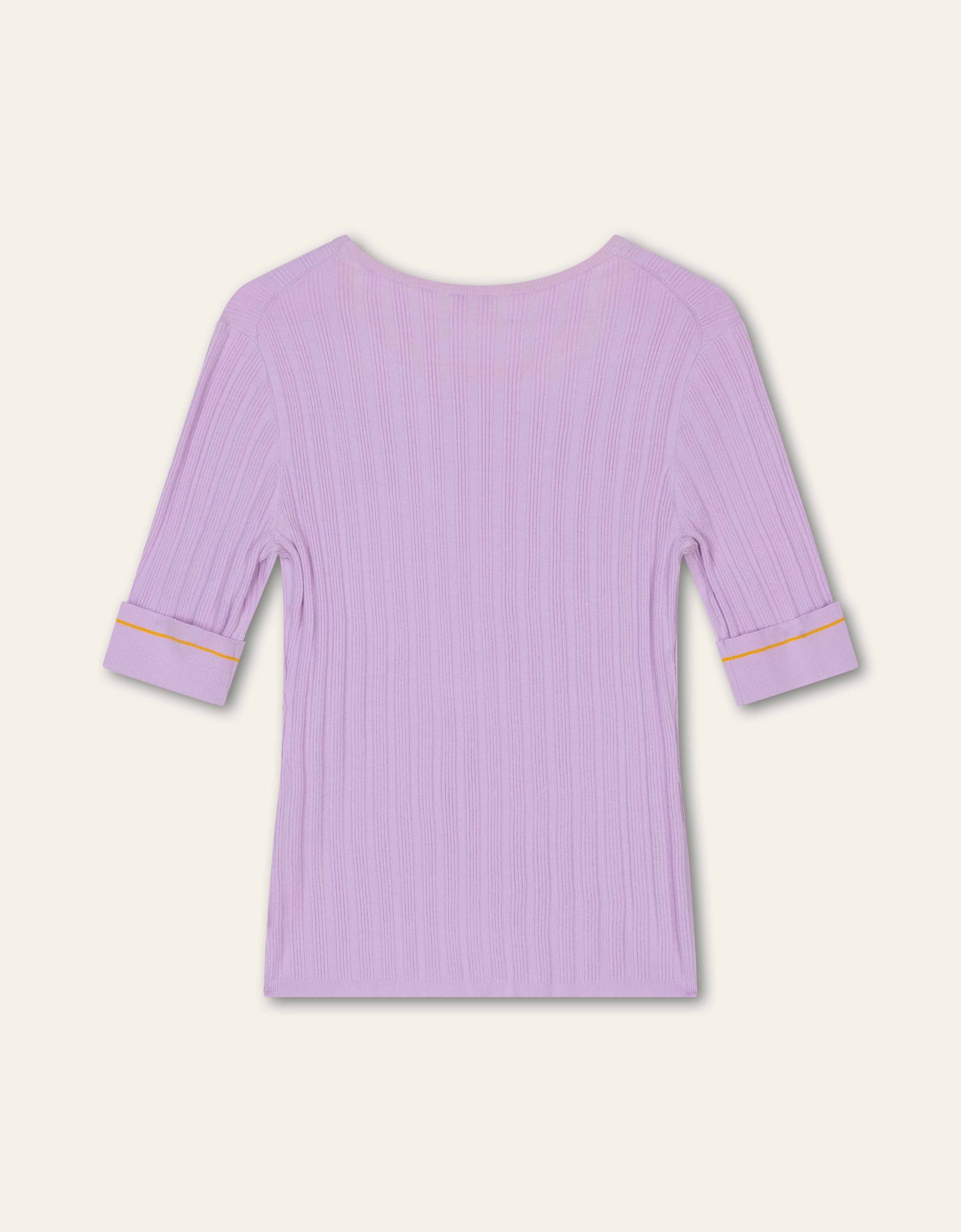 Slim fit truitje van stretchy Ecovero met elastan, perfect als layering piece maar ook mooi op zichzelf. De mouwen zijn omgeslagen met handstitch, zodat je de steekjes kunt loshalen. Delicaat ribstructuur geeft een subtiele textuur en een elegante uitstraling.