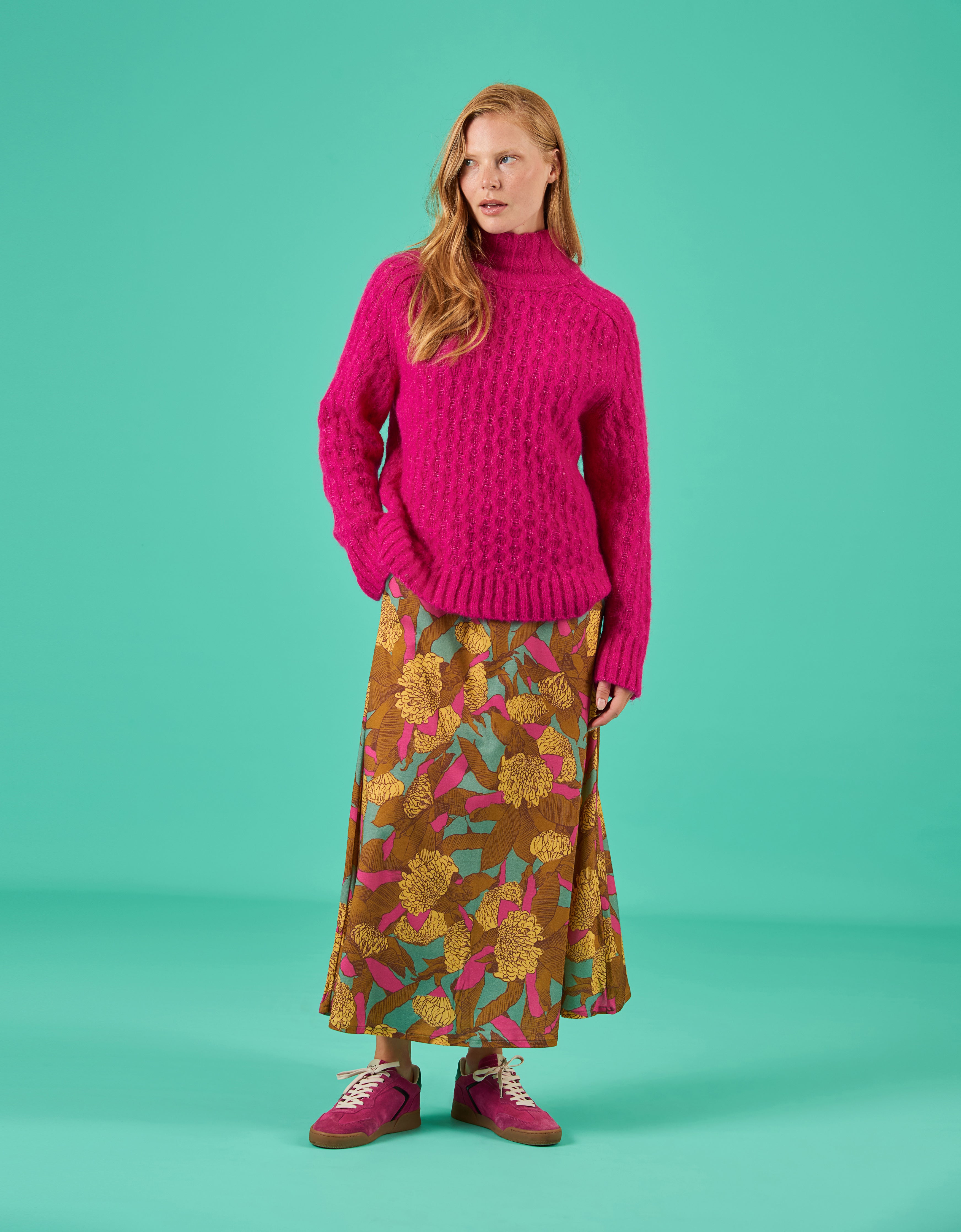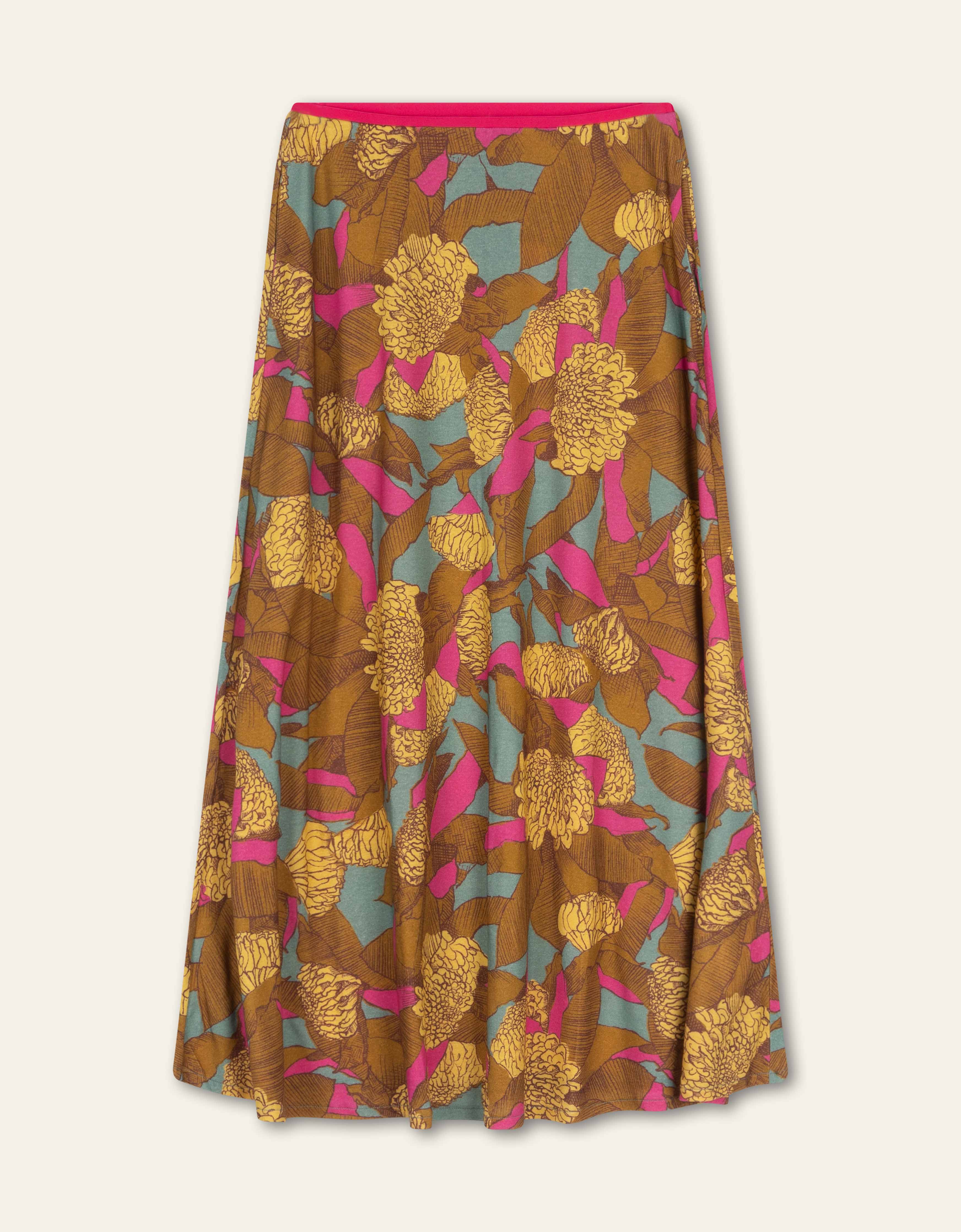 Op een tablet tekenden we chrysanten en blaadjes en dit werd het Coraline dessin. Het staat weelderig op deze zwierige rok die op de enkellengte valt.